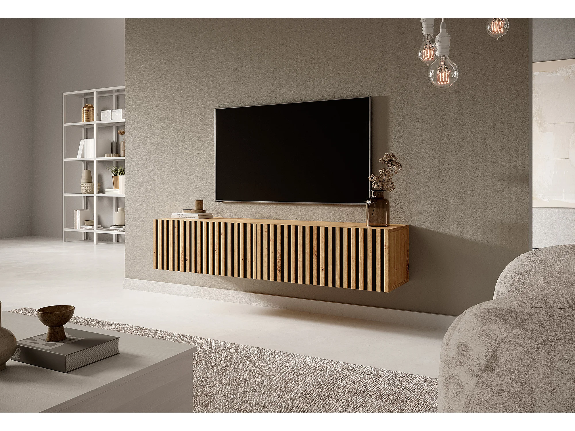 Meuble TV 140 cm - en chêne artisan avec façade fraisée et inserts noirs - TELIRE