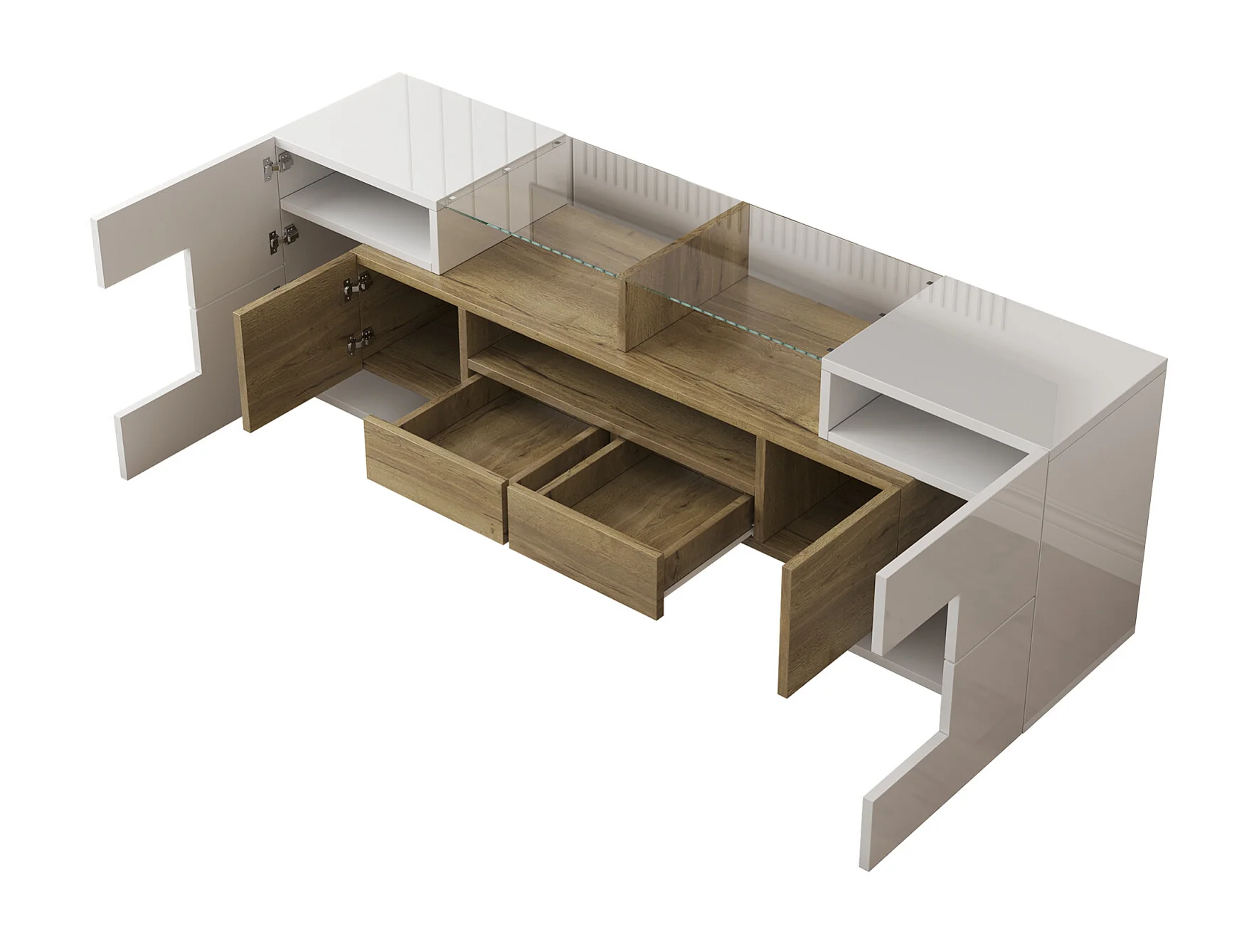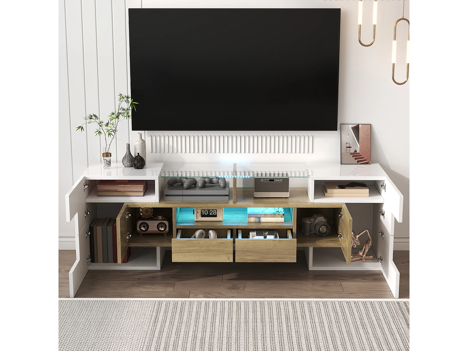 Meuble TV 145 cm, blanc brillant, éclairage LED, élégante surface en verre
