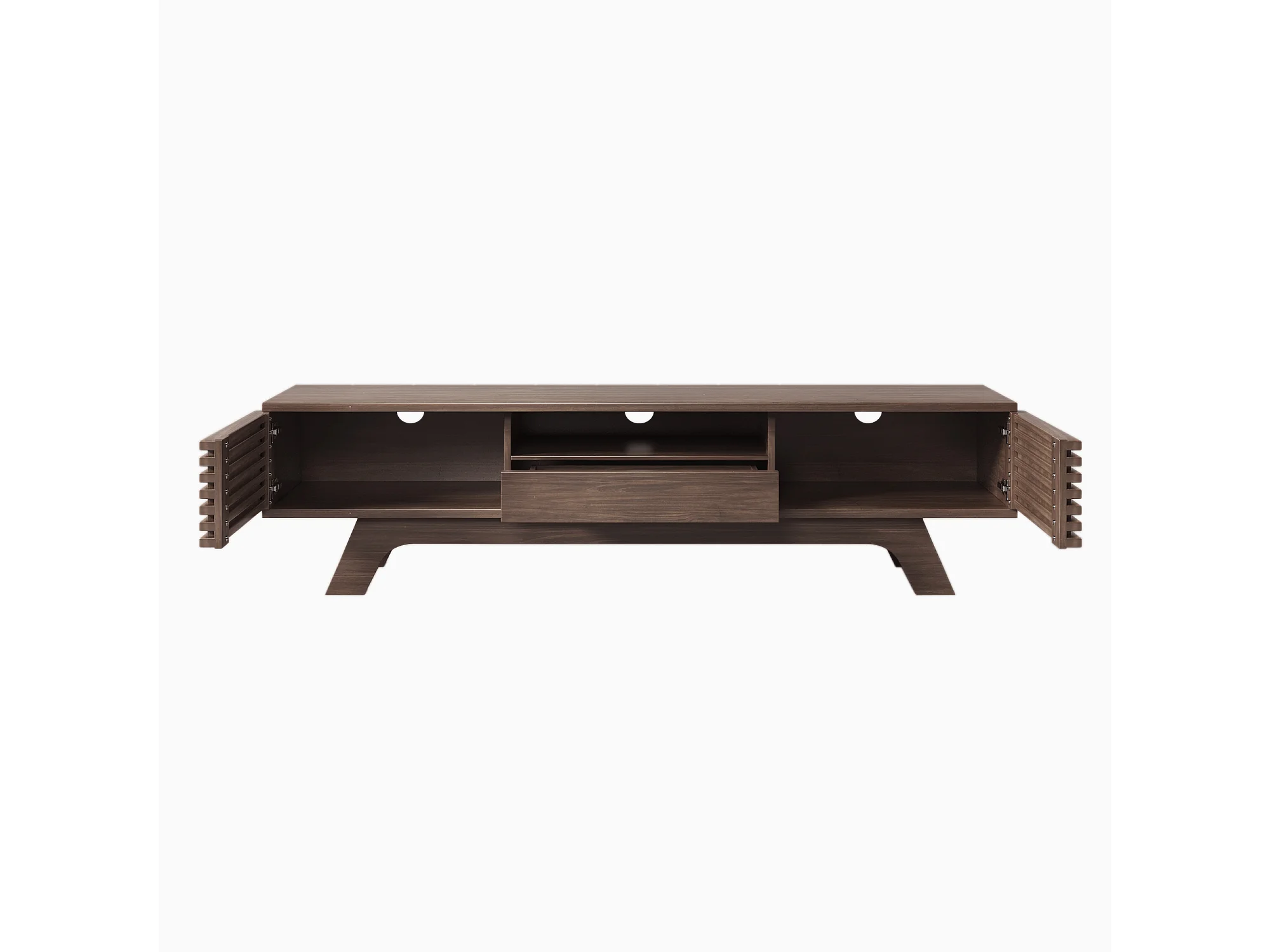 Meuble TV 150x35x44 cm, 2 portes et 1 tiroir, passages de câbles, rangements ouverts, panneau de particules, naturel