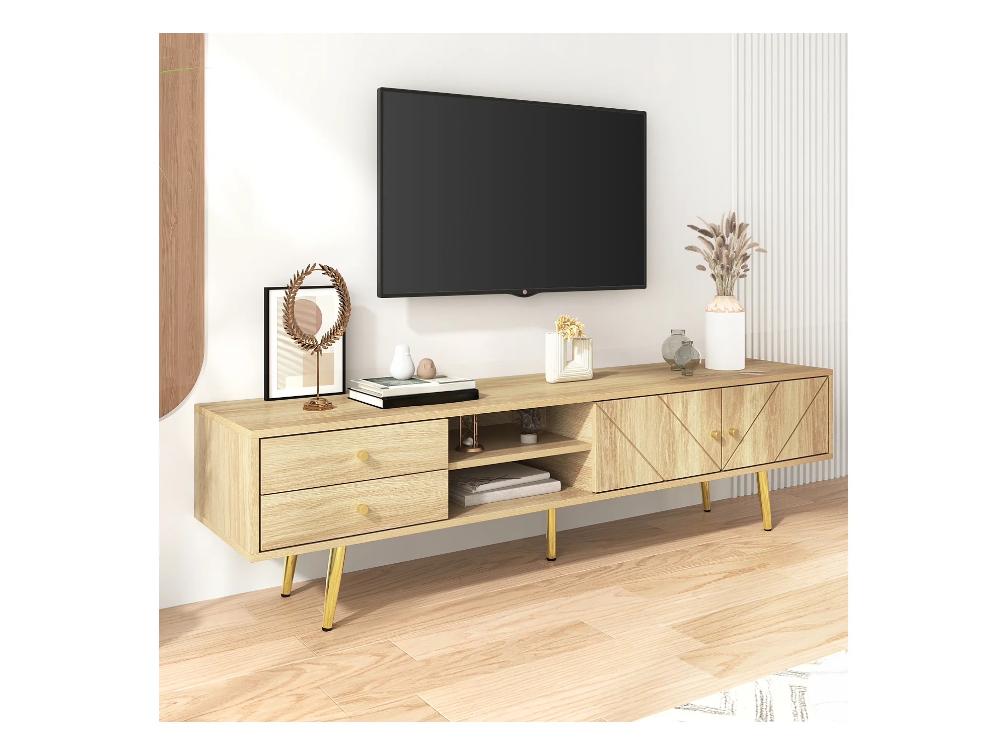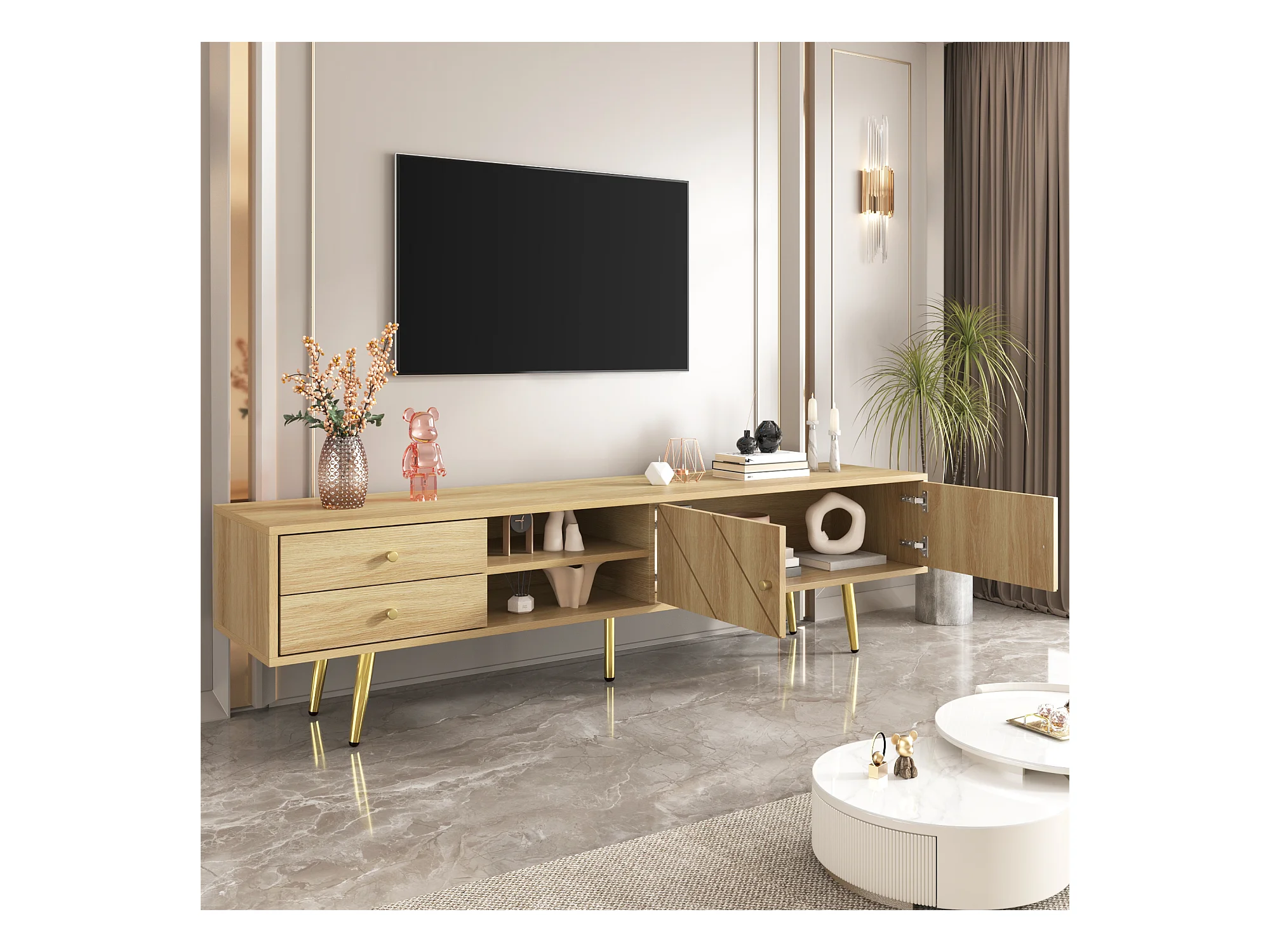Meuble TV 160cm avec pieds dorés, deux tiroirs et portes à design unique, en bois, couleur bois (160x36x42cm)
