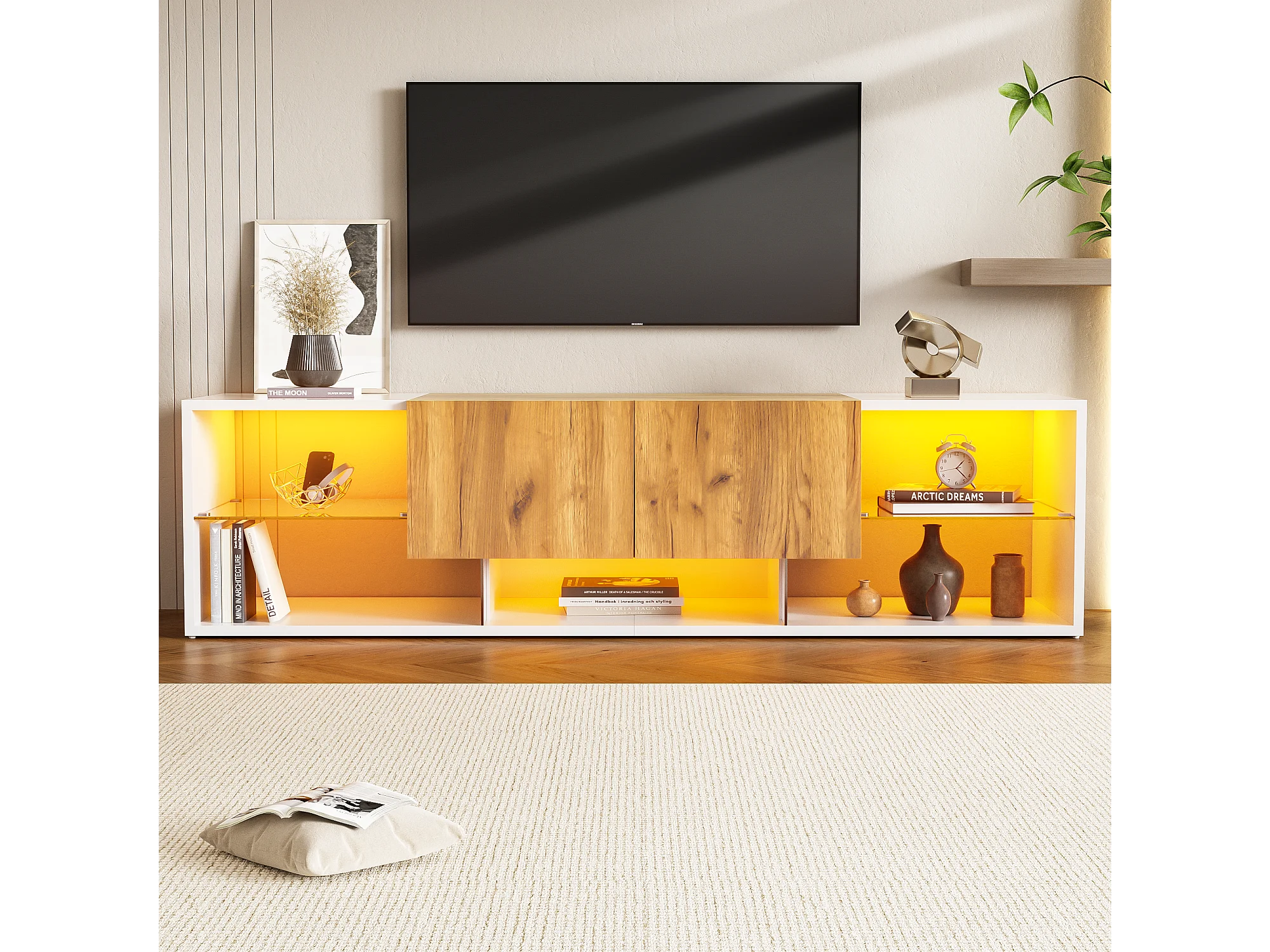 Meuble TV 160x40x42cm avec 2 tiroirs et 2 tablettes en verre, LED inclus, corps en placage woodgrain et blanc