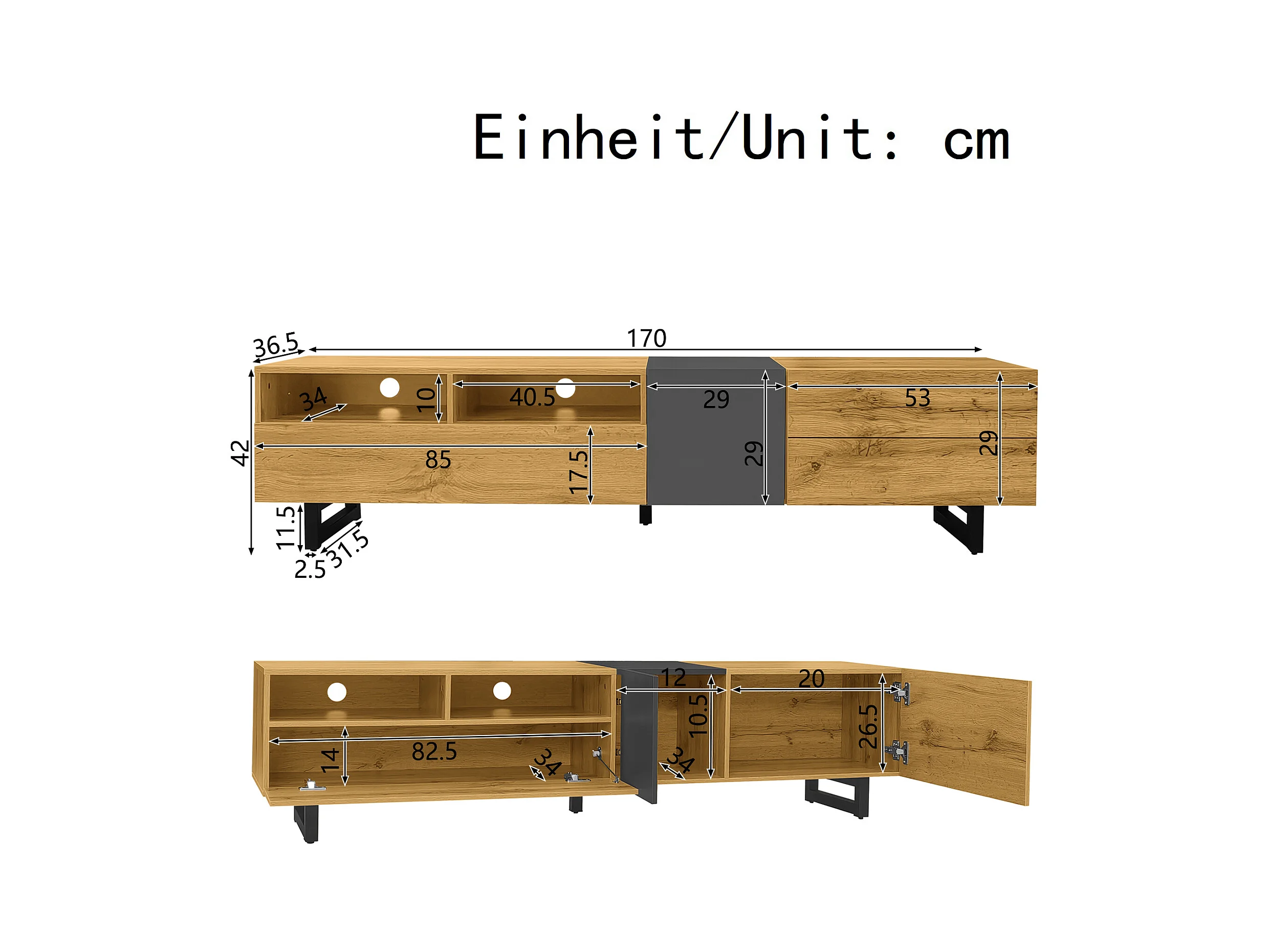Meuble TV 170 cm avec 3 portes et 2 compartiments de rangement, pieds en métal - couleur du bois et gris