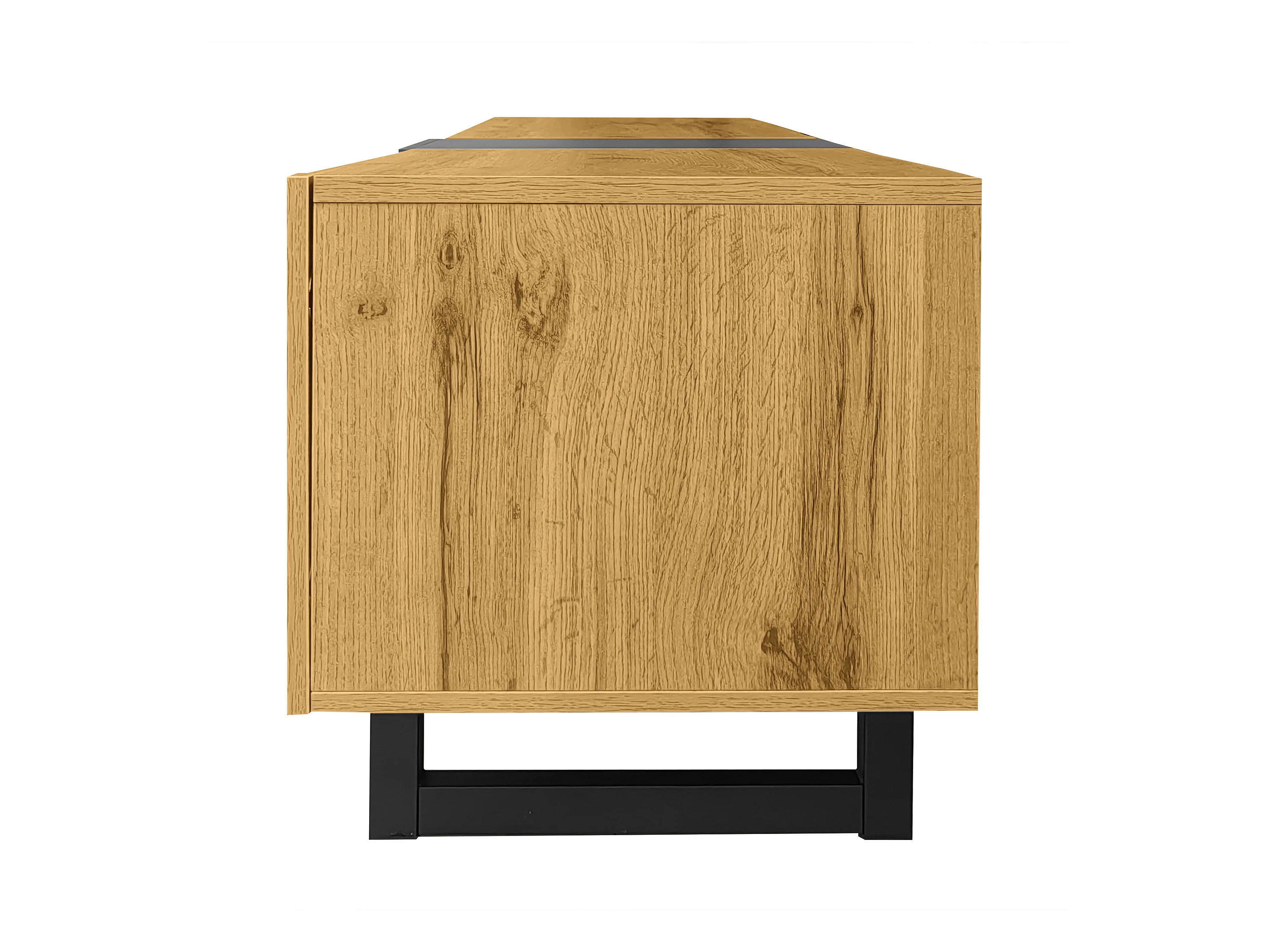 Meuble TV couleur naturelle avec 4 portes et passe-câbles, design à motifs ondulés 155x36x47cm