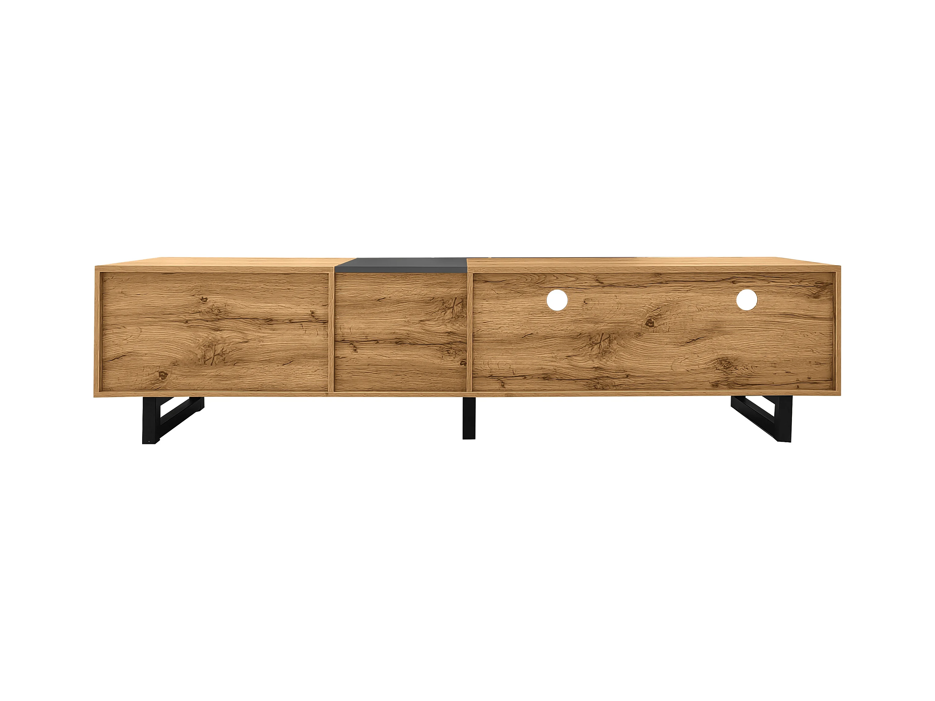 Meuble TV 160 cm bois et noir, 3 portes et 2 compartiments, structure en métal, pour salon