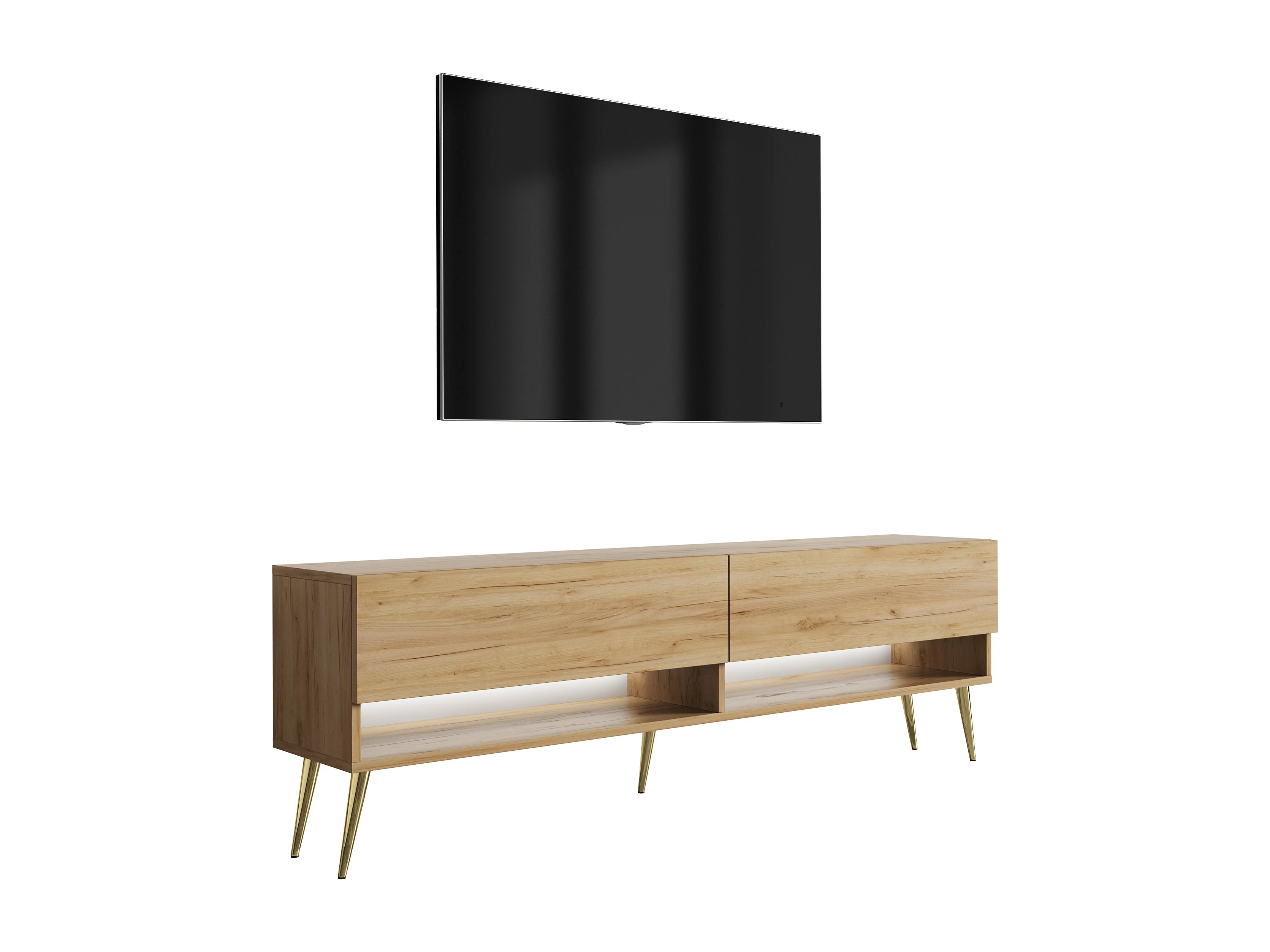 Meuble TV 170 cm Chêne Craft, pieds obliques dorés, LED blanche, 170 x 32 x 52 cm