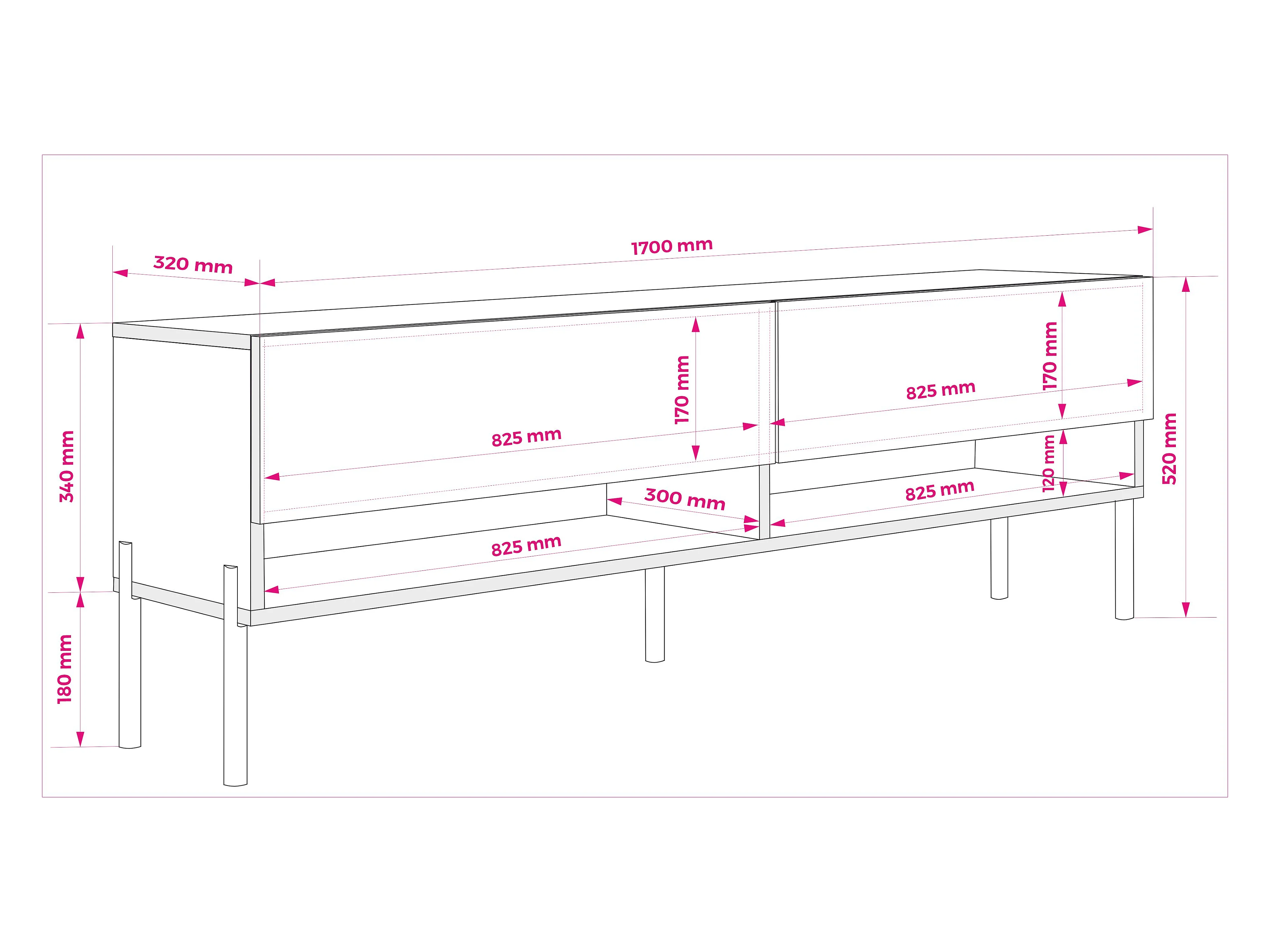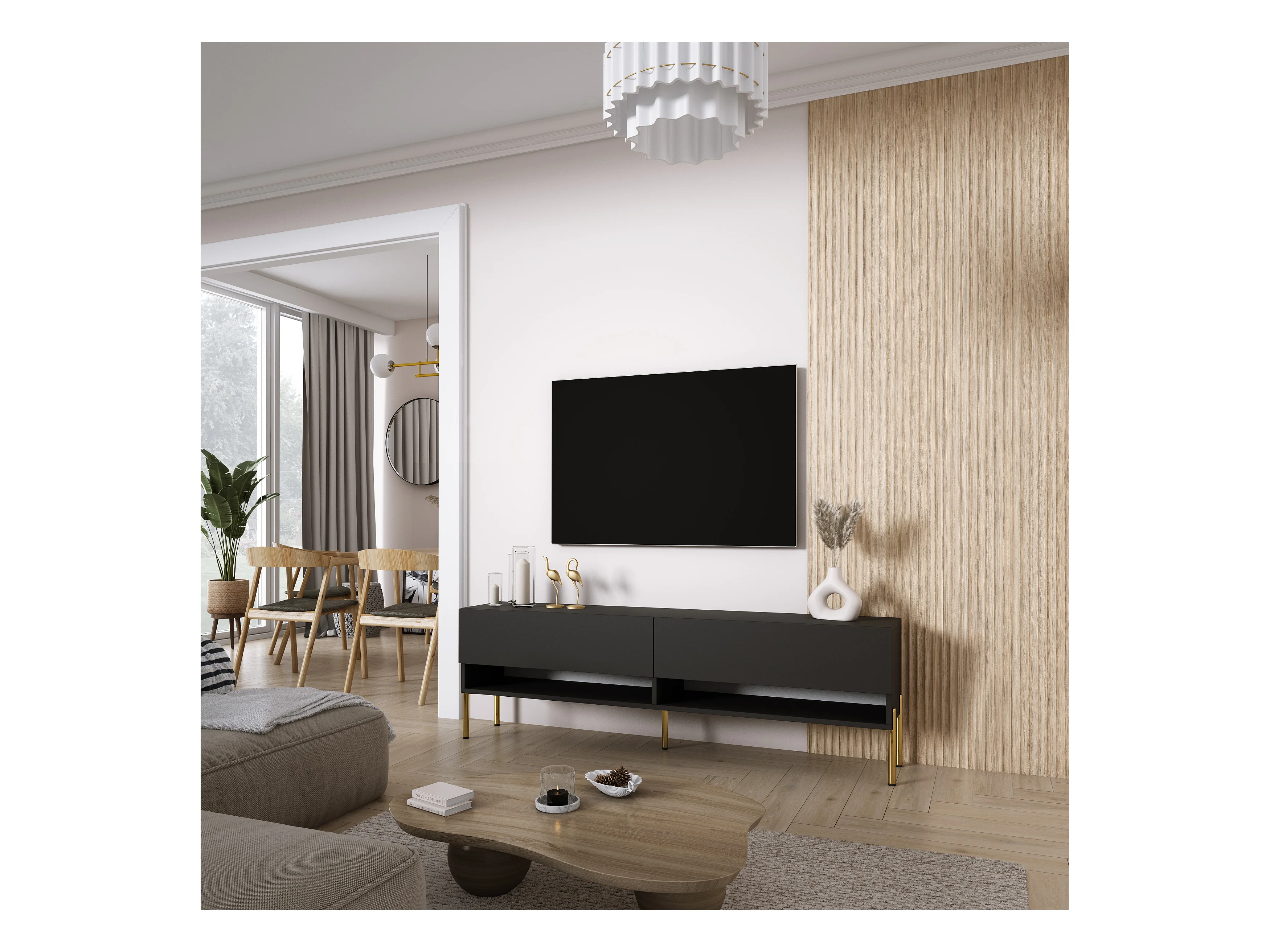 Meuble TV 170 cm Noir Mat, pieds droits dorés, 170 x 32 x 52 cm