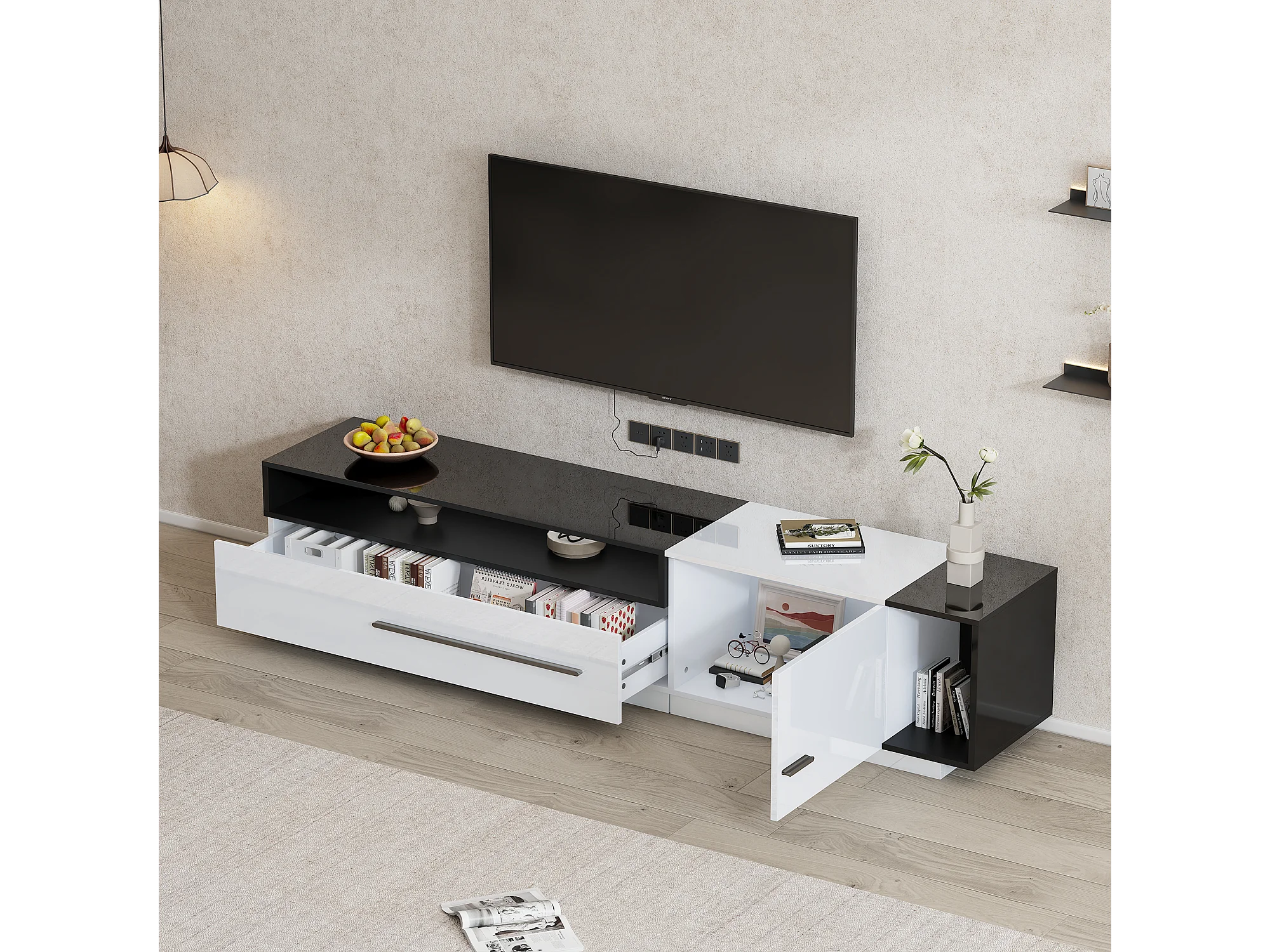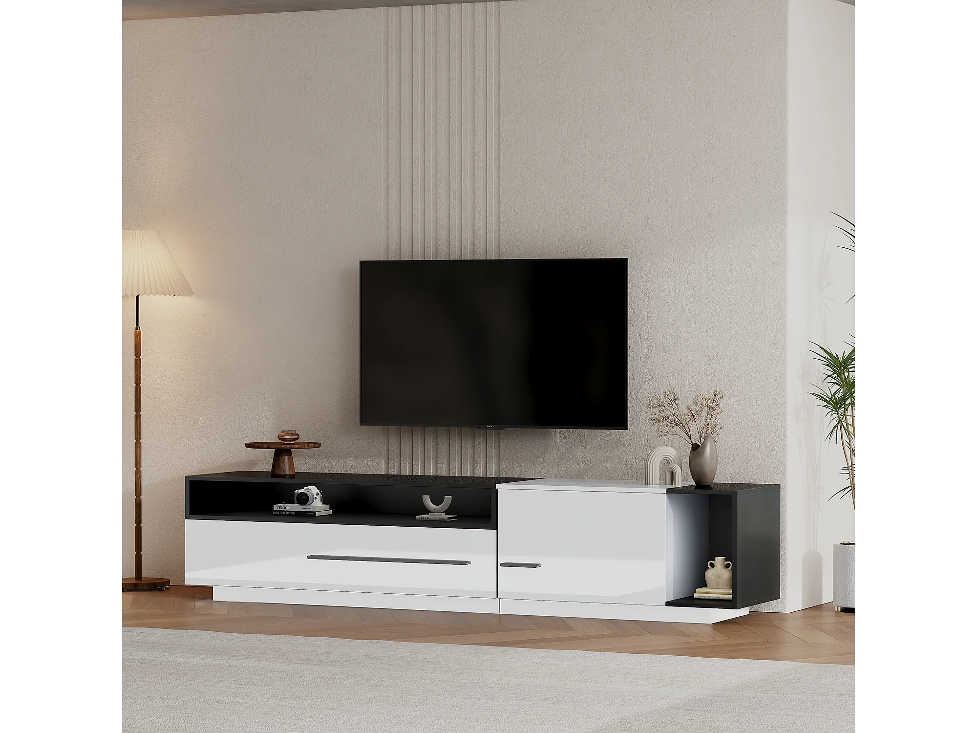 Meuble TV 170x38x42,3 cm avec tiroir, porte et étagère ouverte, blanc + noir
