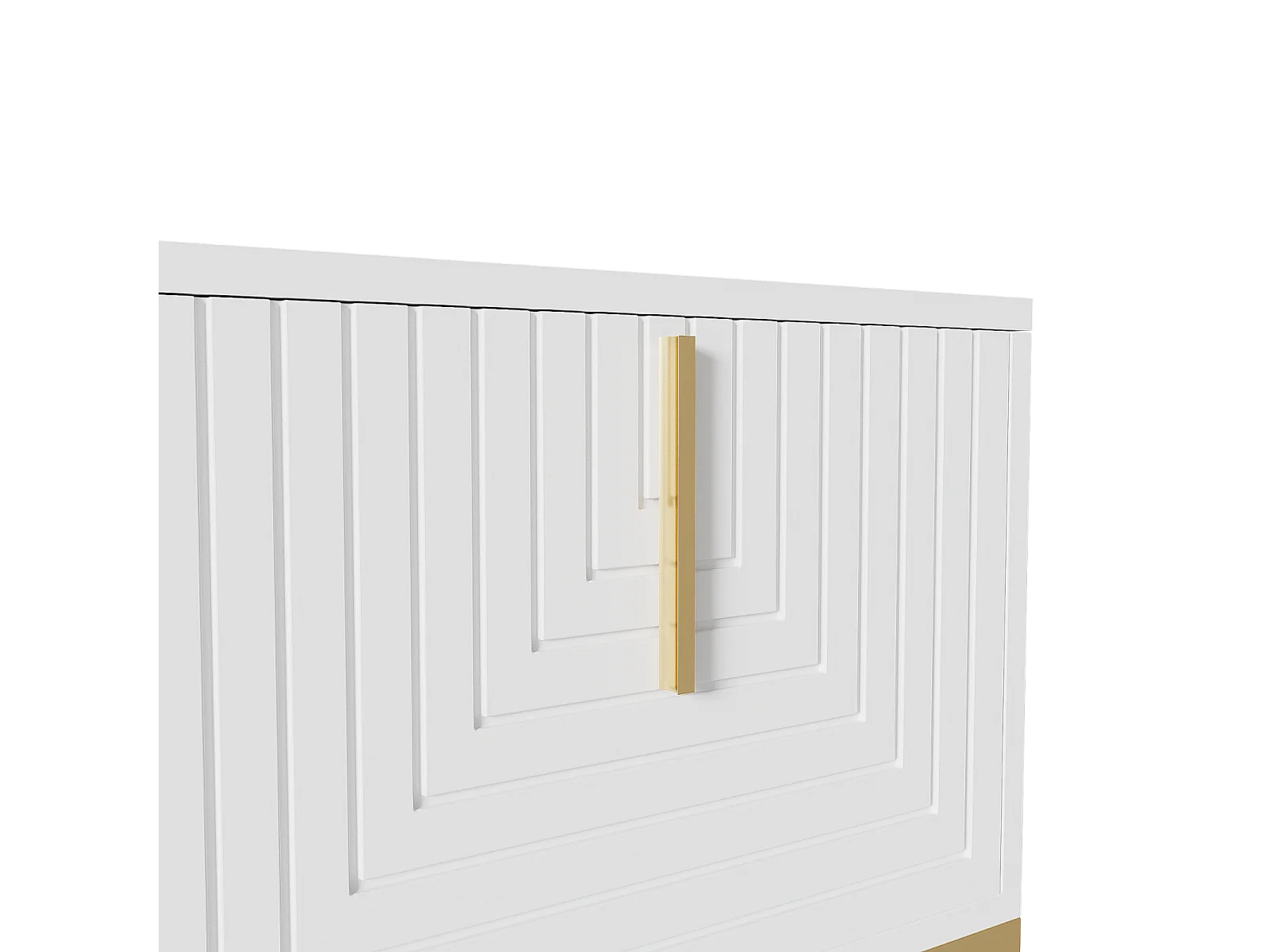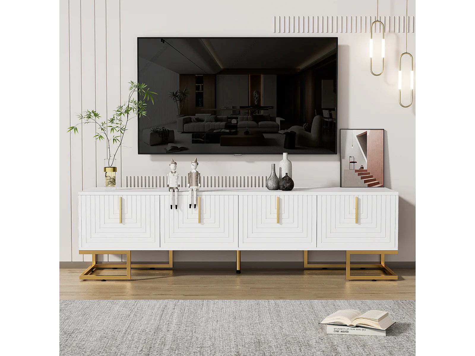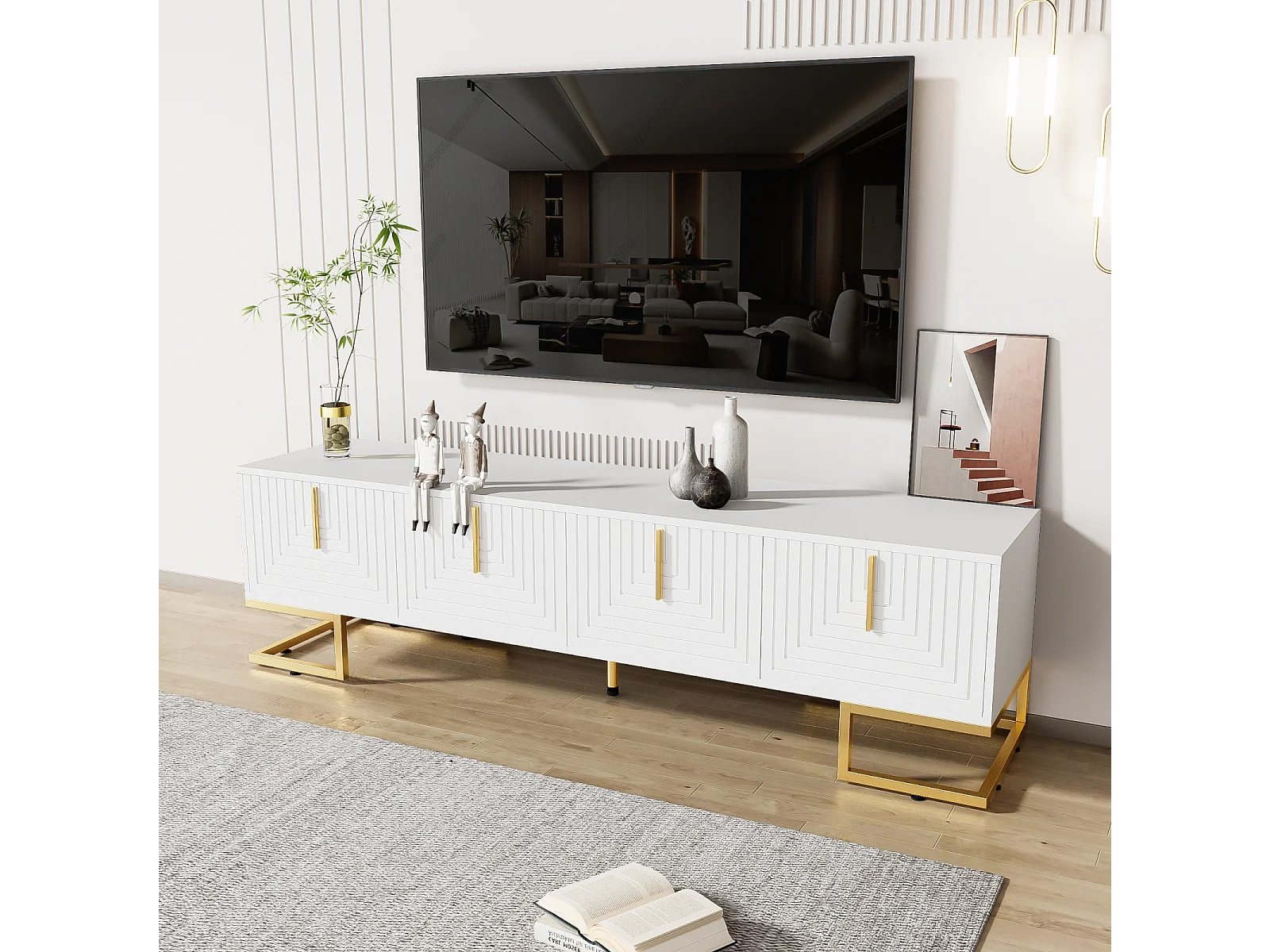 Meuble TV 170x40x45.5cm, avec 4 portes structurée, poignées dorées et pieds dorés, en panneaux de particules, blanc