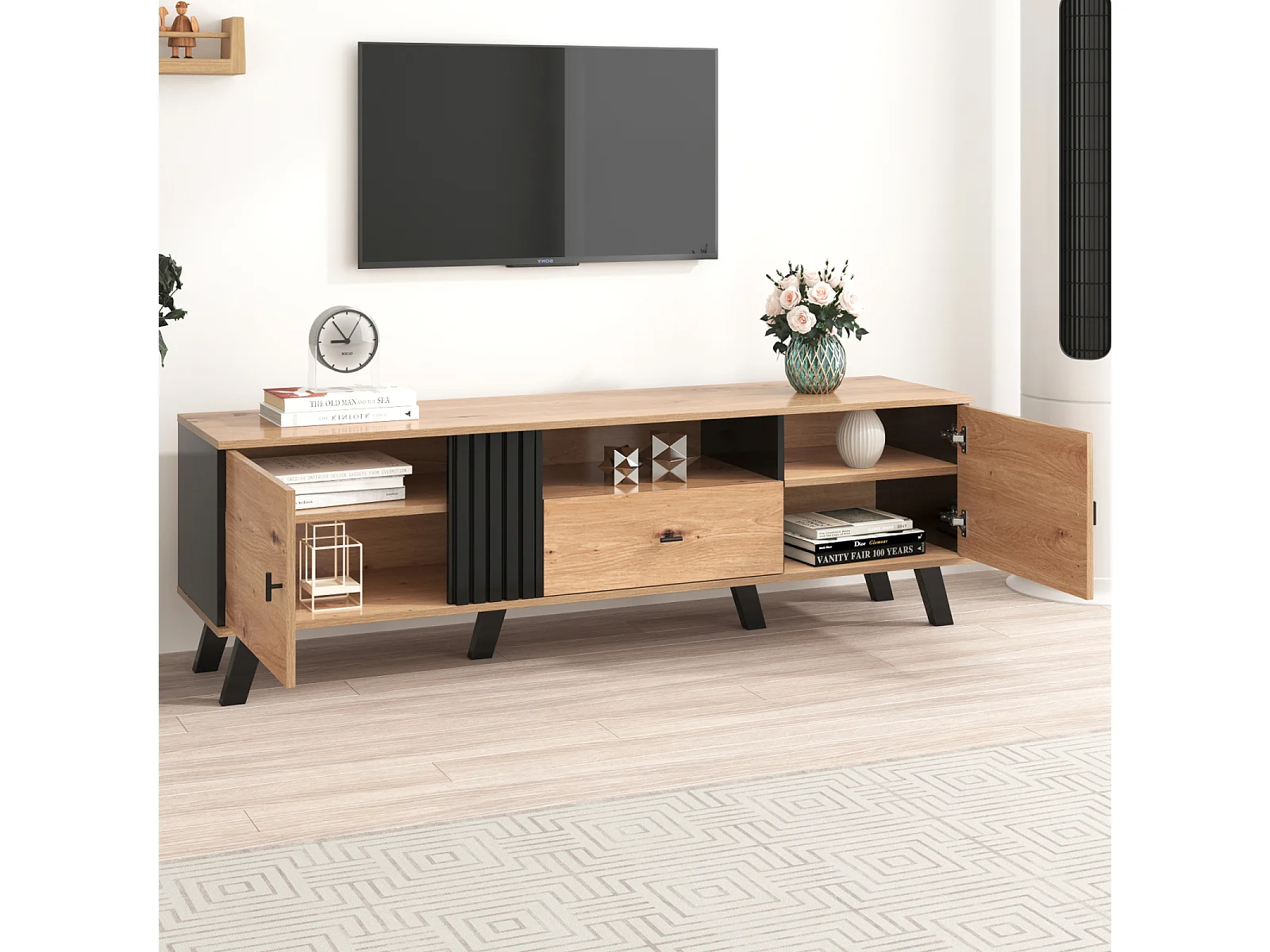 Meuble TV 170x40x50cm, Meuble bas avec tiroirs, 2 portes, multiples fonctions de rangement, design bois et noir
