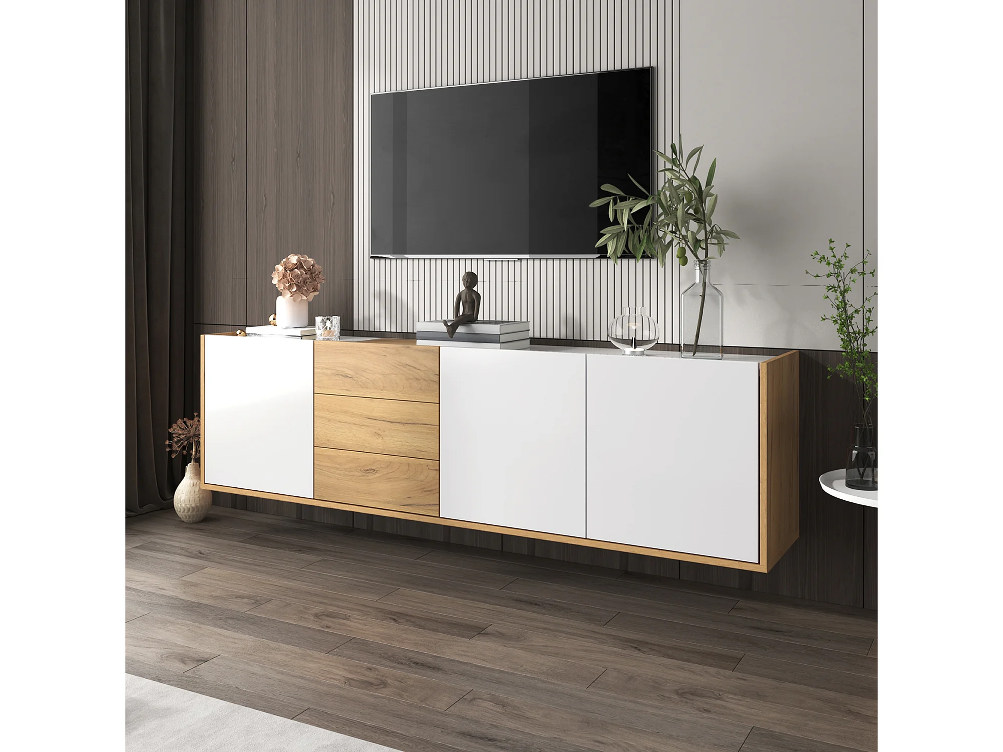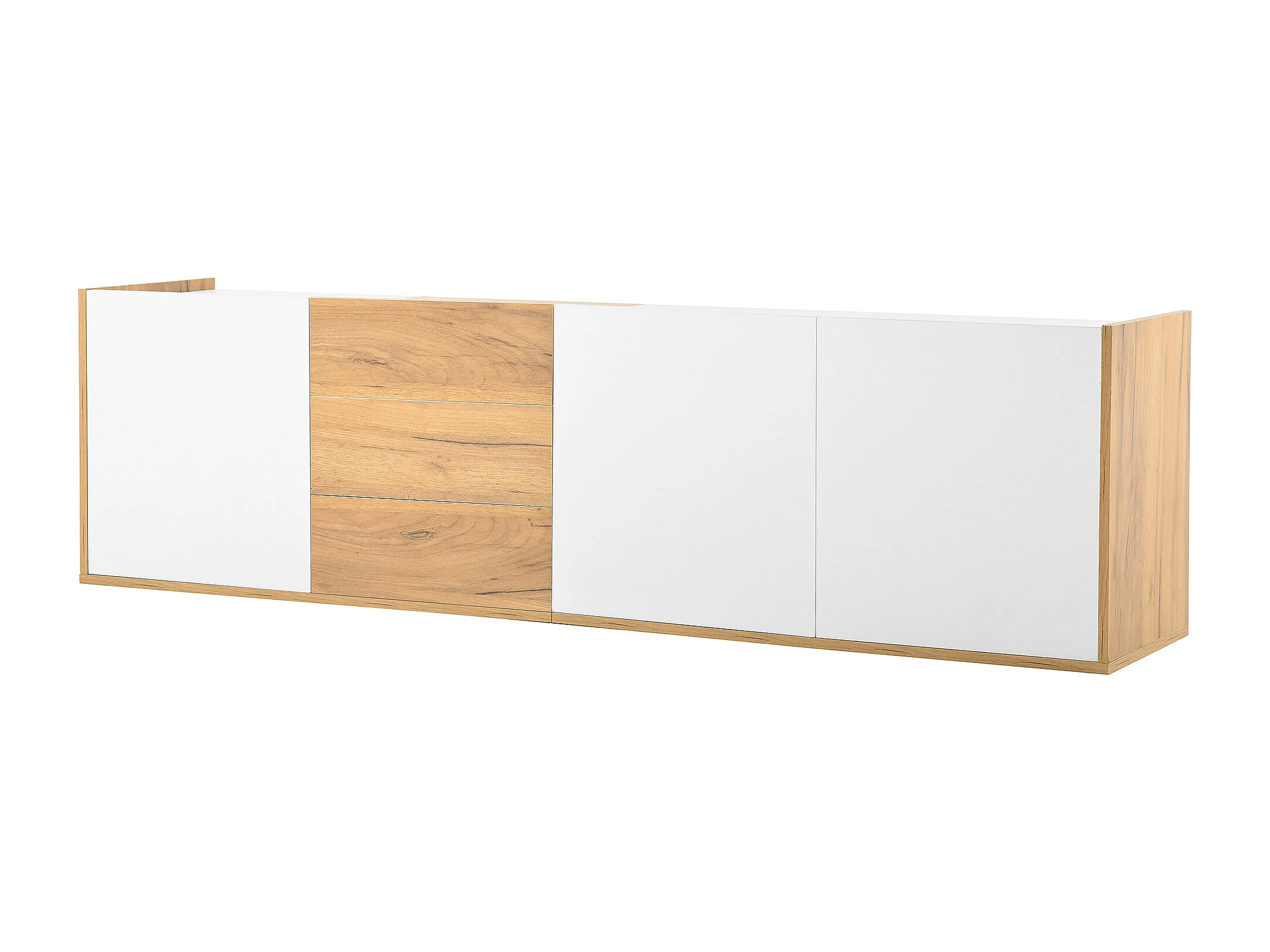 Meuble TV 171.5x35x47 cm, 3 portes et 3 tiroirs, étagères réglables, usage au sol ou mural, MDF, blanc et bois