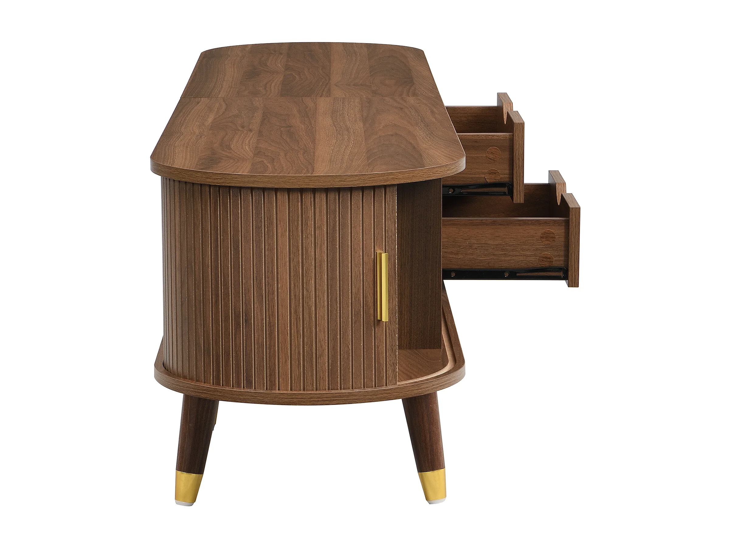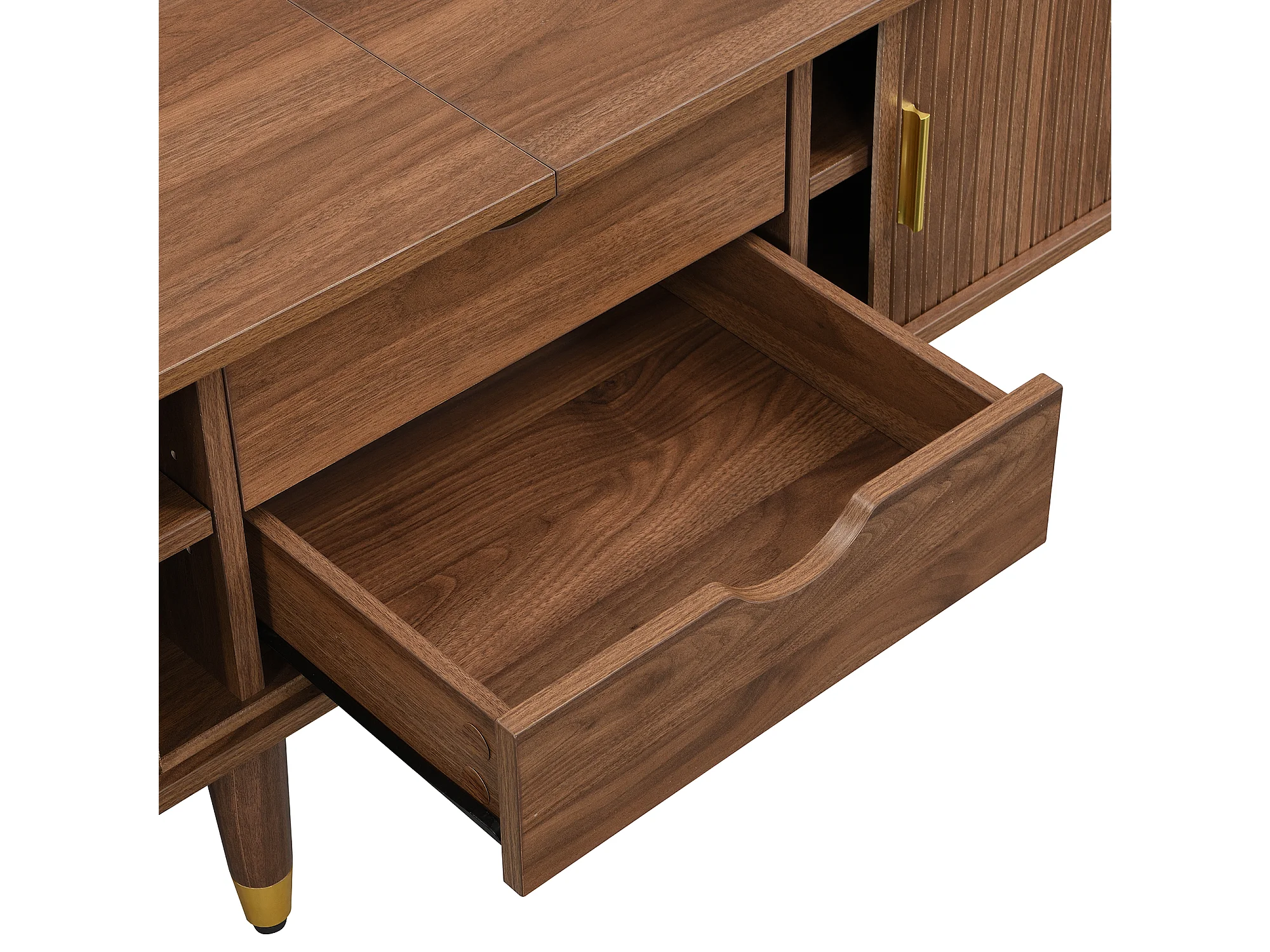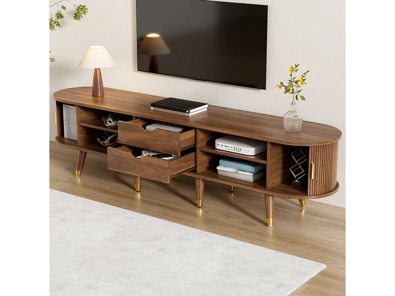 Meuble TV 175 cm effet noyer avec porte coulissante en rotin, tiroirs et niches ouvertes, salon