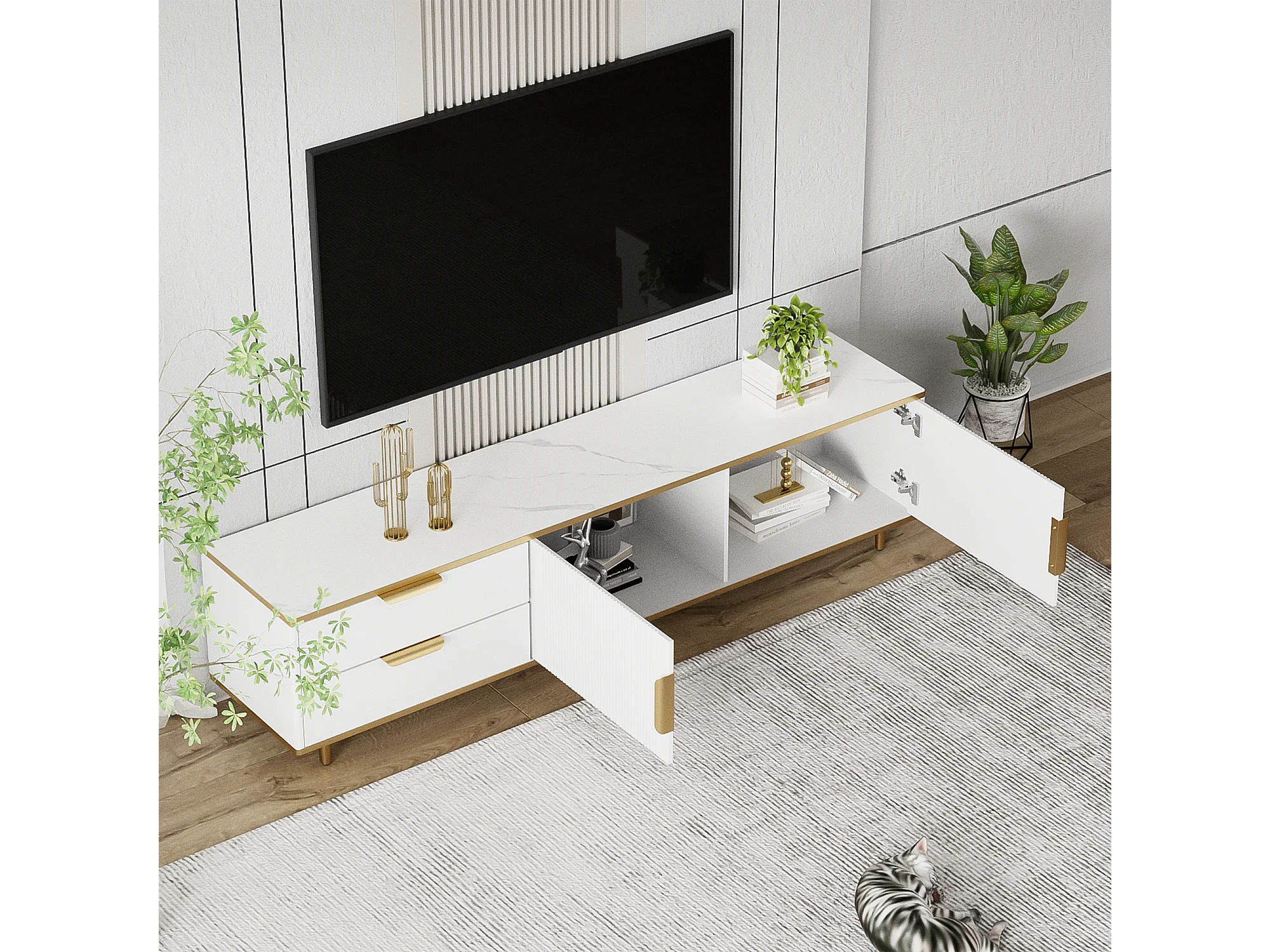 Meuble TV 175x40x45 cm avec tiroirs et armoires de rangement panneaux de particules blanc et or pour salon