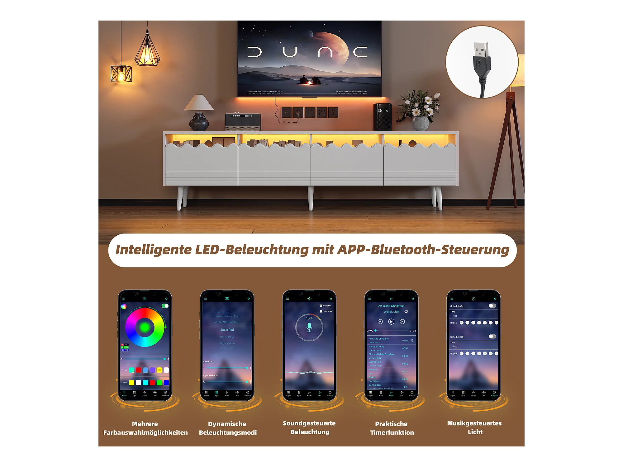 Meuble TV blanc laqué avec LED, 16 couleurs, pour TV 60 pouces, 140x38x38cm