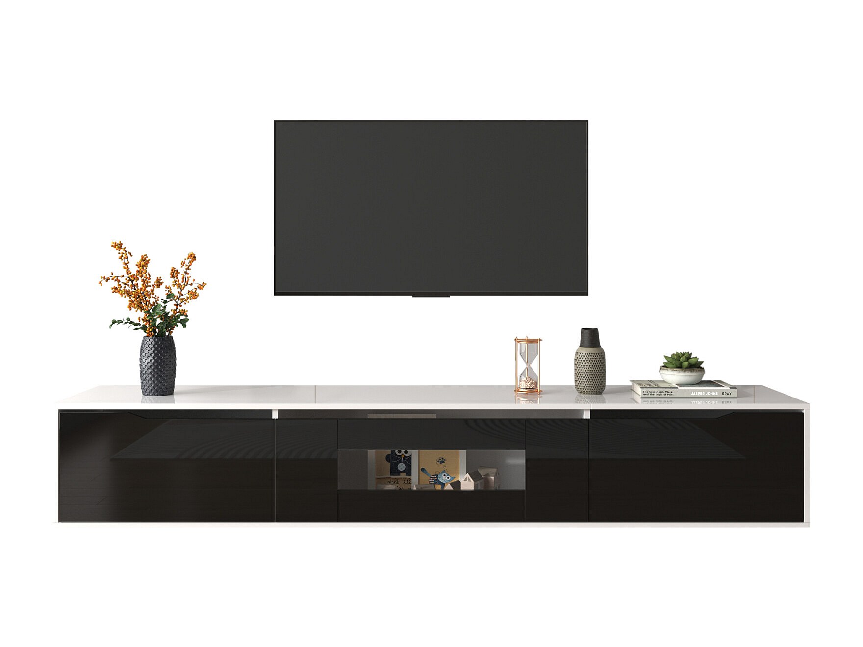 Meuble TV, meuble TV brillant, assorti au noir et blanc, avec éclairage LED à changement de couleur.