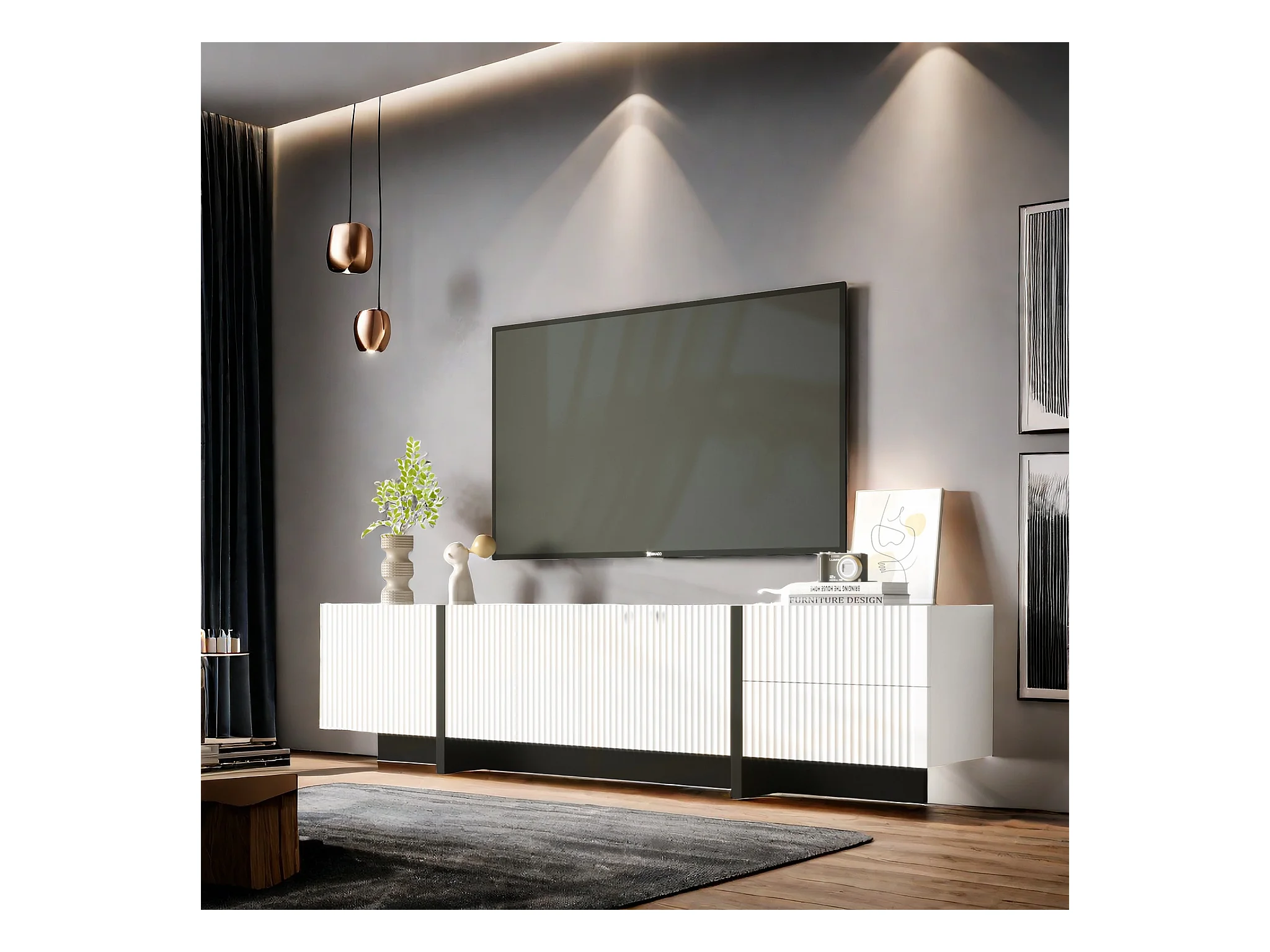 Meuble TV 190 cm 3 portes, 2 tiroirs, Blanc, design simple et épuré.