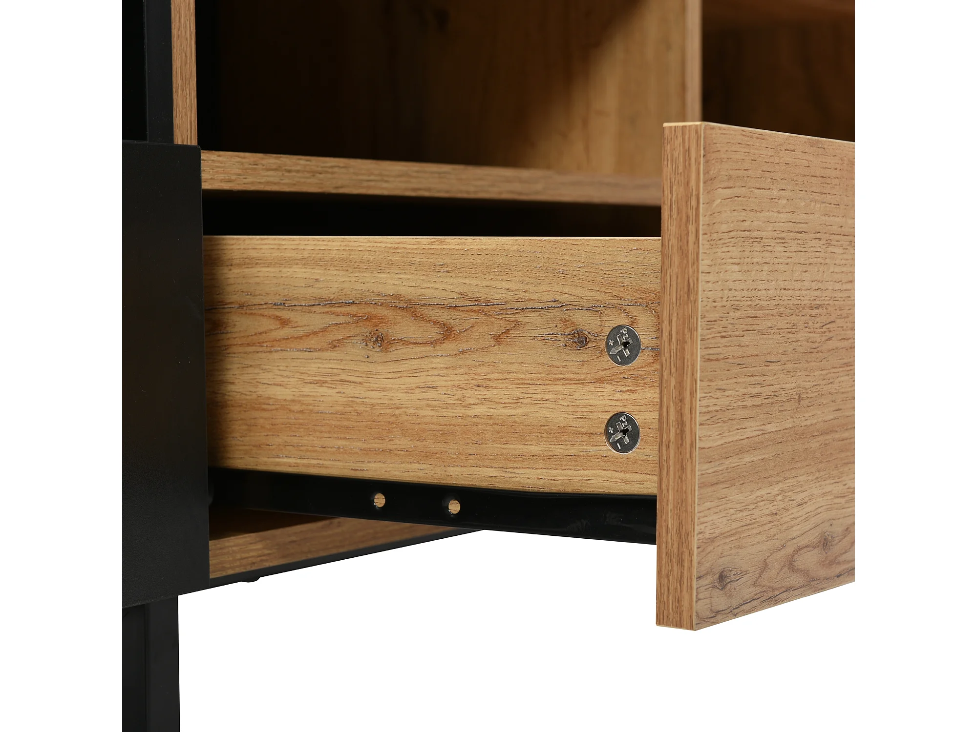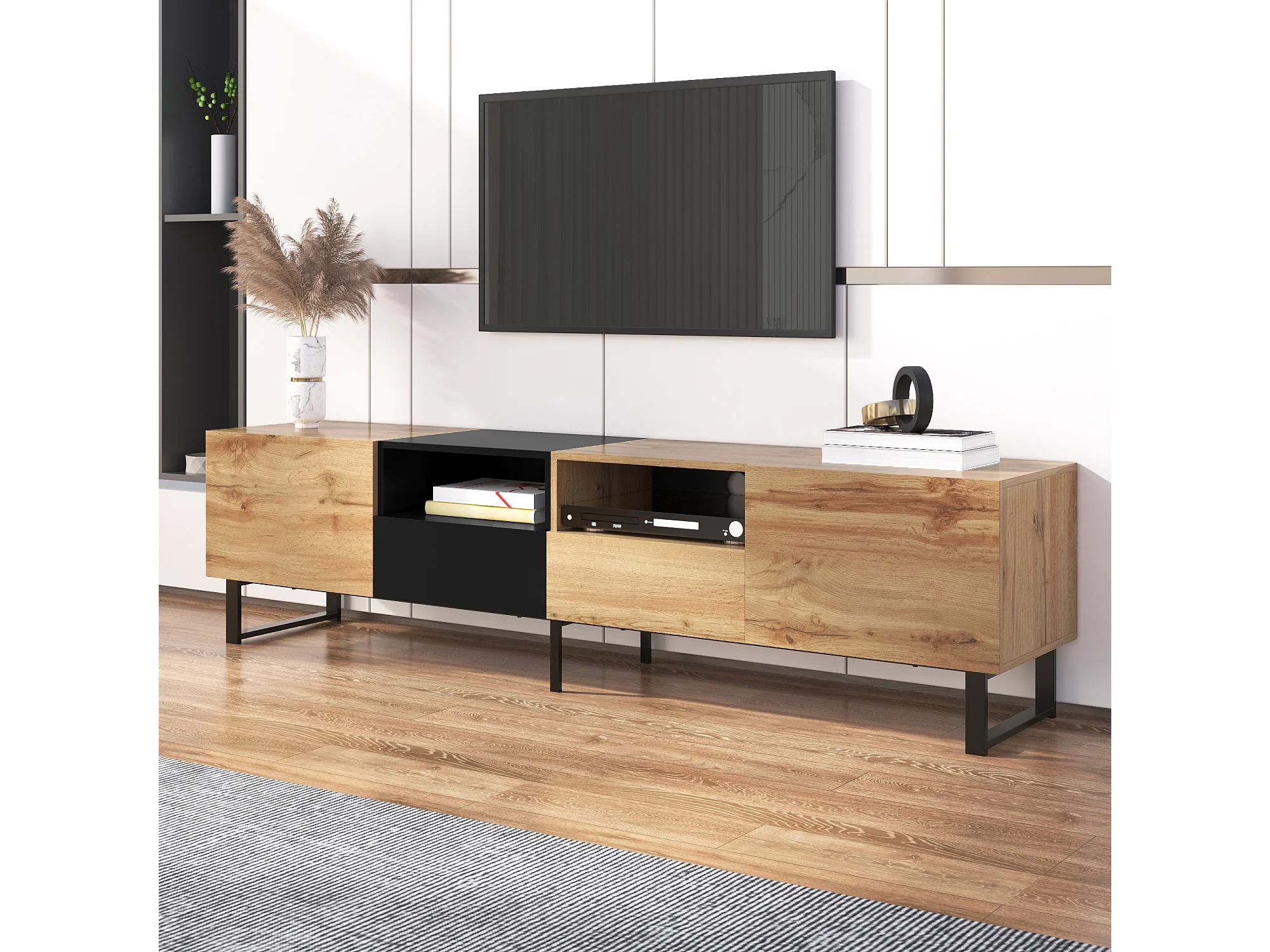 Meuble TV 190x38x48 cm, 2 portes et 2 tiroirs, bords en PVC, glissières 12 pouces, MDF, noir et bois naturel
