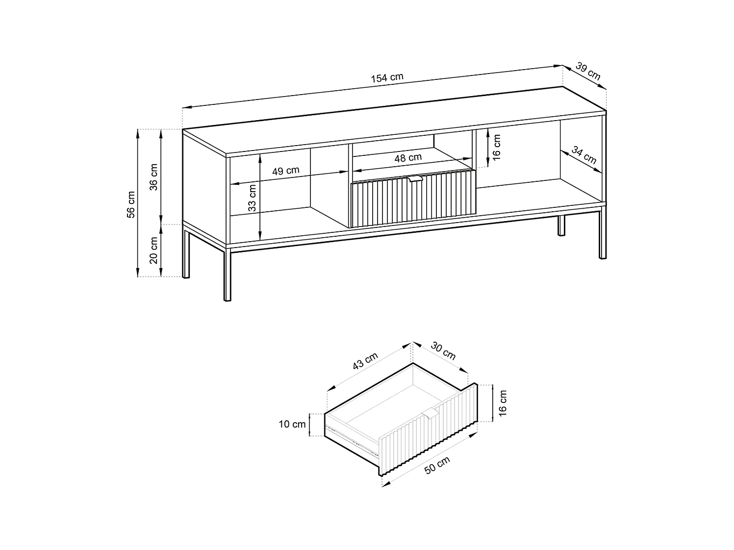 Meuble TV 2 portes, 1 tiroir avec pieds en métal noir, 154x56 cm