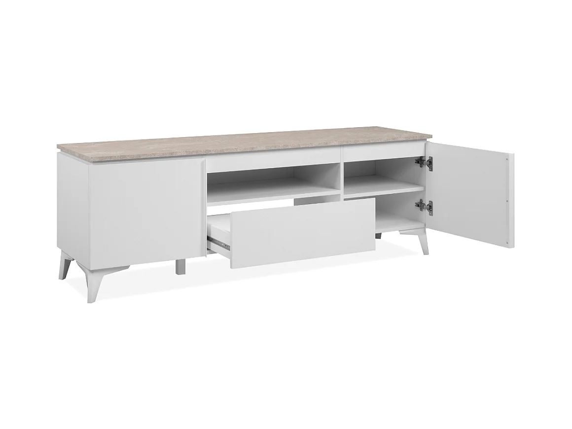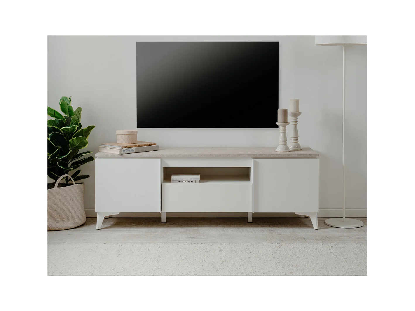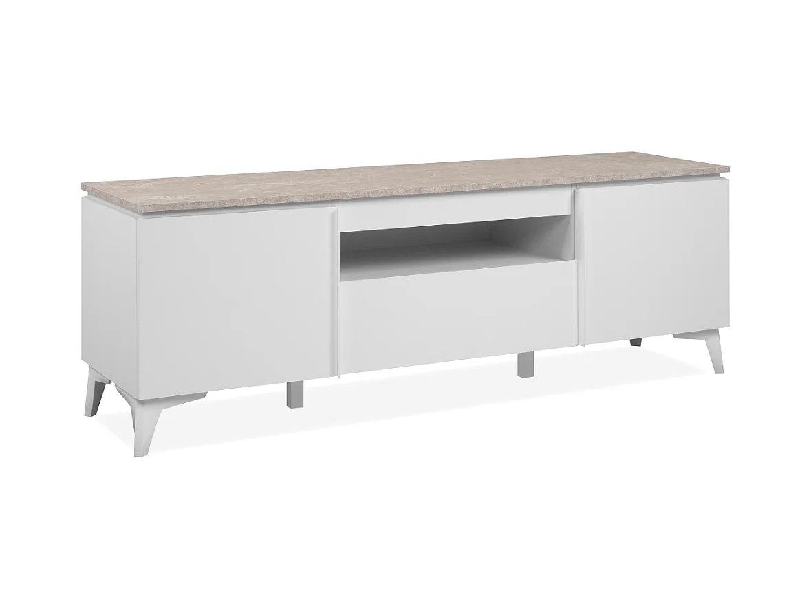 Meuble TV 2 portes, 1 tiroir et 1 niche décor travertin et blanc L150cm - BERTRIX