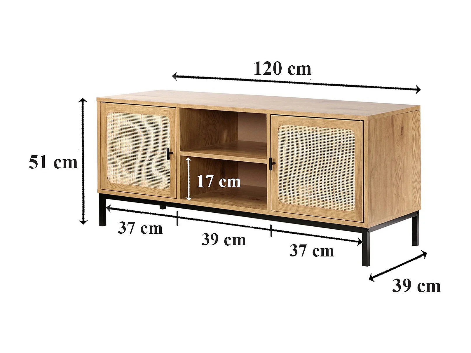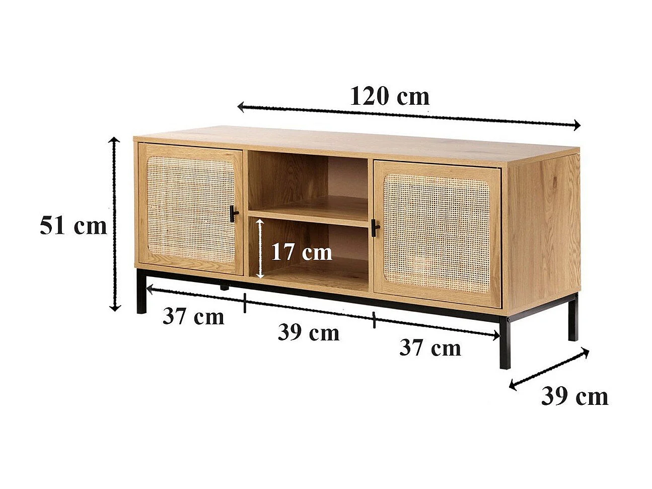 Meuble TV 2 Portes avec Cannage Rotin et 2 Niches L120cm - JAYA