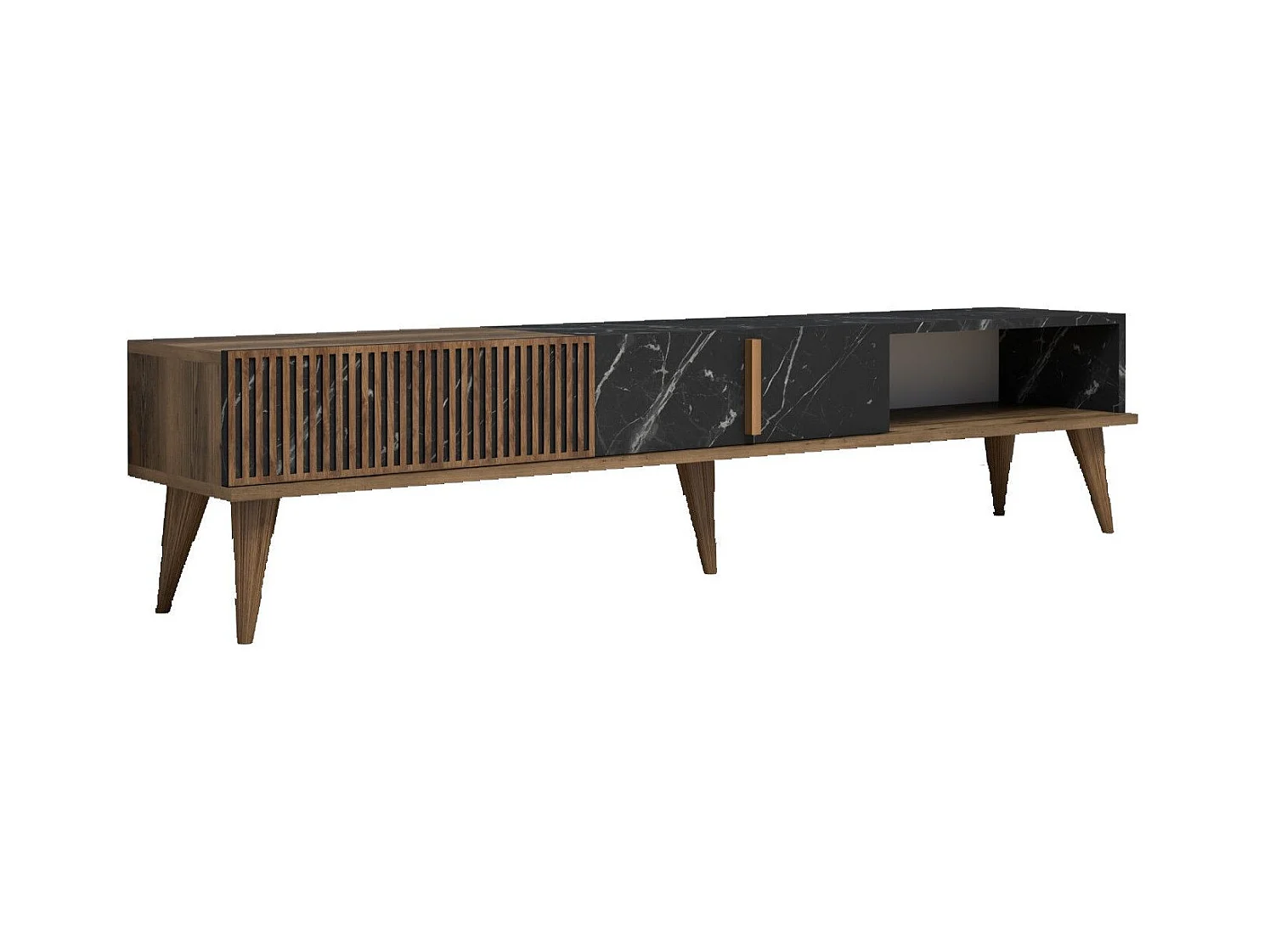 Meuble TV 2 portes et 1 étagères Ribera 180cm Bois foncé et Effet marbre Noir