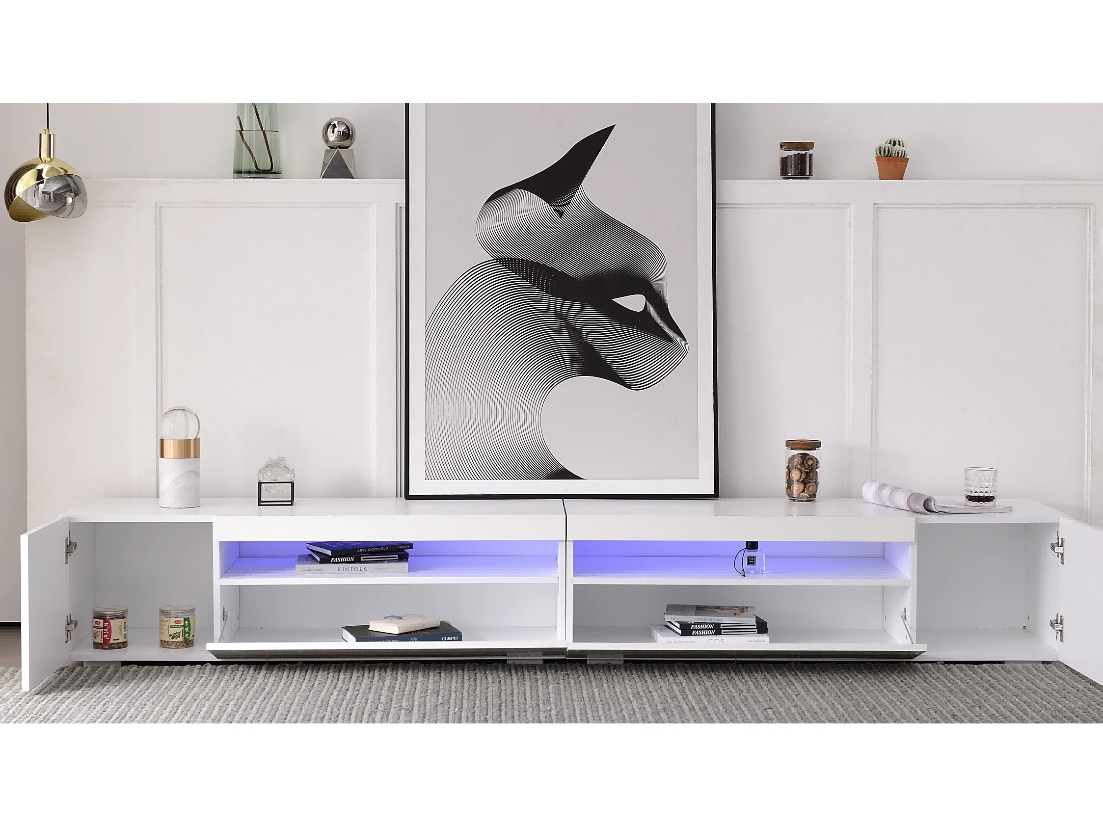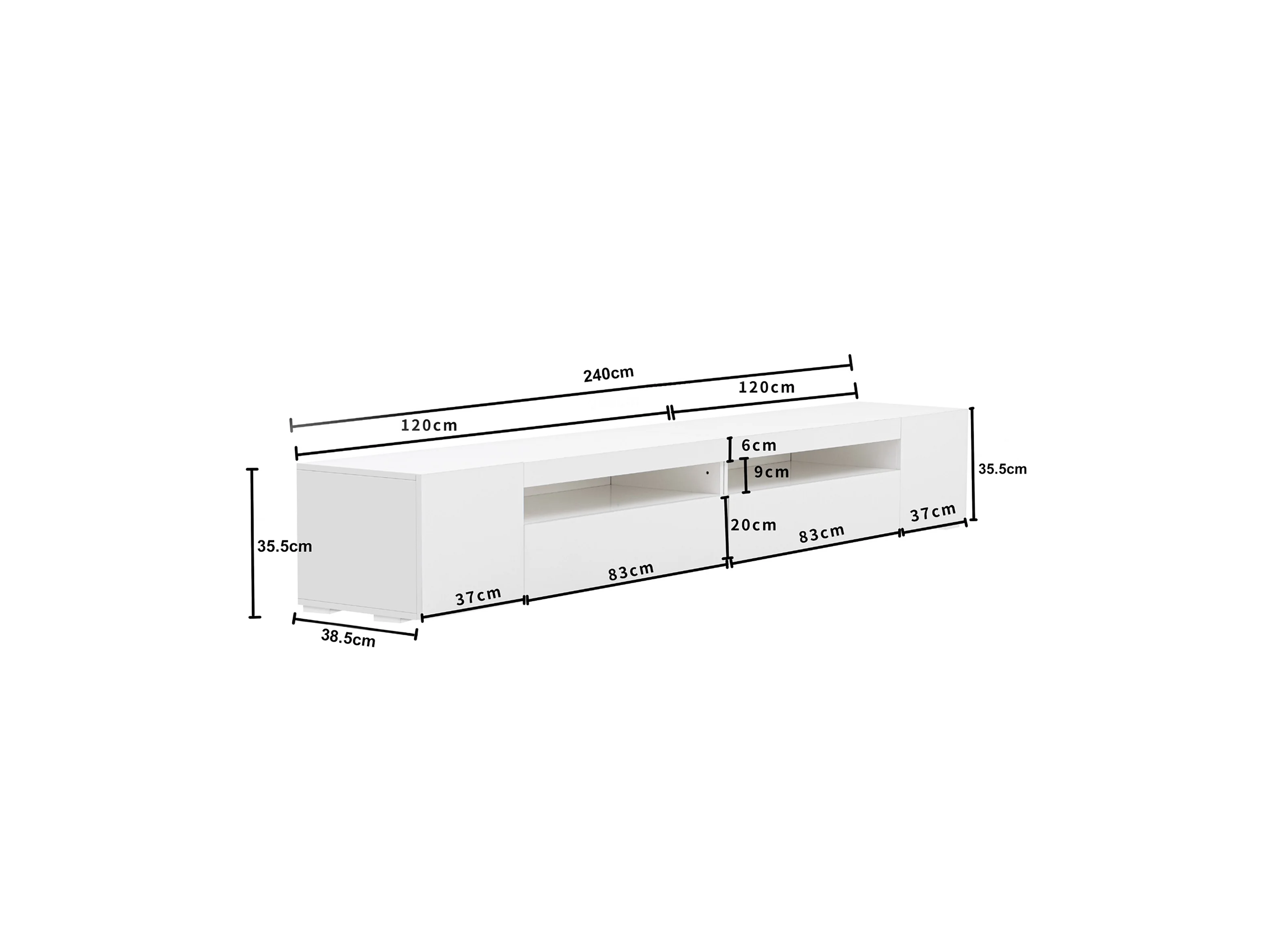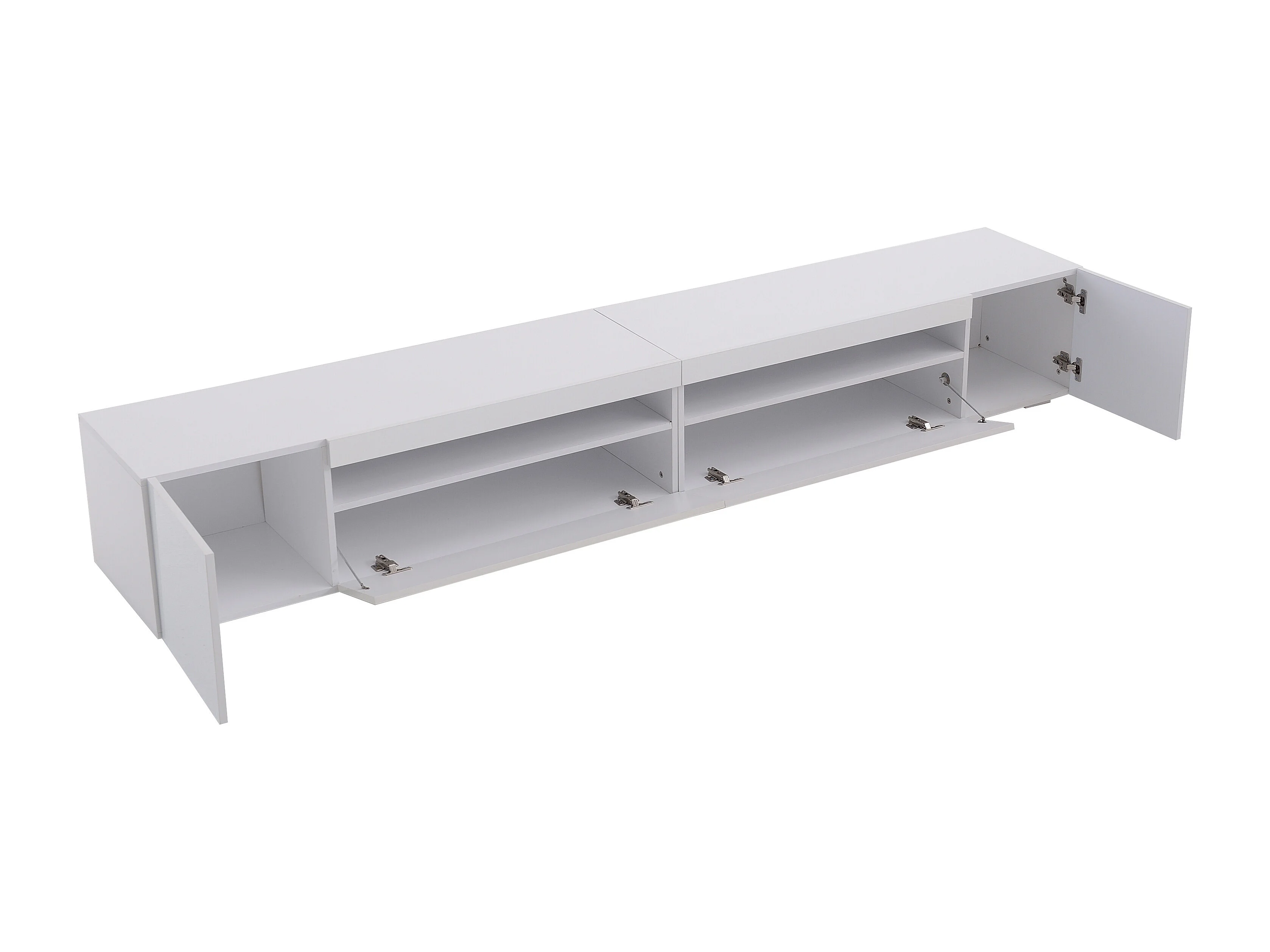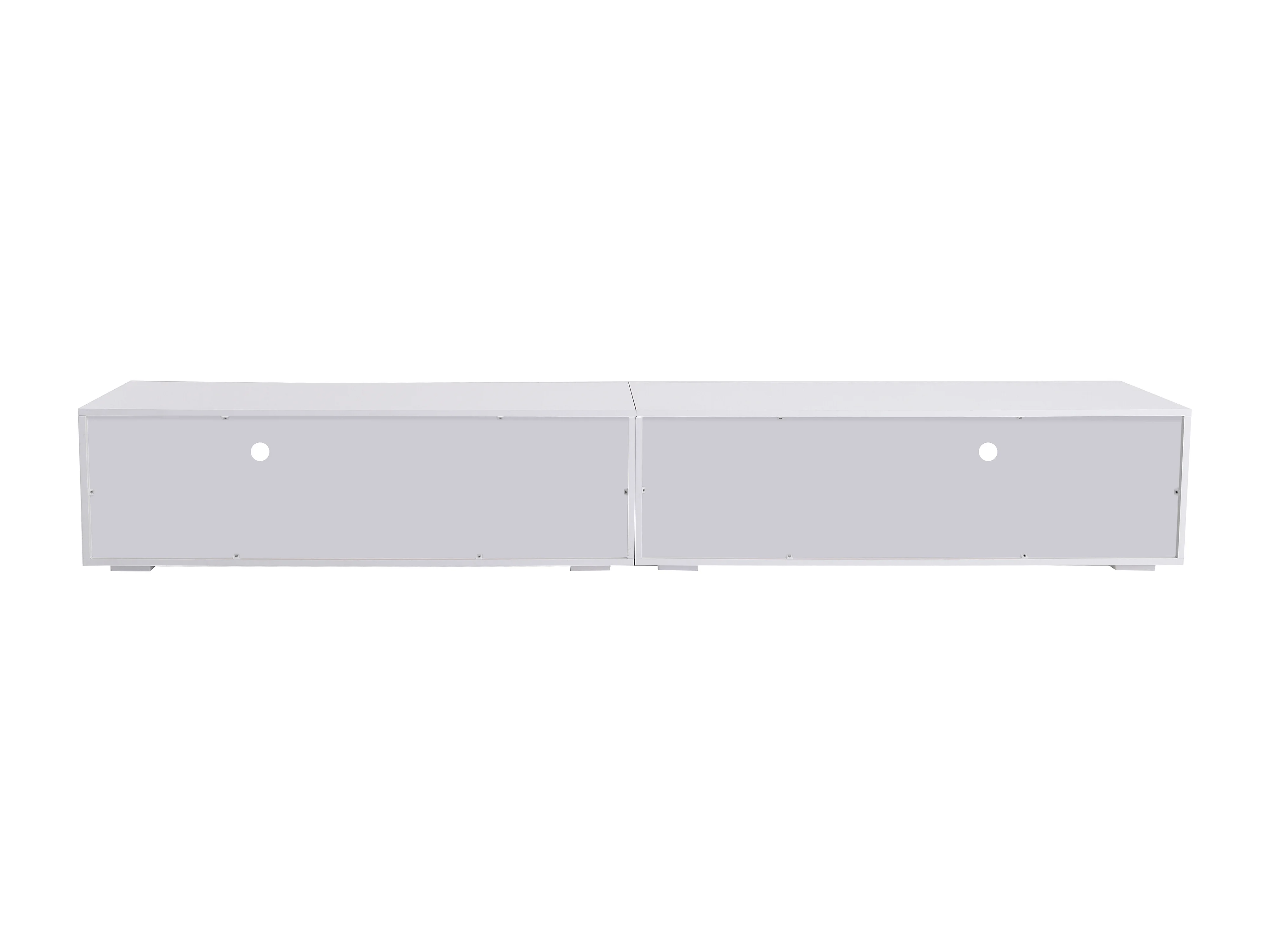 Meuble TV 240x38.5x35.5 cm, éclairage LED variable, design symétrique, MDF, blanc