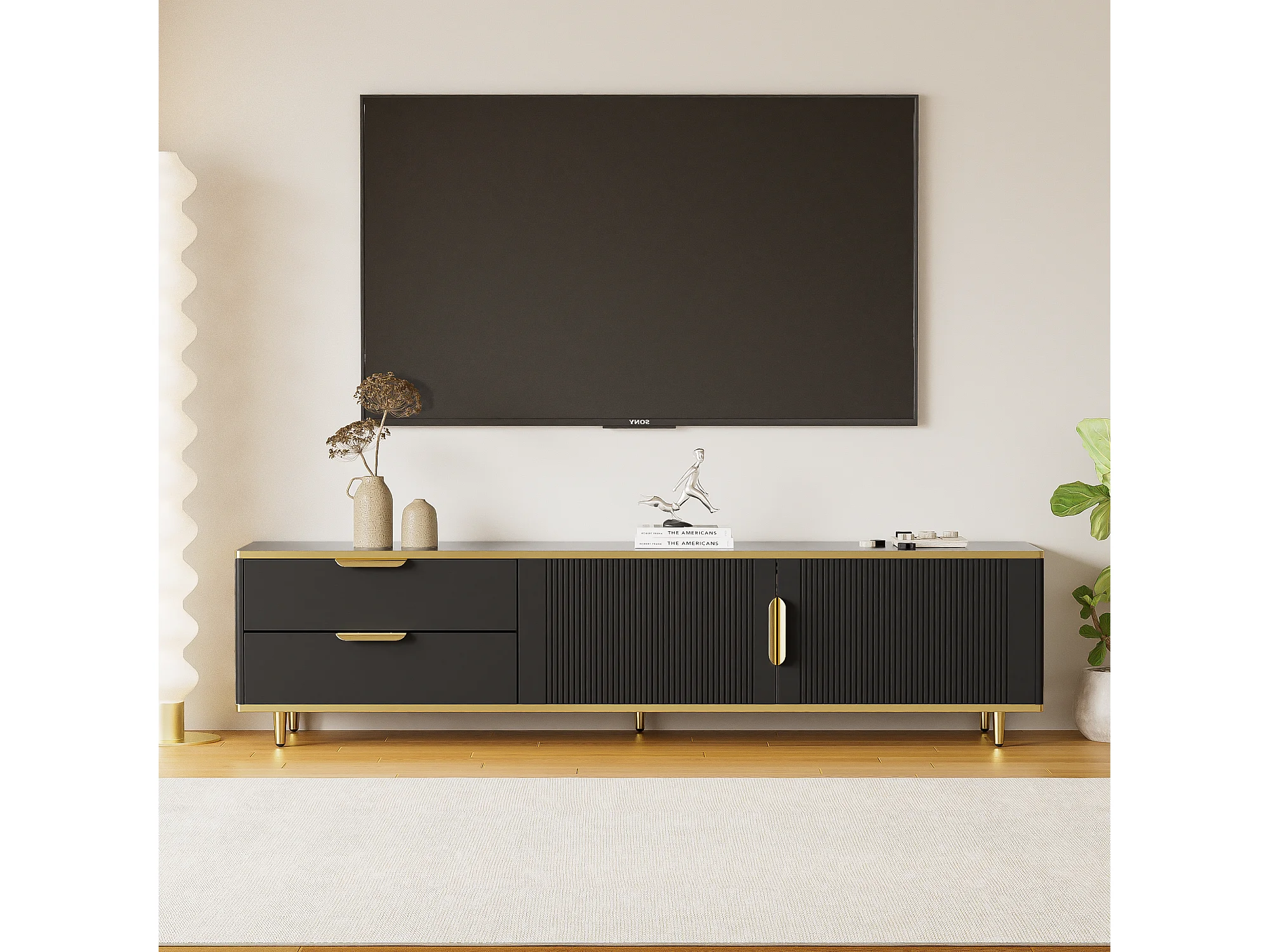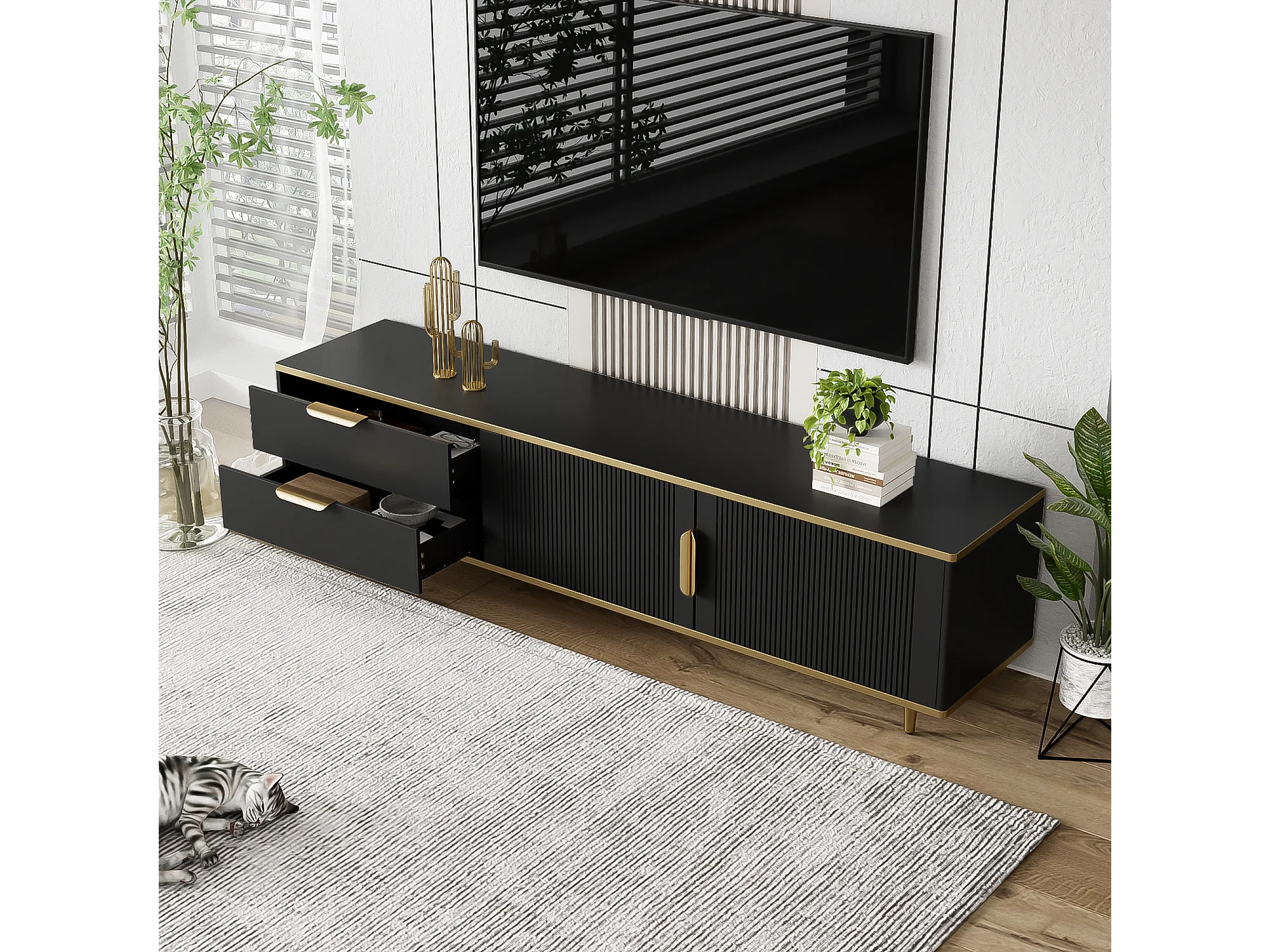 Meuble TV à portes sculptées, design moderne, MDF, noir et doré, avec 2 tiroirs et 2 compartiments (175x40x45cm)
