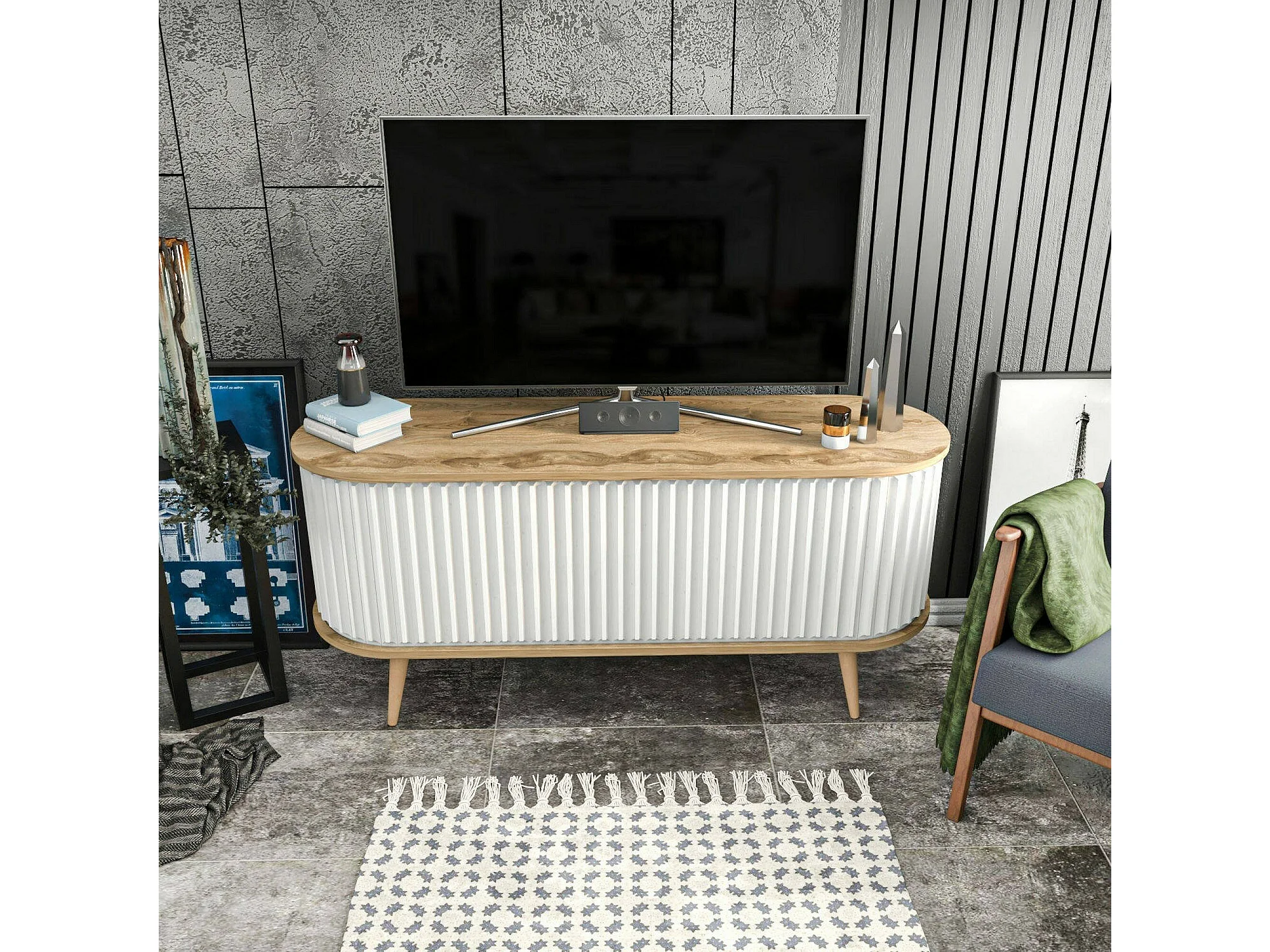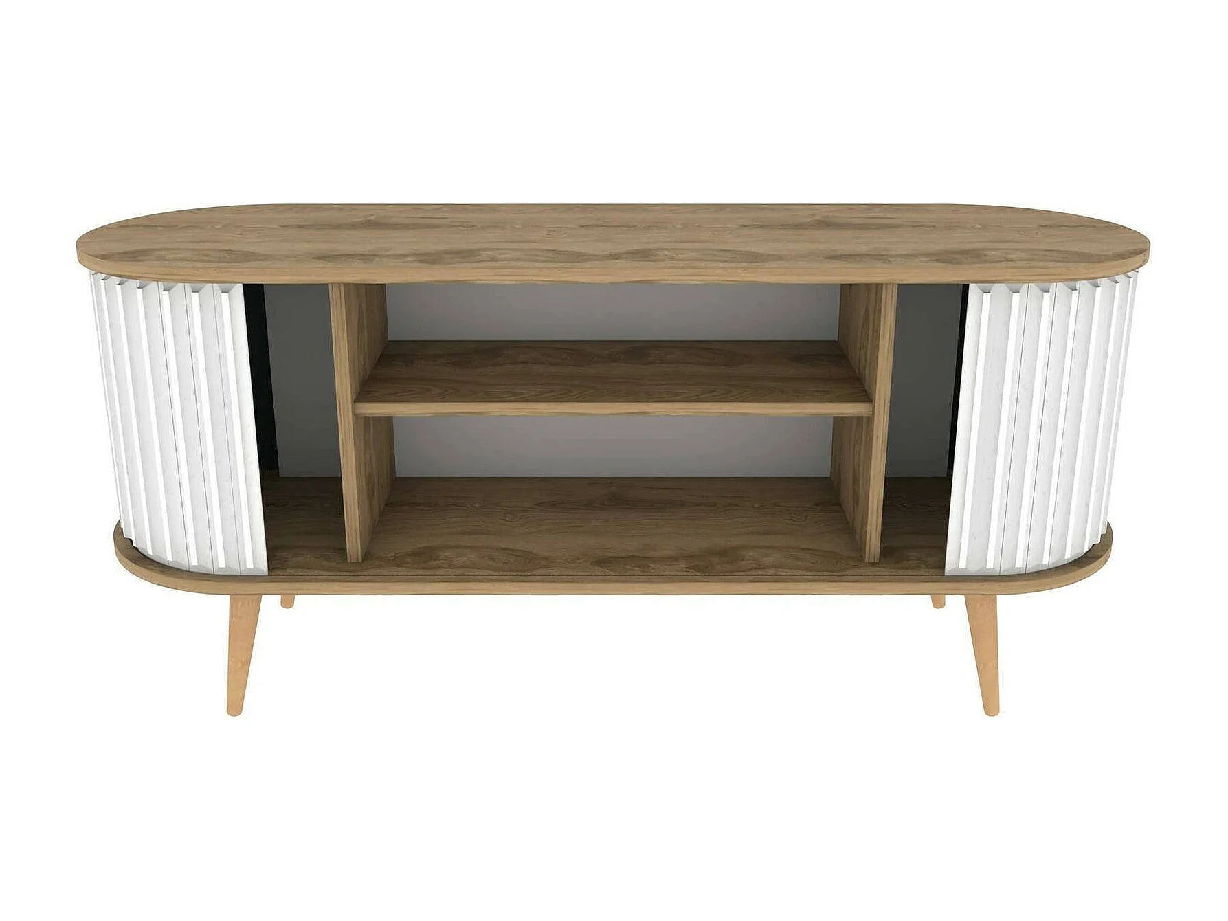 Meuble TV Aludra, Buffet de salon, Armoire basse pour TV, Base murale de rangement, 140x43h64 cm, Chêne et Blanc