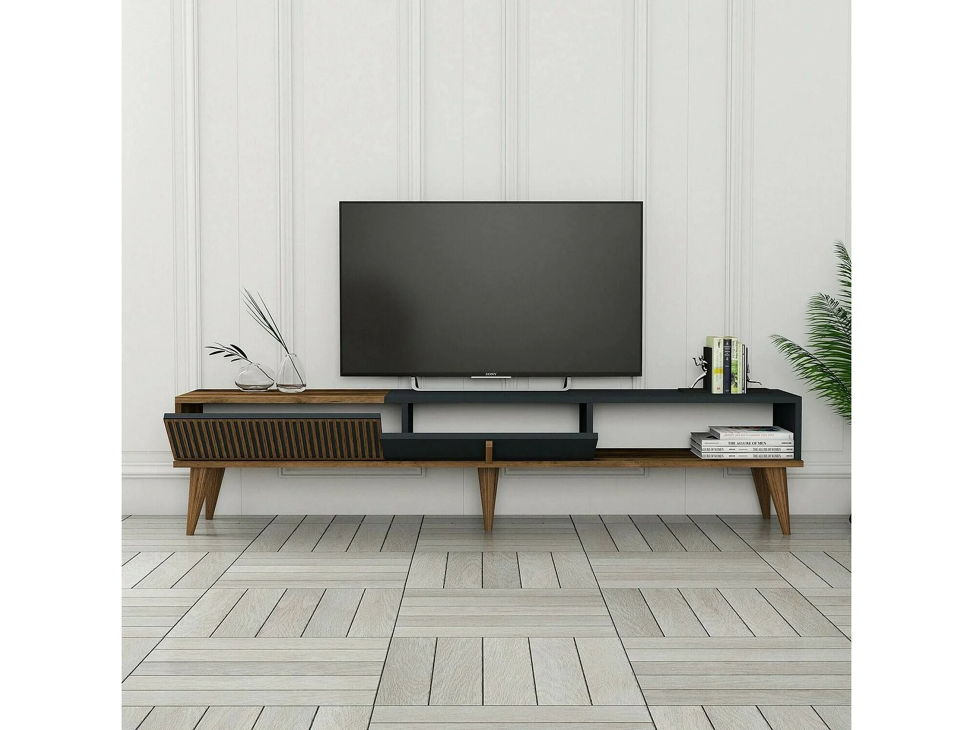 Meuble TV Aquila, Buffet de salon, Armoire basse pour TV, Base murale de rangement, 180x35h40 cm, Noyer et Anthracite