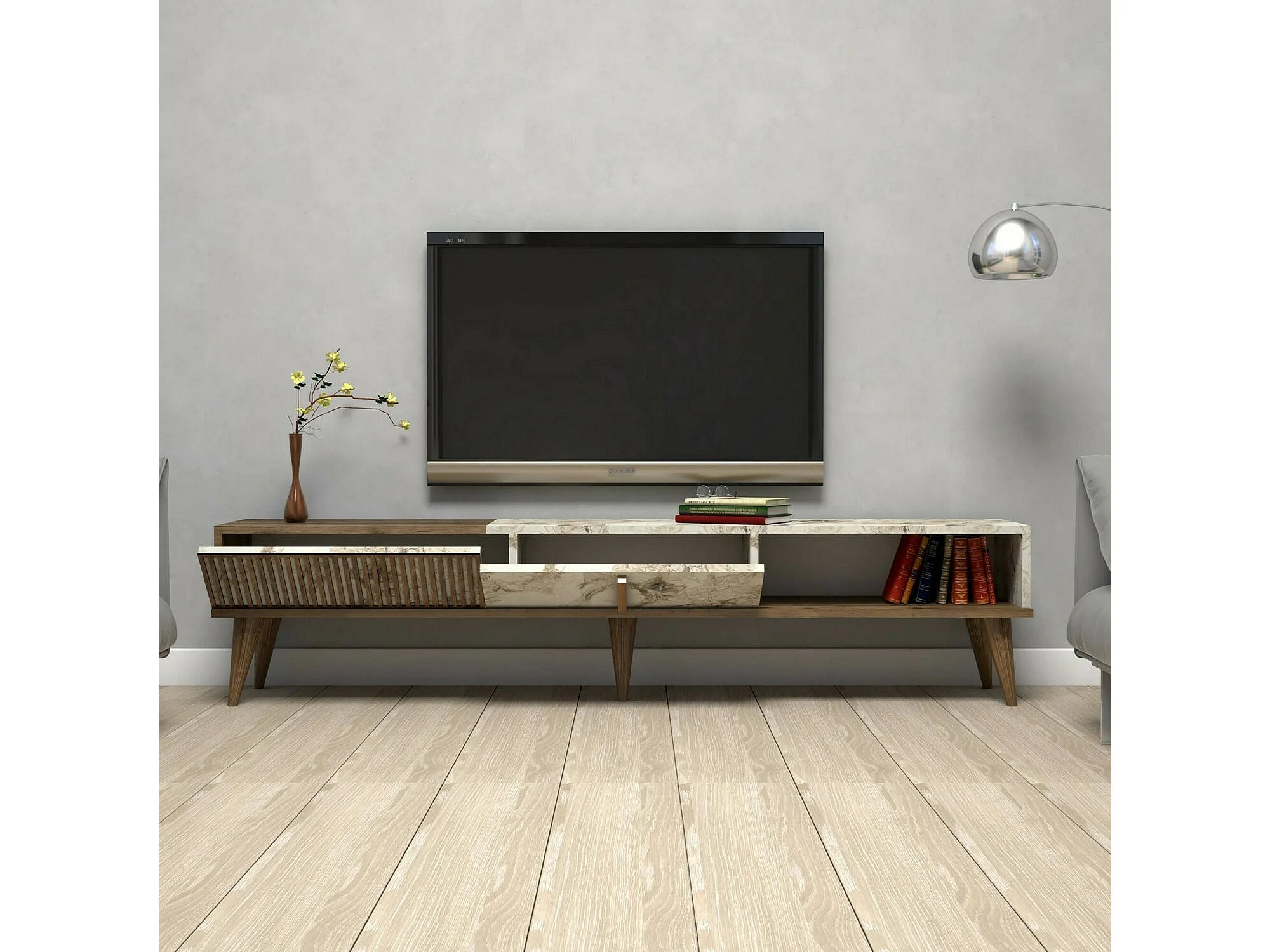 Meuble TV Aquila, Buffet de salon, Armoire basse pour TV, Base murale de rangement, 180x35h40 cm, Noyer et Blanc