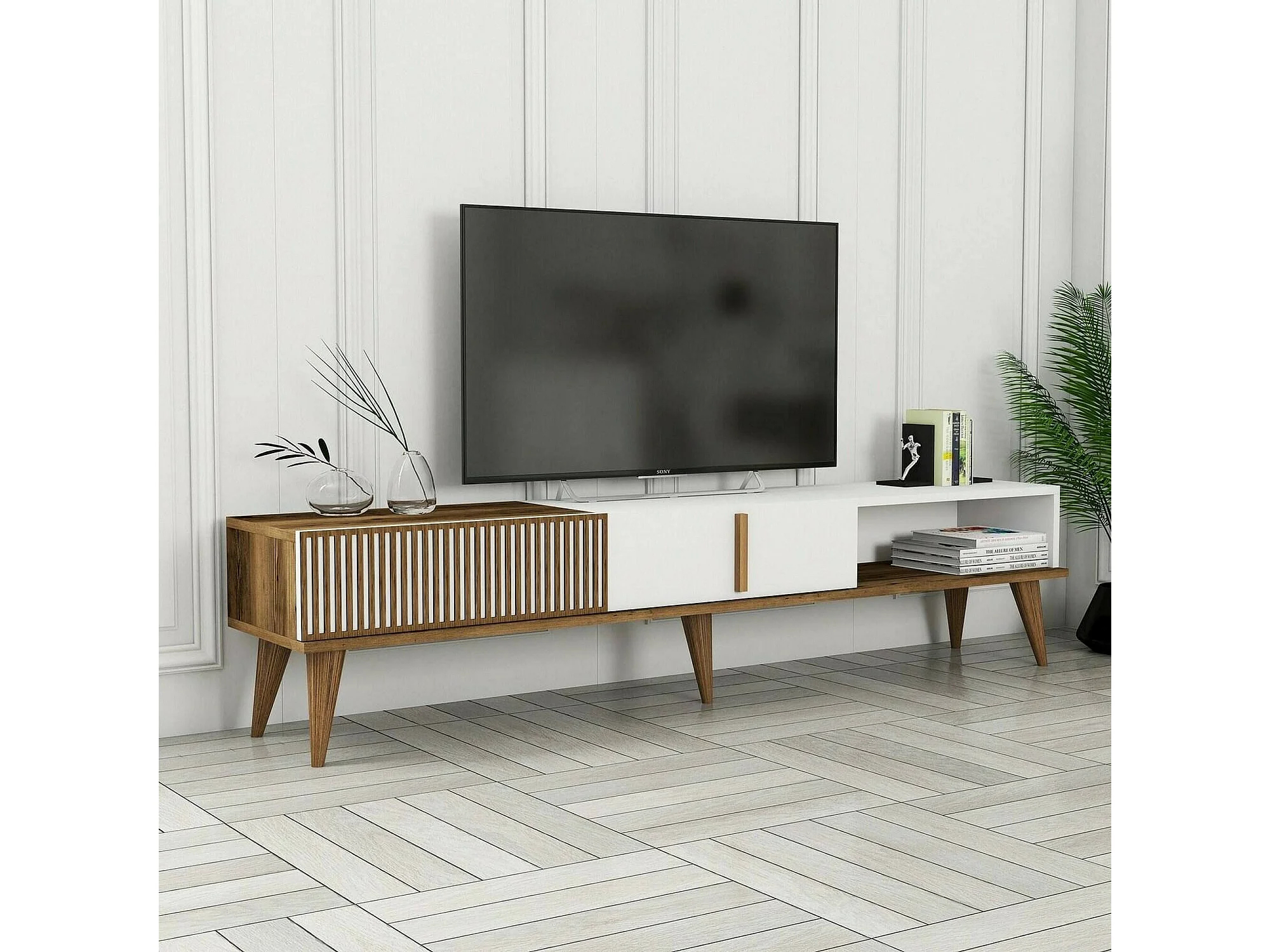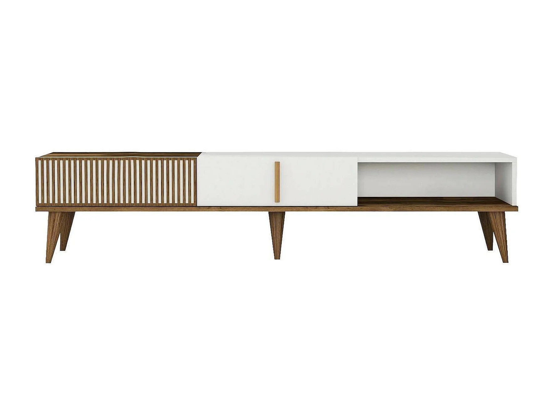 Meuble TV Aquila, Buffet de salon, Armoire basse pour TV, Base murale de rangement, 180x35h40 cm, Noyer et Blanc