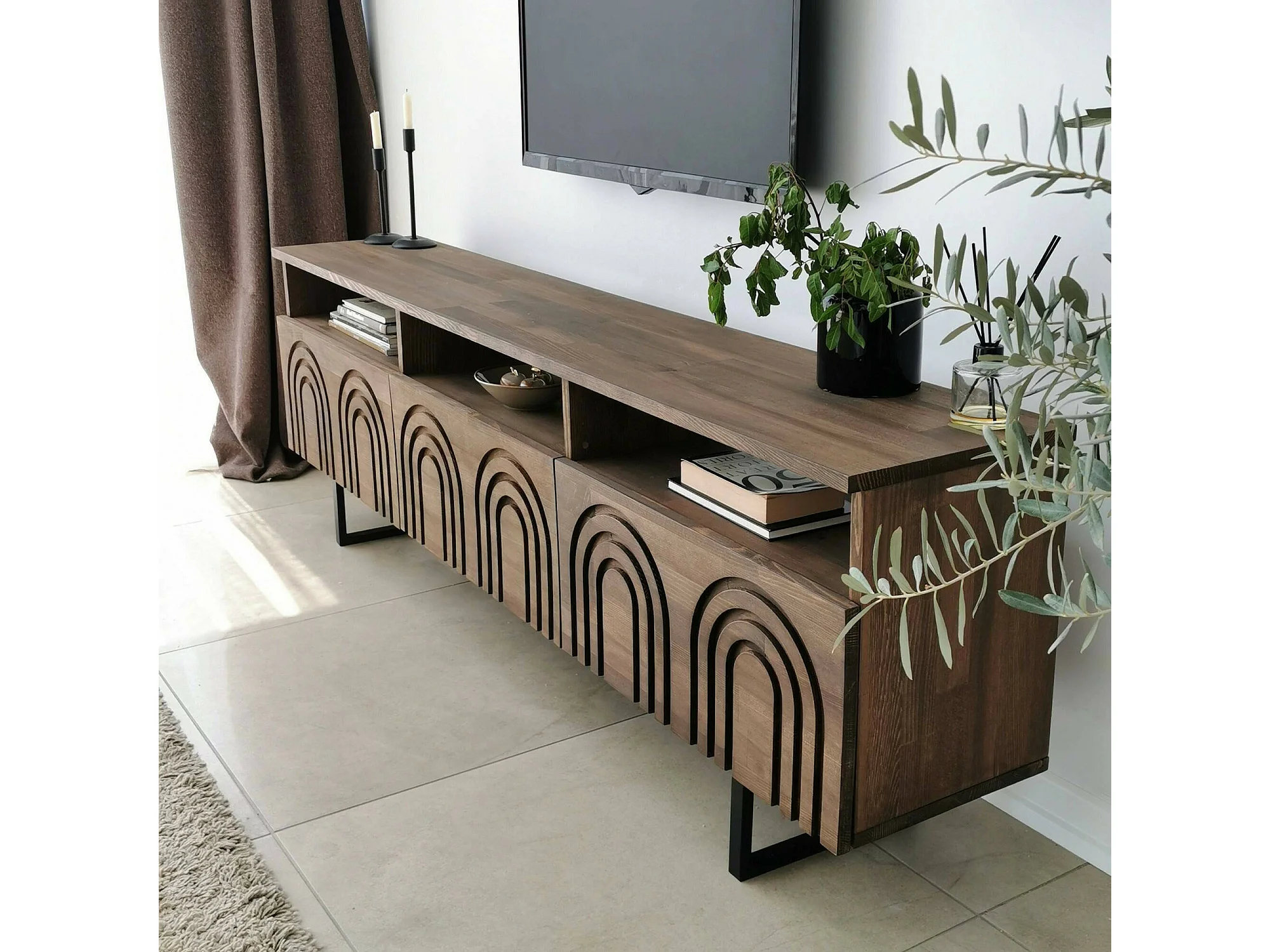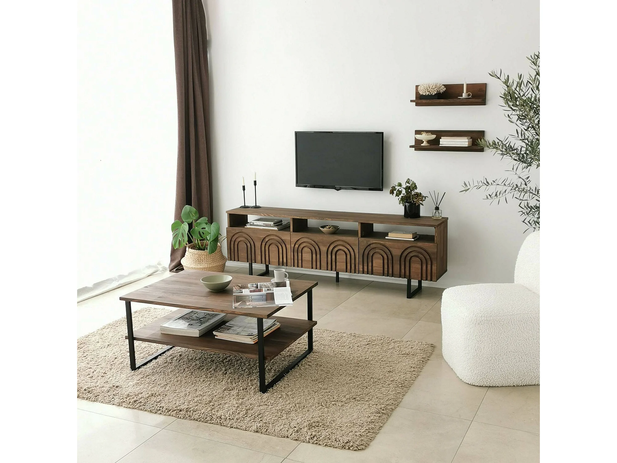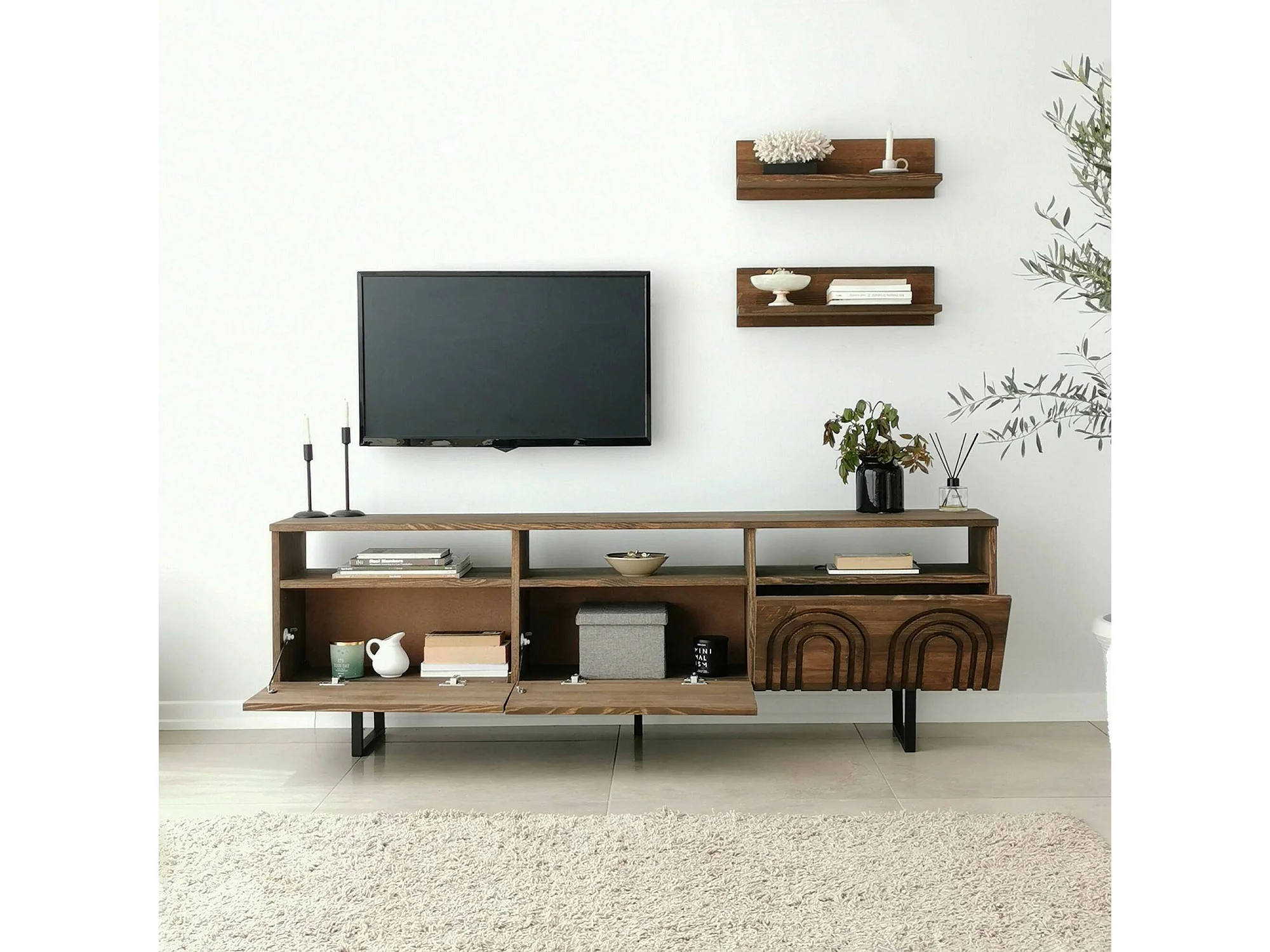 Meuble TV Arctura, Buffet de salon, Armoire basse pour TV, Base murale de rangement, 170x30h40 cm, Noyer