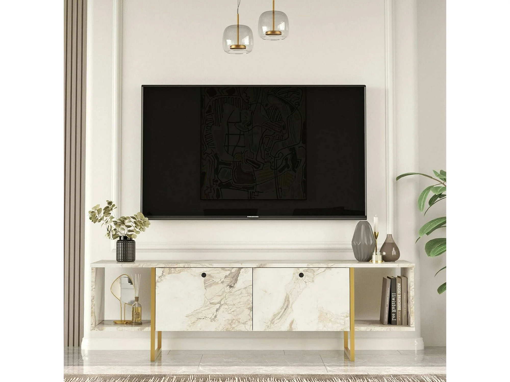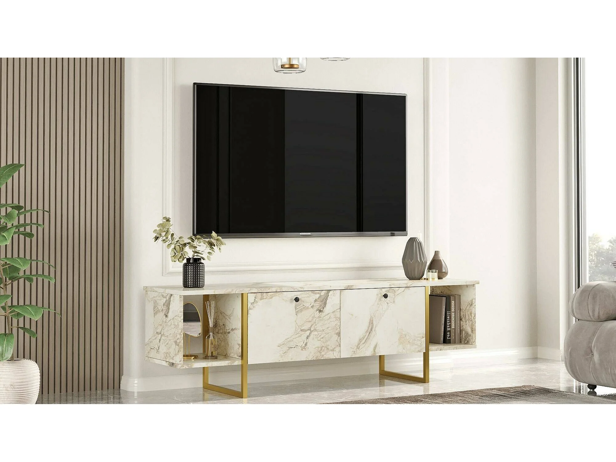 Meuble TV Arneb, Buffet de salon, Armoire basse pour TV, Base murale de rangement, 160x40h48 cm, Blanc et Or