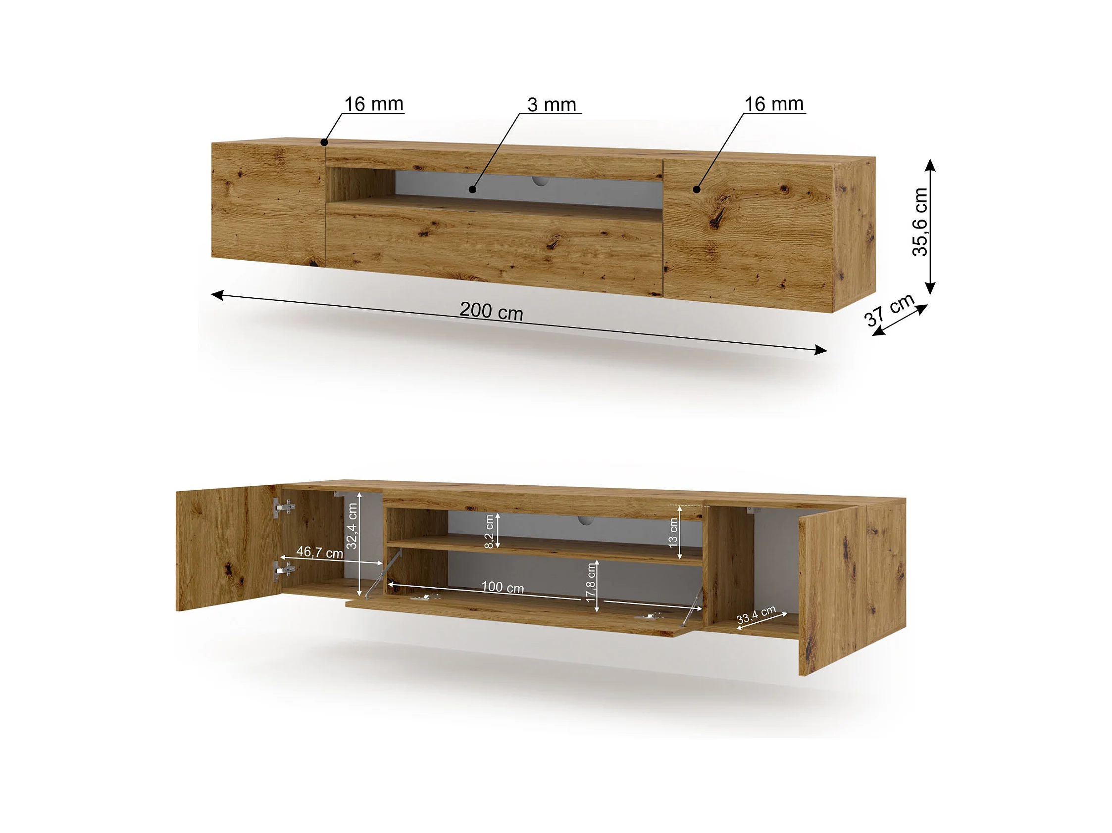 Meuble TV AURA 200 cm suspendu ou debout chêne artisanal + LED