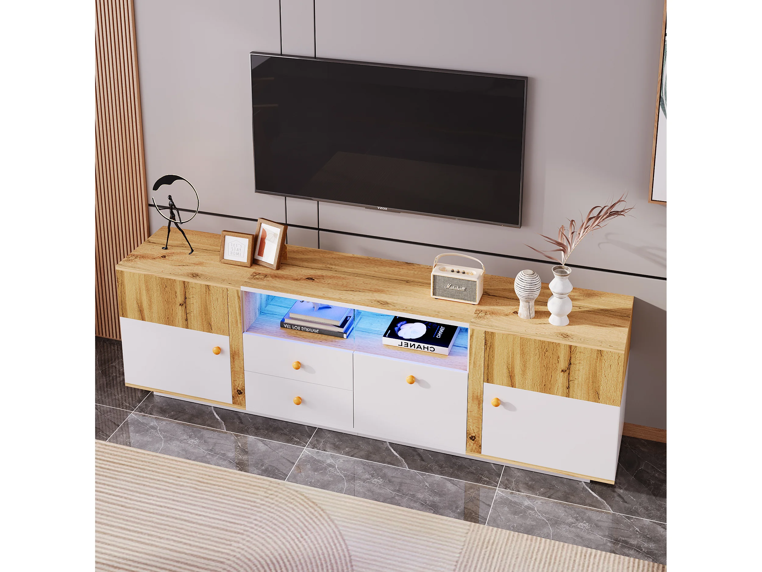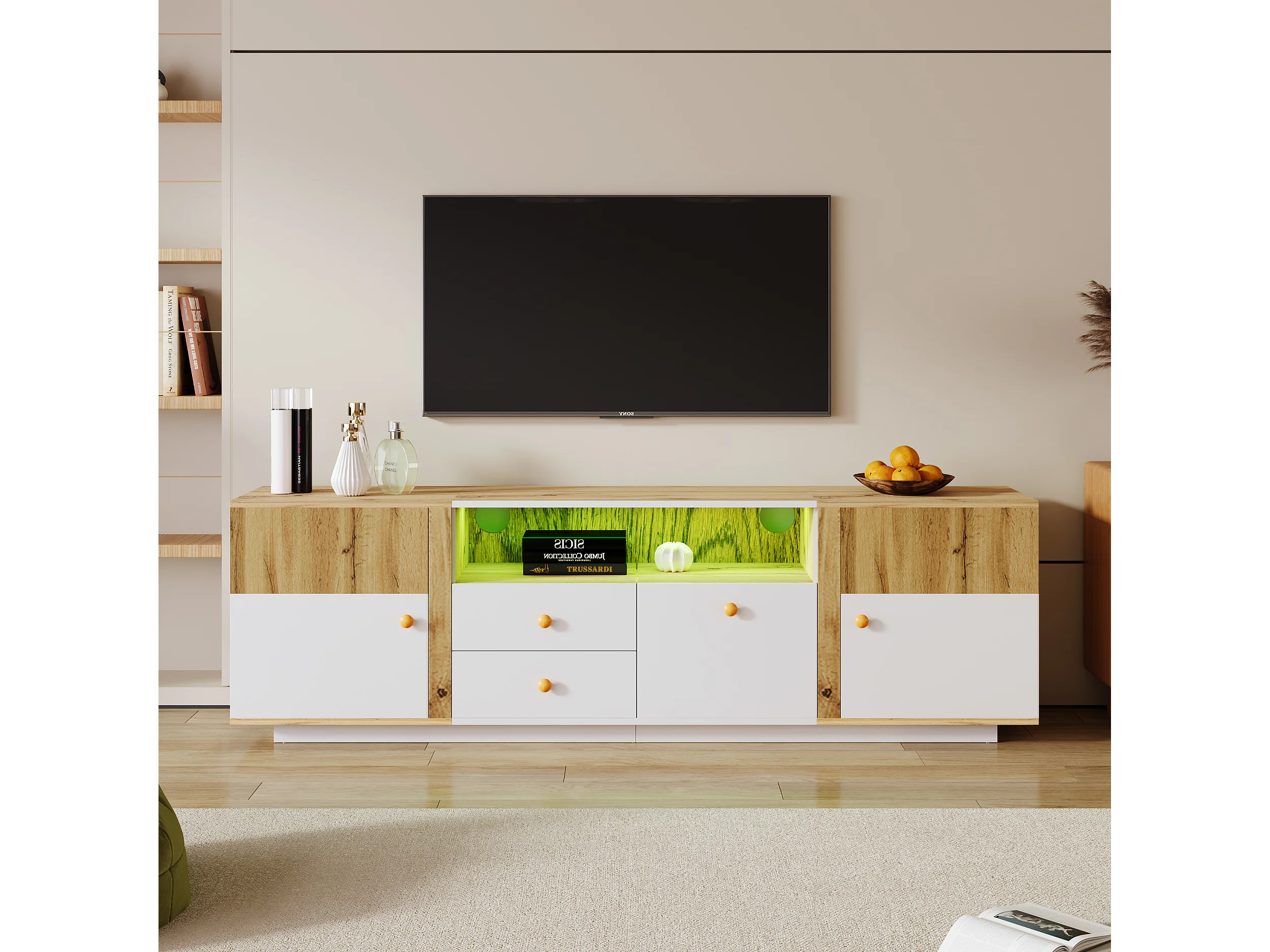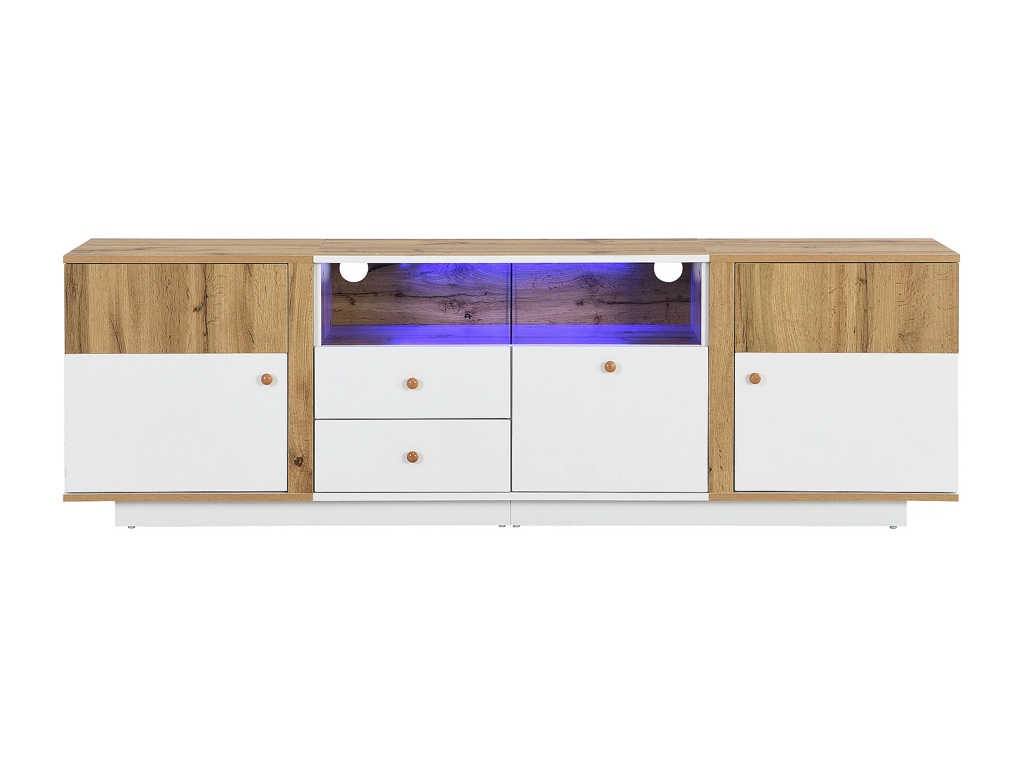 Meuble TV avec 2 portes, 3 tiroirs & 2 niches - LEDs - Panneaux de particules - Chêne et blanc