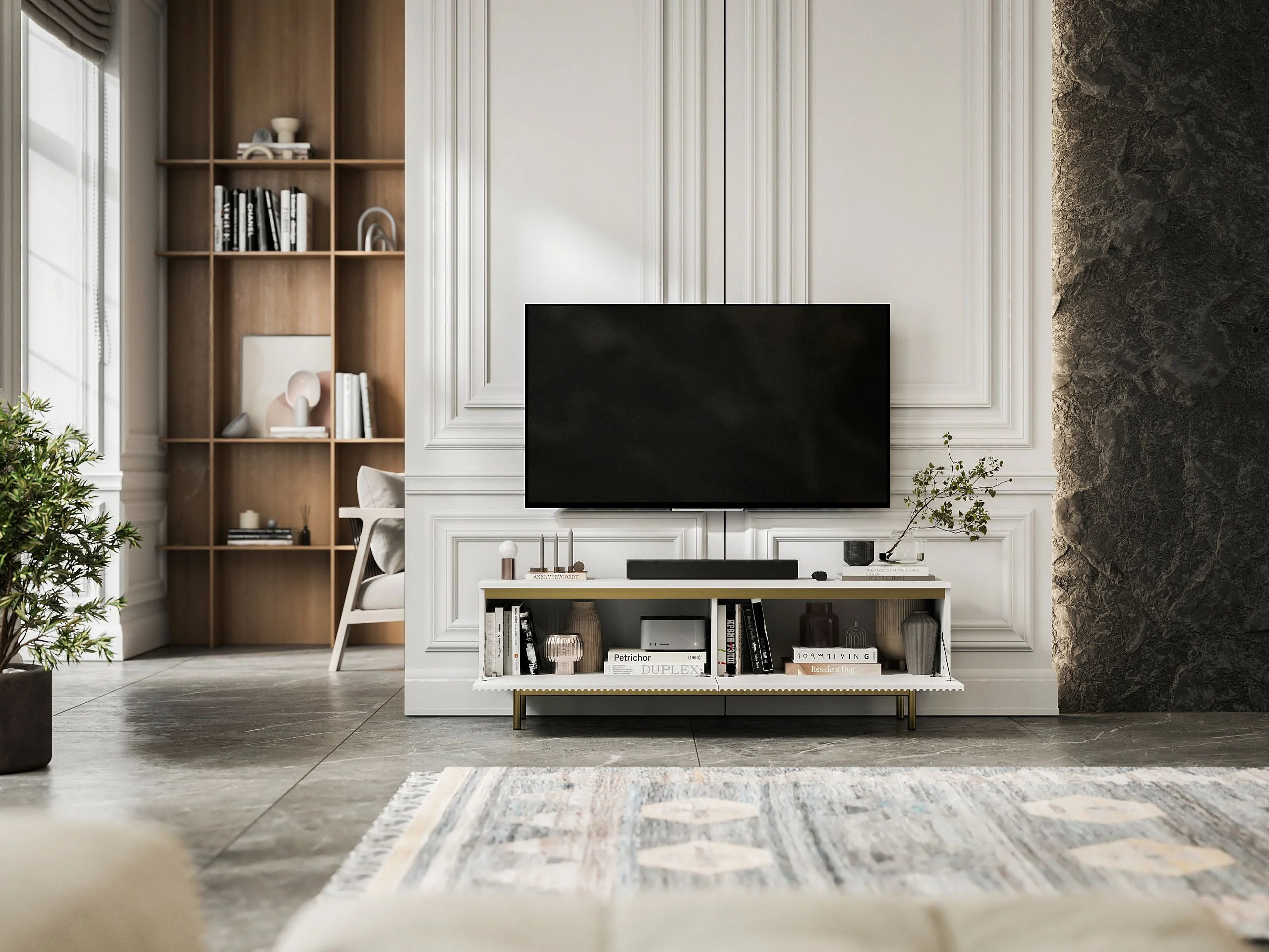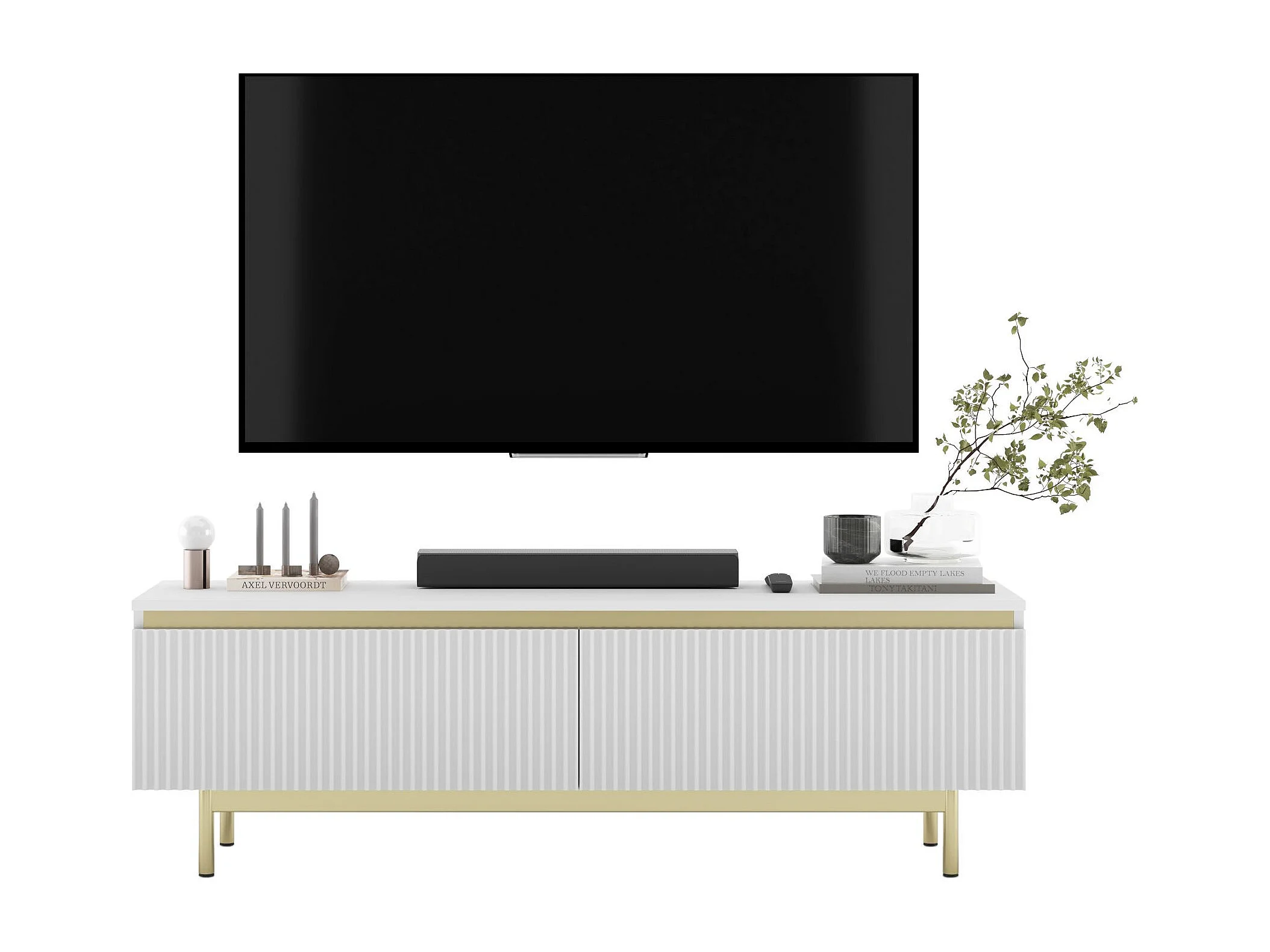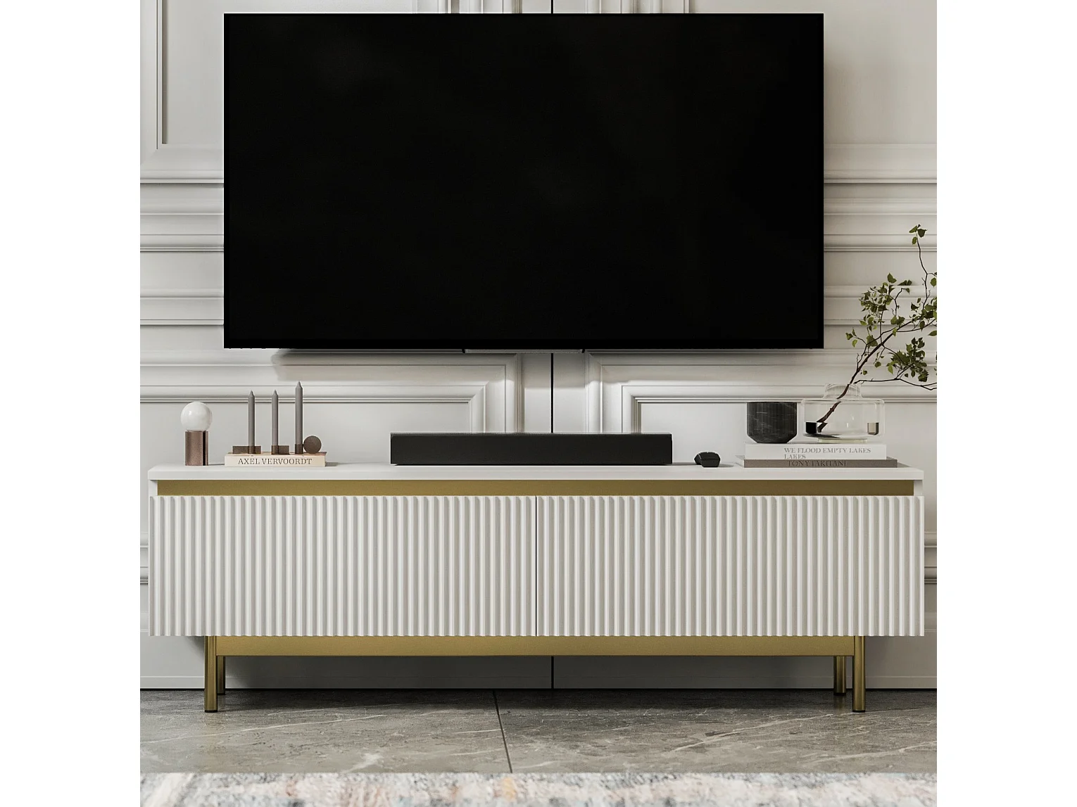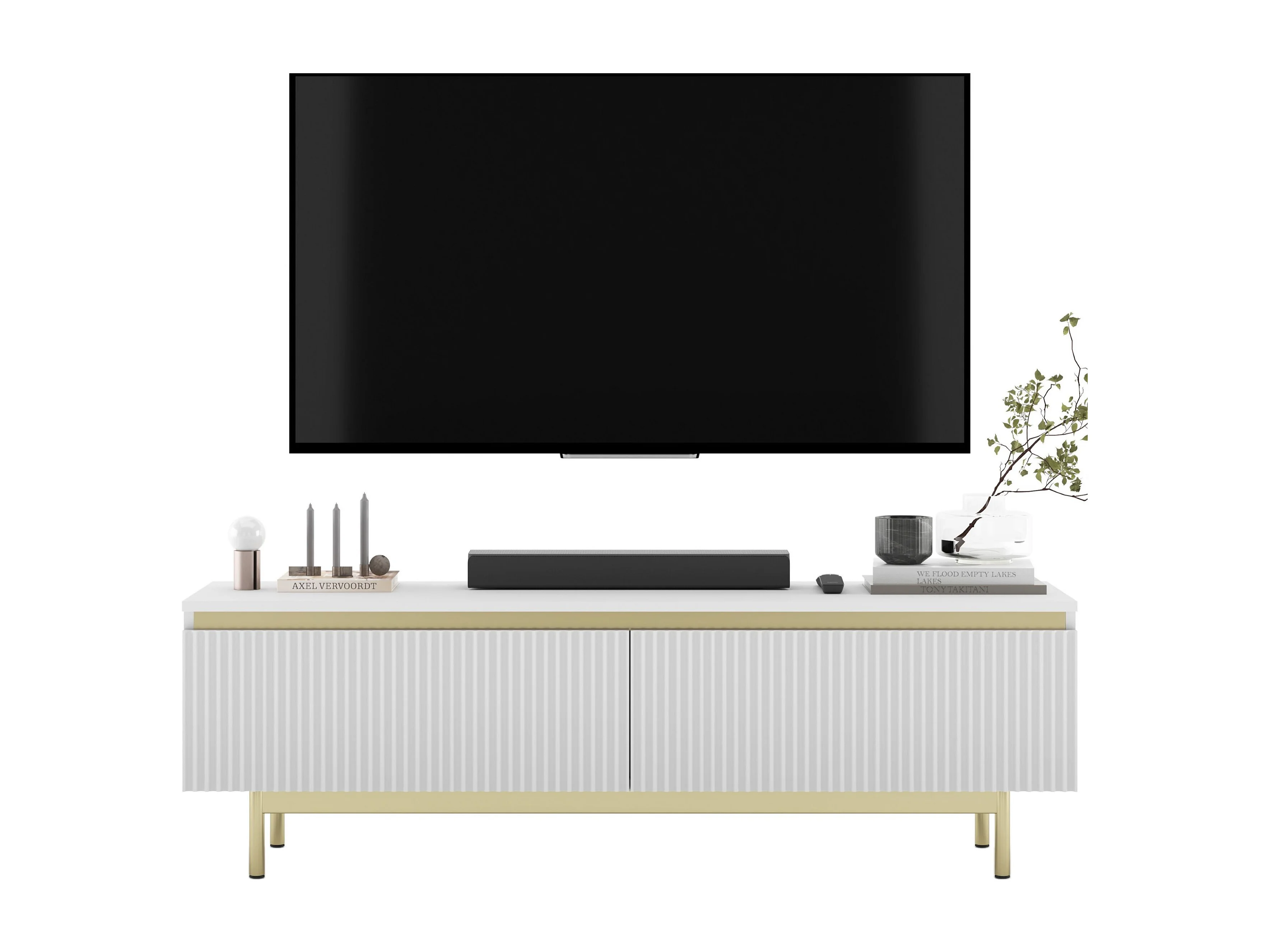 Meuble TV avec 2 portes - Corps Blanc mat, façades rainurées Blanc mat - Cadre en métal doré, 140 cm