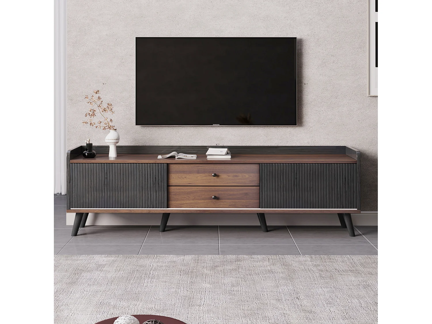 Meuble TV avec 2 tiroirs et 2 portes coulissantes, porte rayée, noir et bois