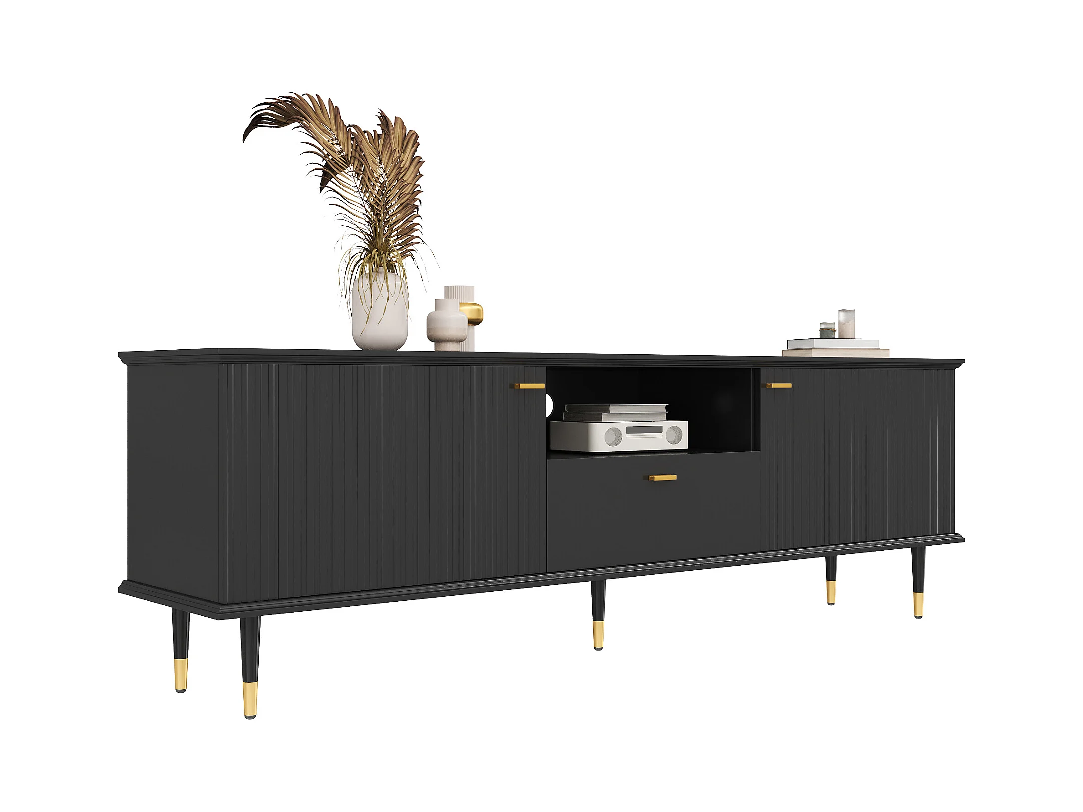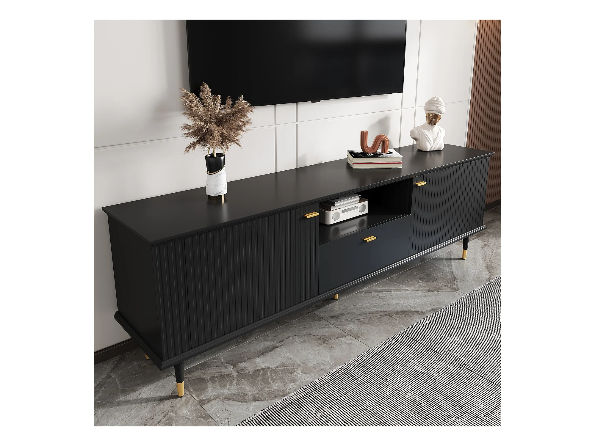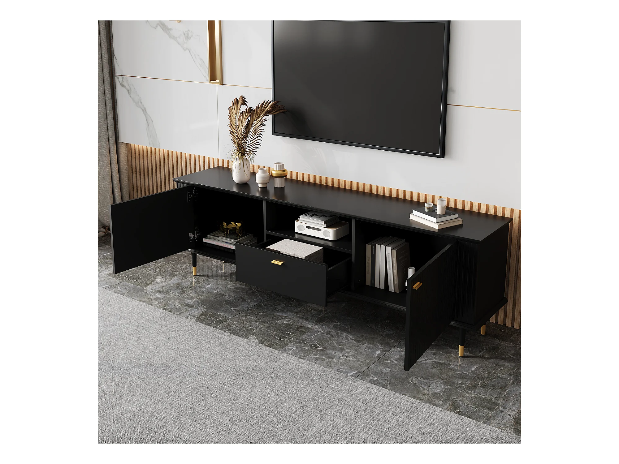 Meuble TV avec 3 portes, grilles décoratives, poignées et pieds dorés, MDF, noir (170x36x54 cm)