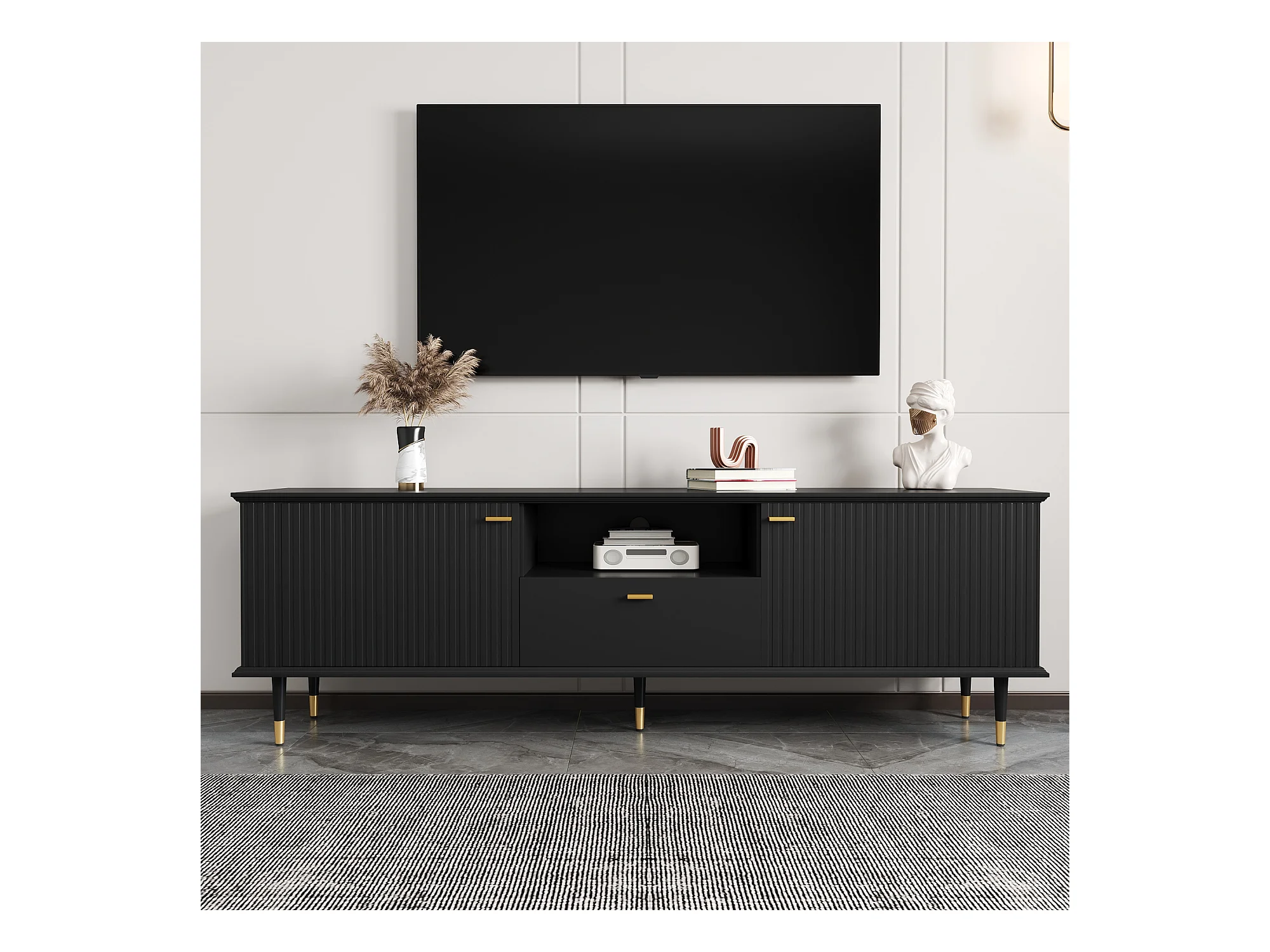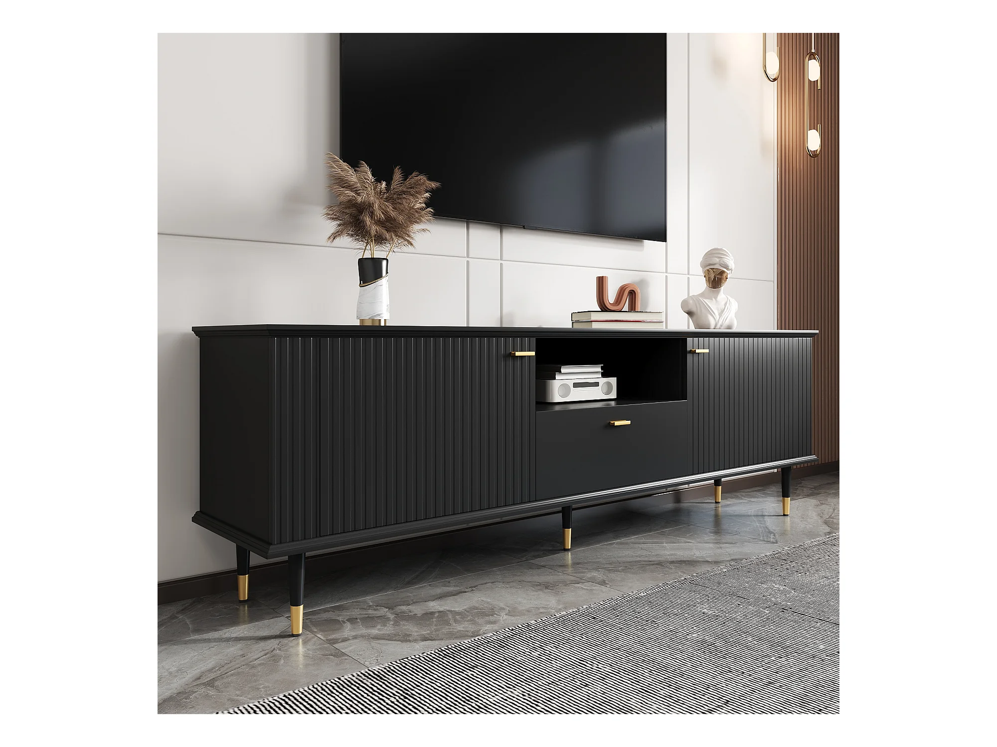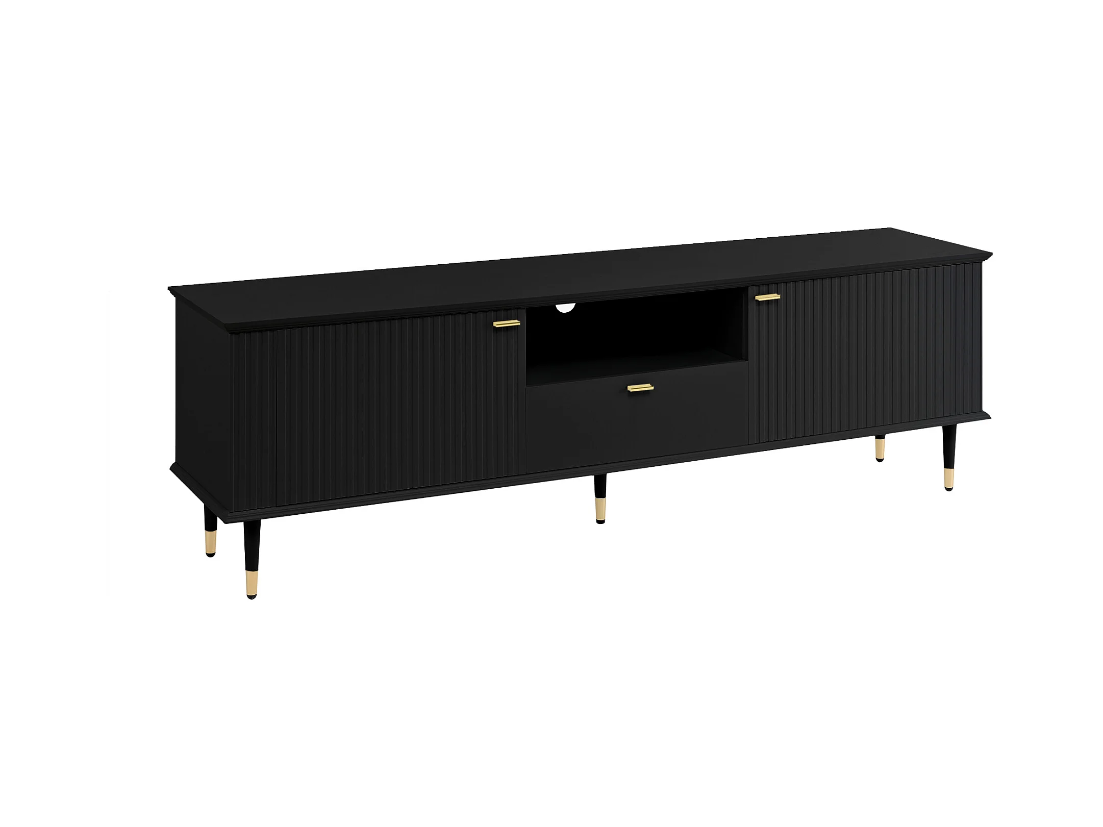 Meuble TV avec 3 portes, grilles décoratives, poignées et pieds dorés, MDF, noir (170x36x54 cm)