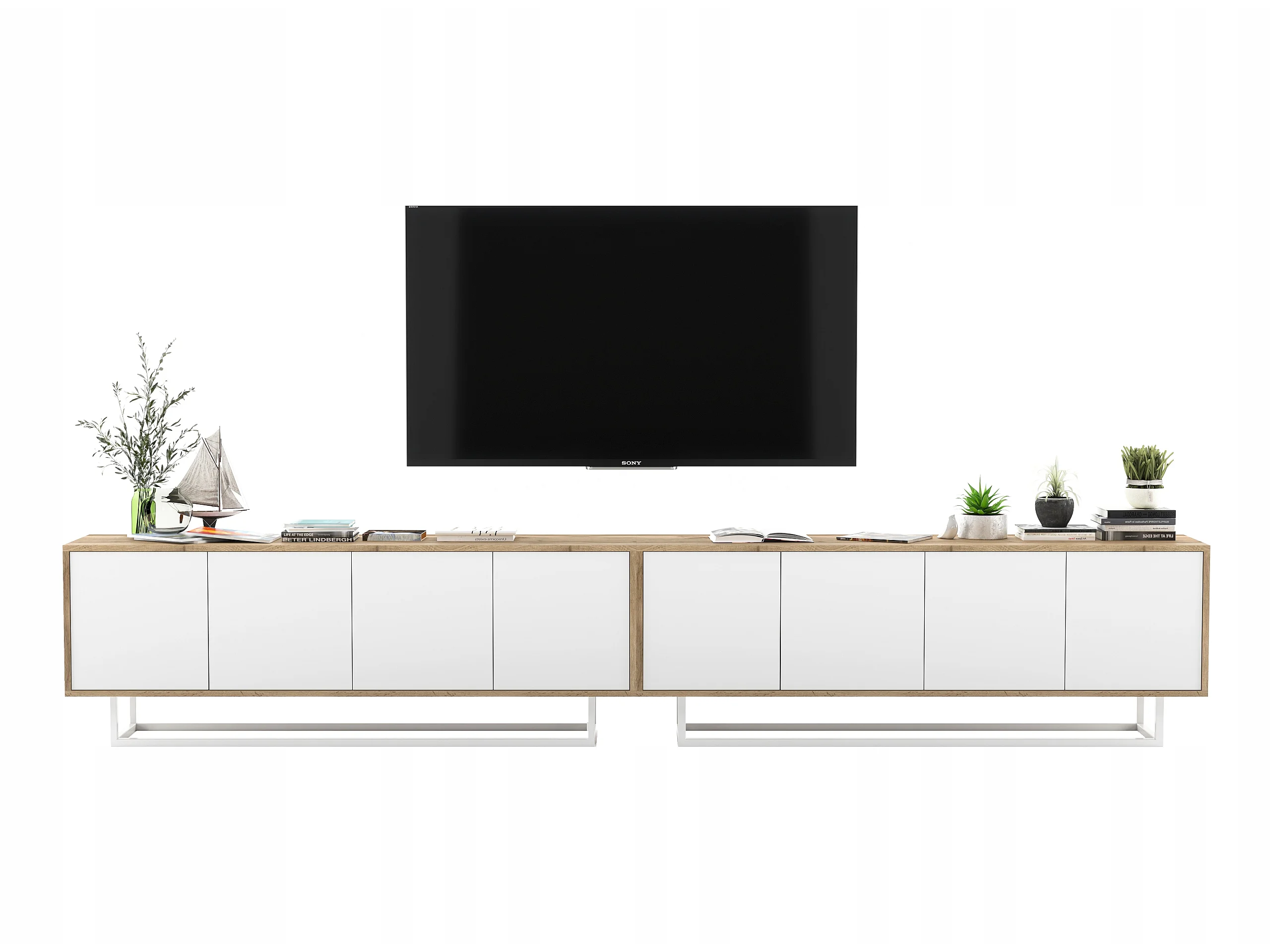 Meuble TV avec 8 portes - carcasse chêne wotan façades blanc mat - 300 cm, cadre métallique