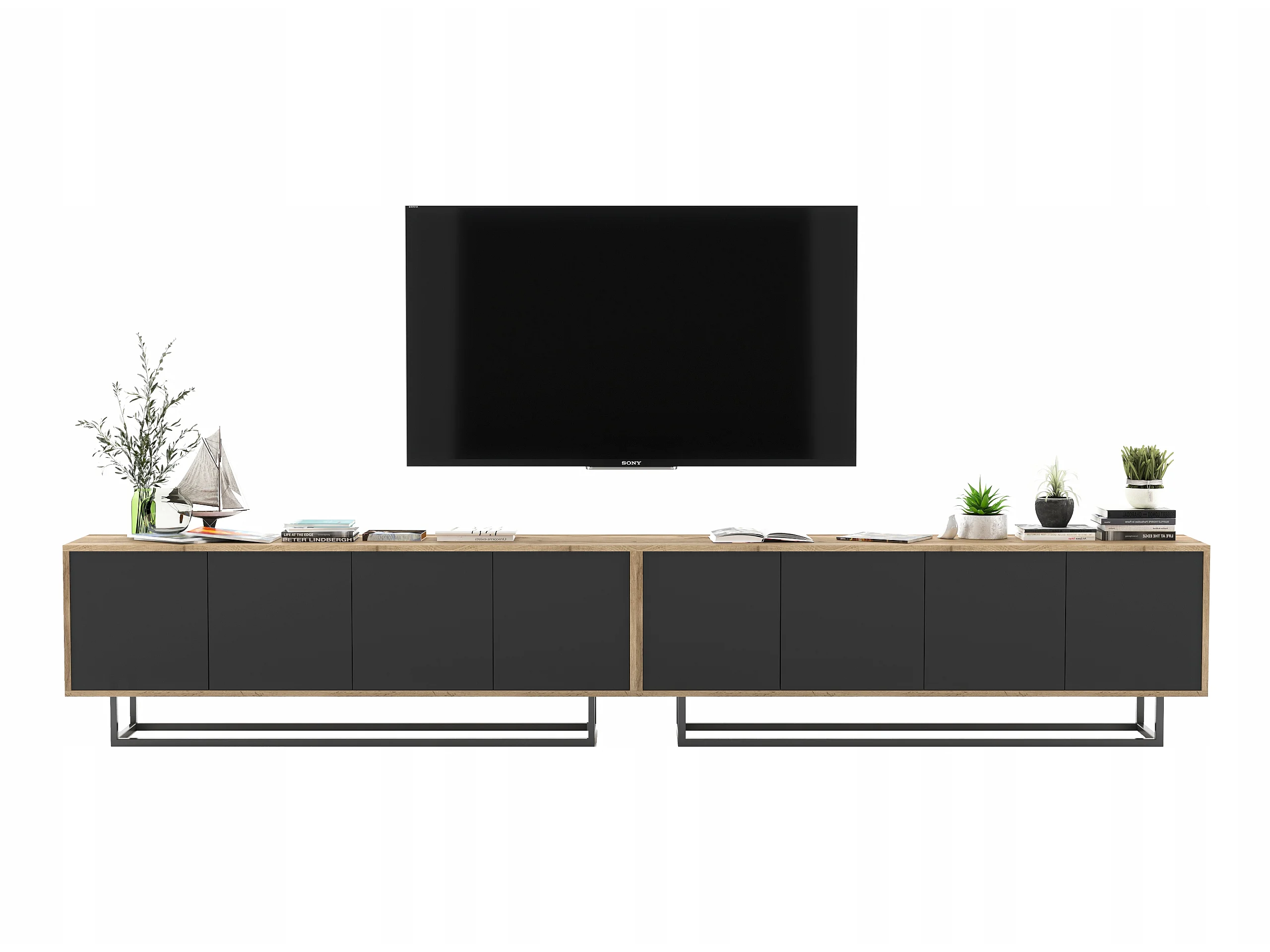 Meuble TV avec 8 portes - carcasse chêne wotan façades noir mat - 300 cm, cadre métallique