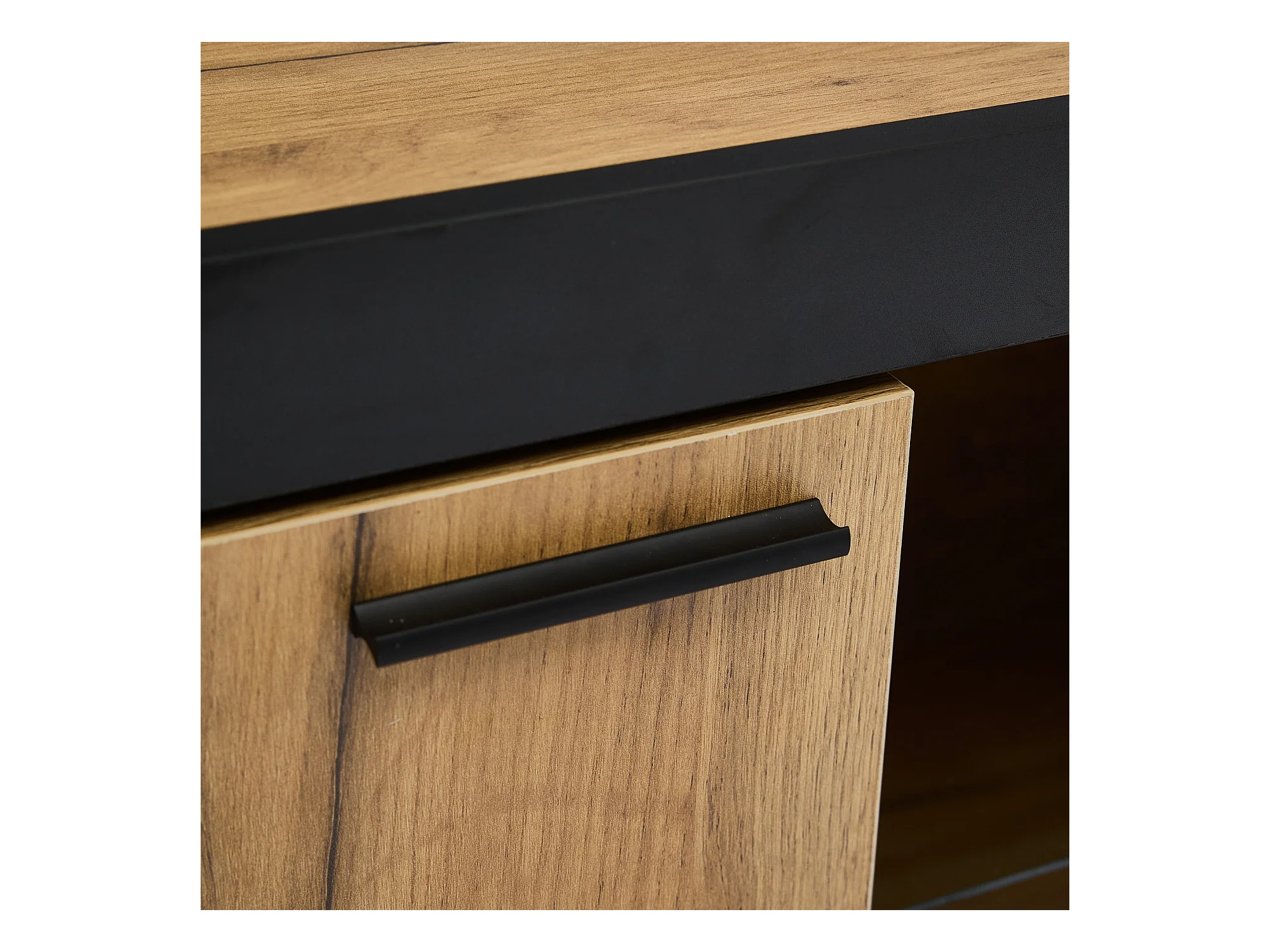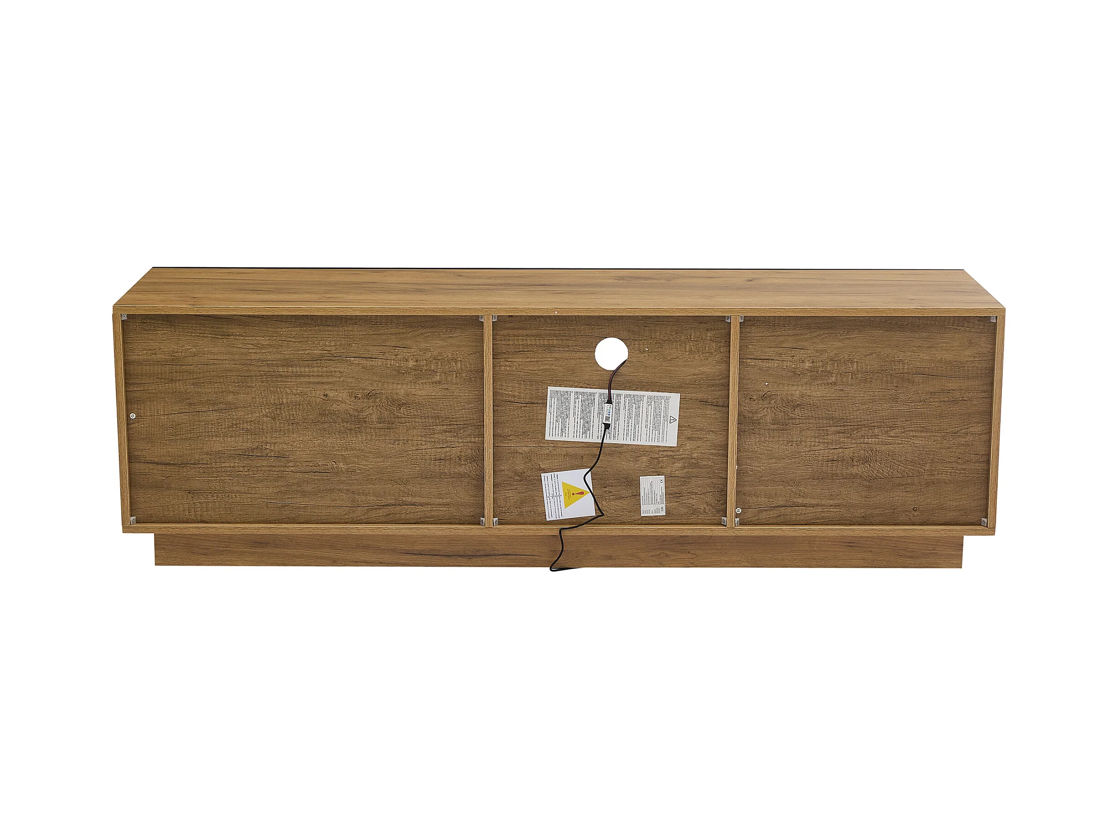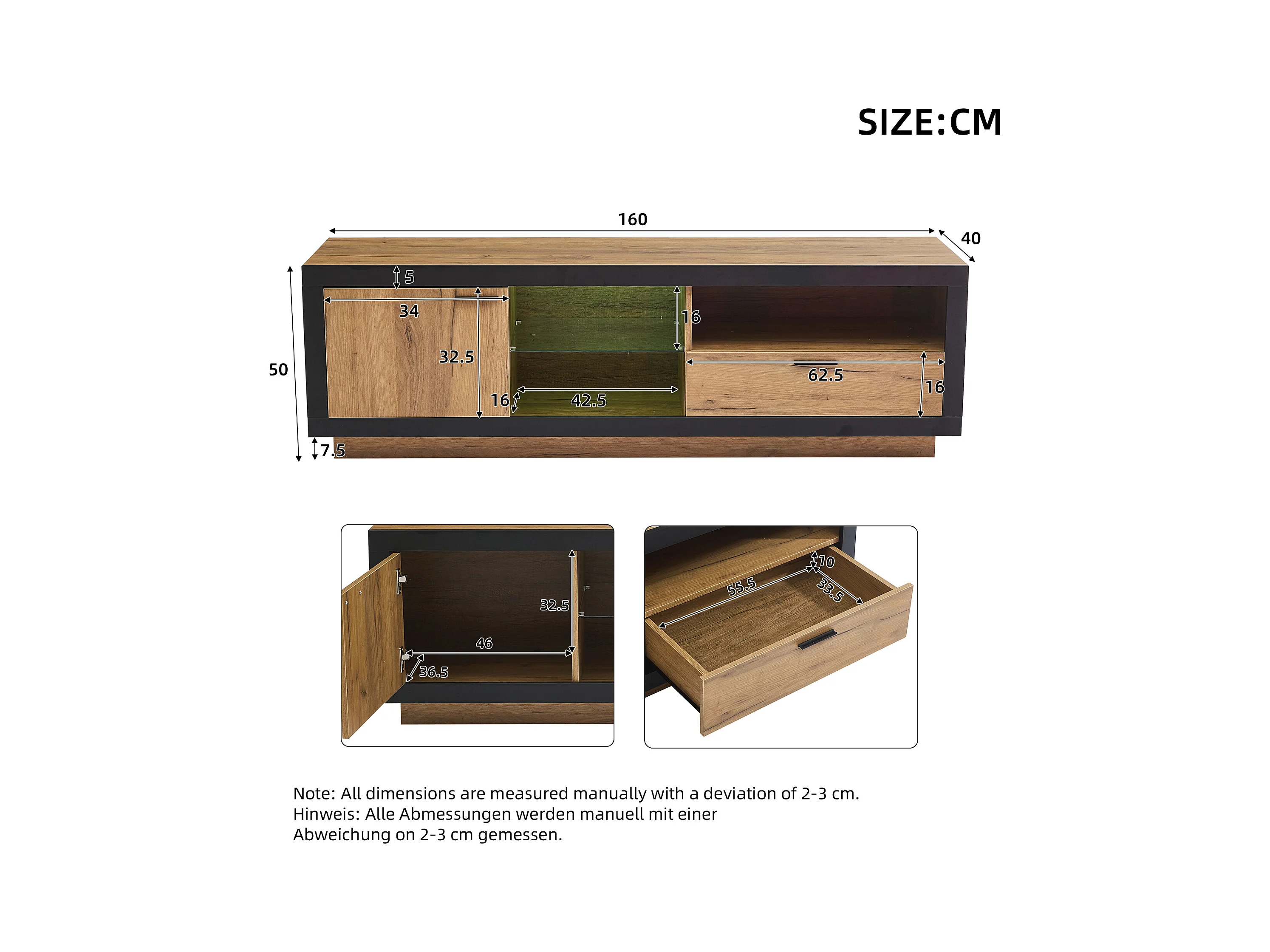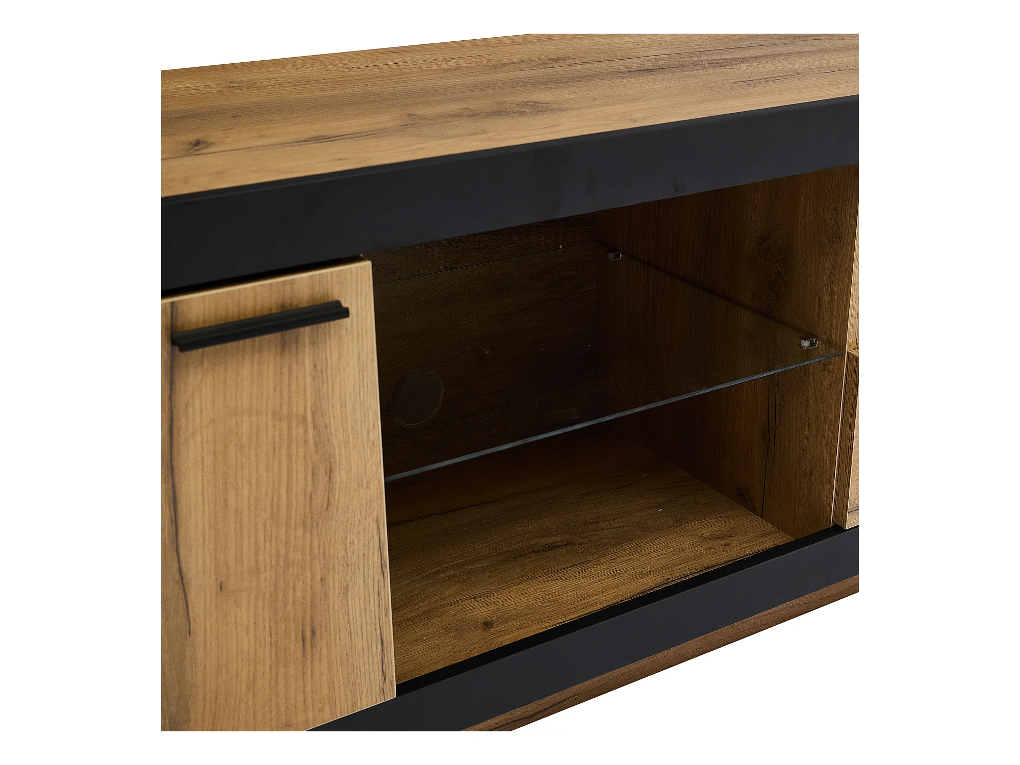 Meuble TV avec étagères en verre - 160 x 40 x 50 cm - avec Leds + porte + tiroir - aggloméré - naturel