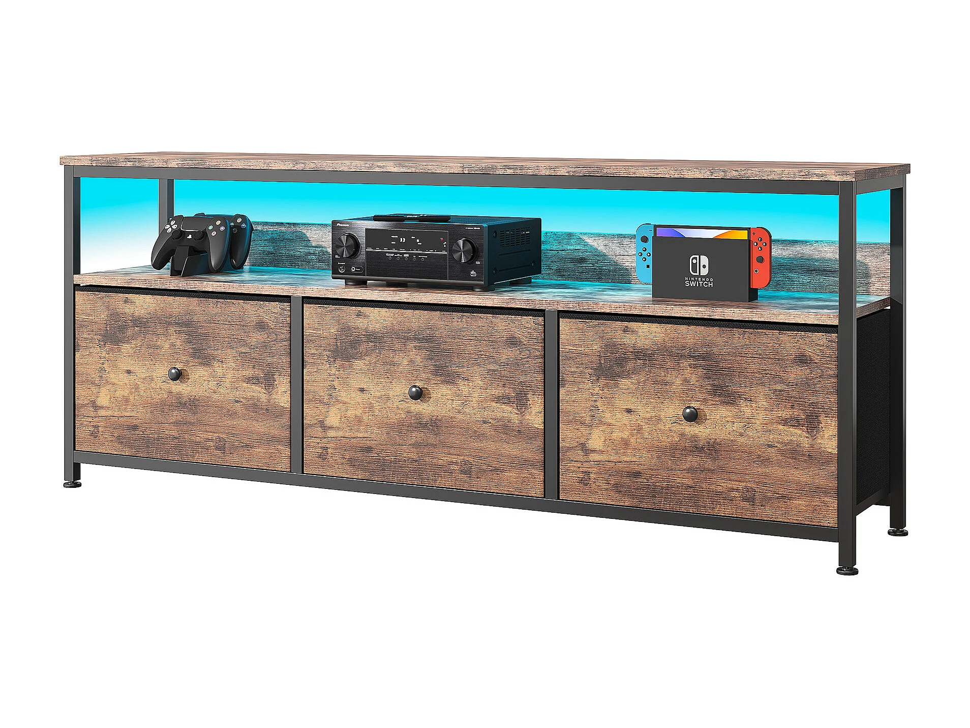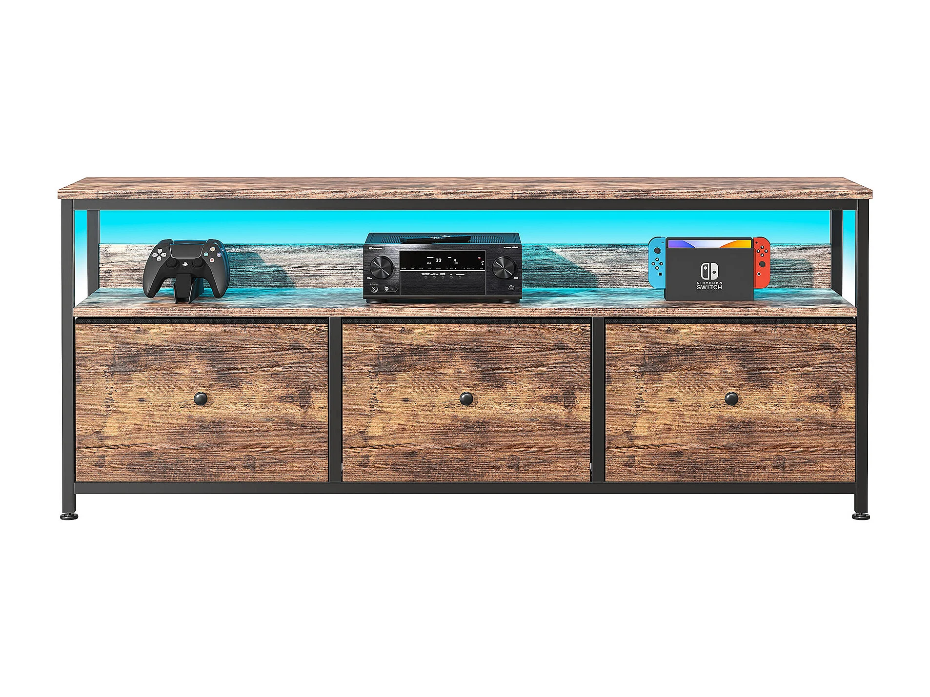 Meuble TV avec LED RGB, 3 tiroirs en tissu vintage, structure en métal – 108 x 30 x 57 cm, étagère réglable