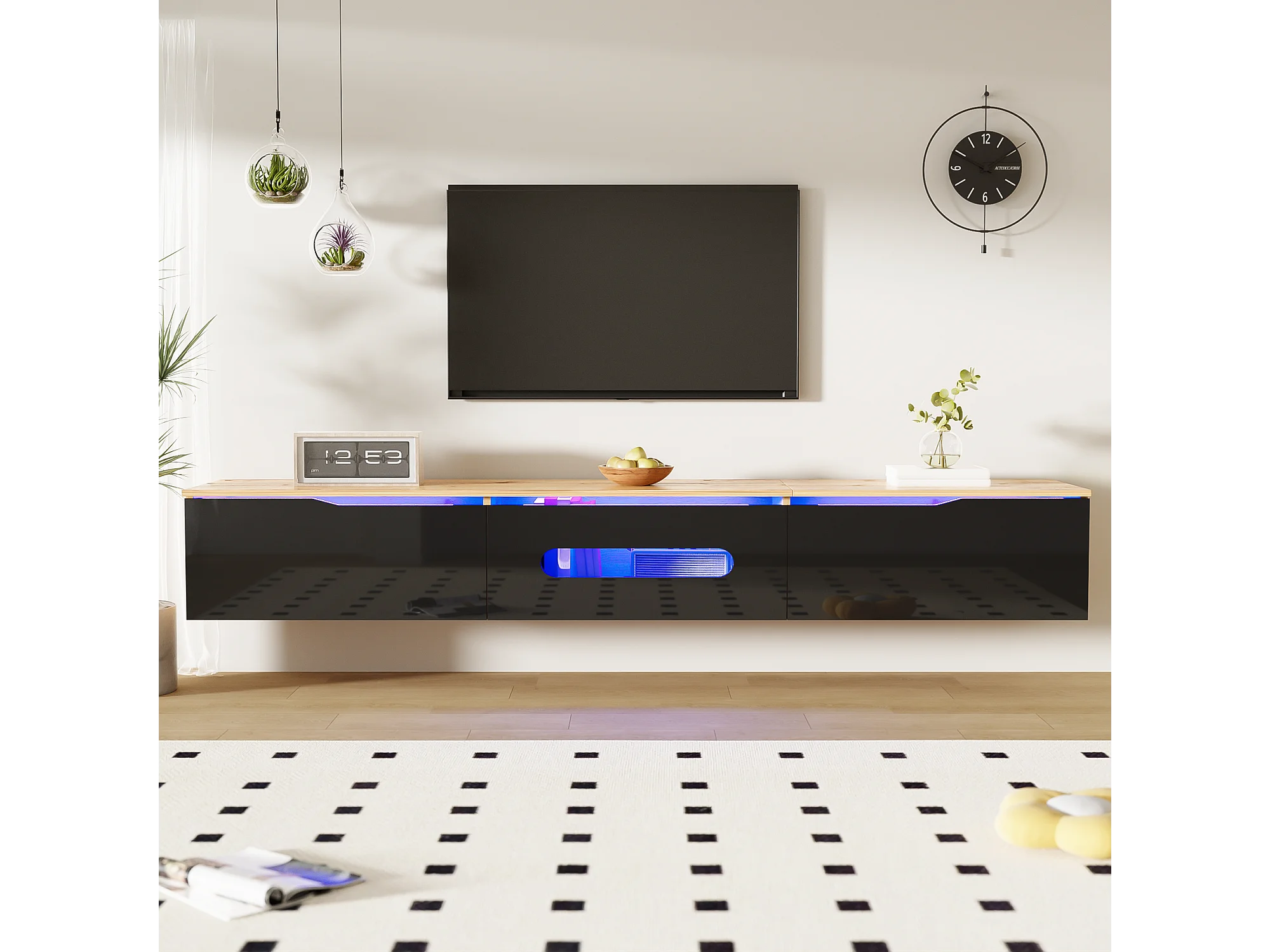 Meuble TV avec surface laquée, 16 couleurs LED, montage mural, design moderne, noir et bois, (180x35x30cm)