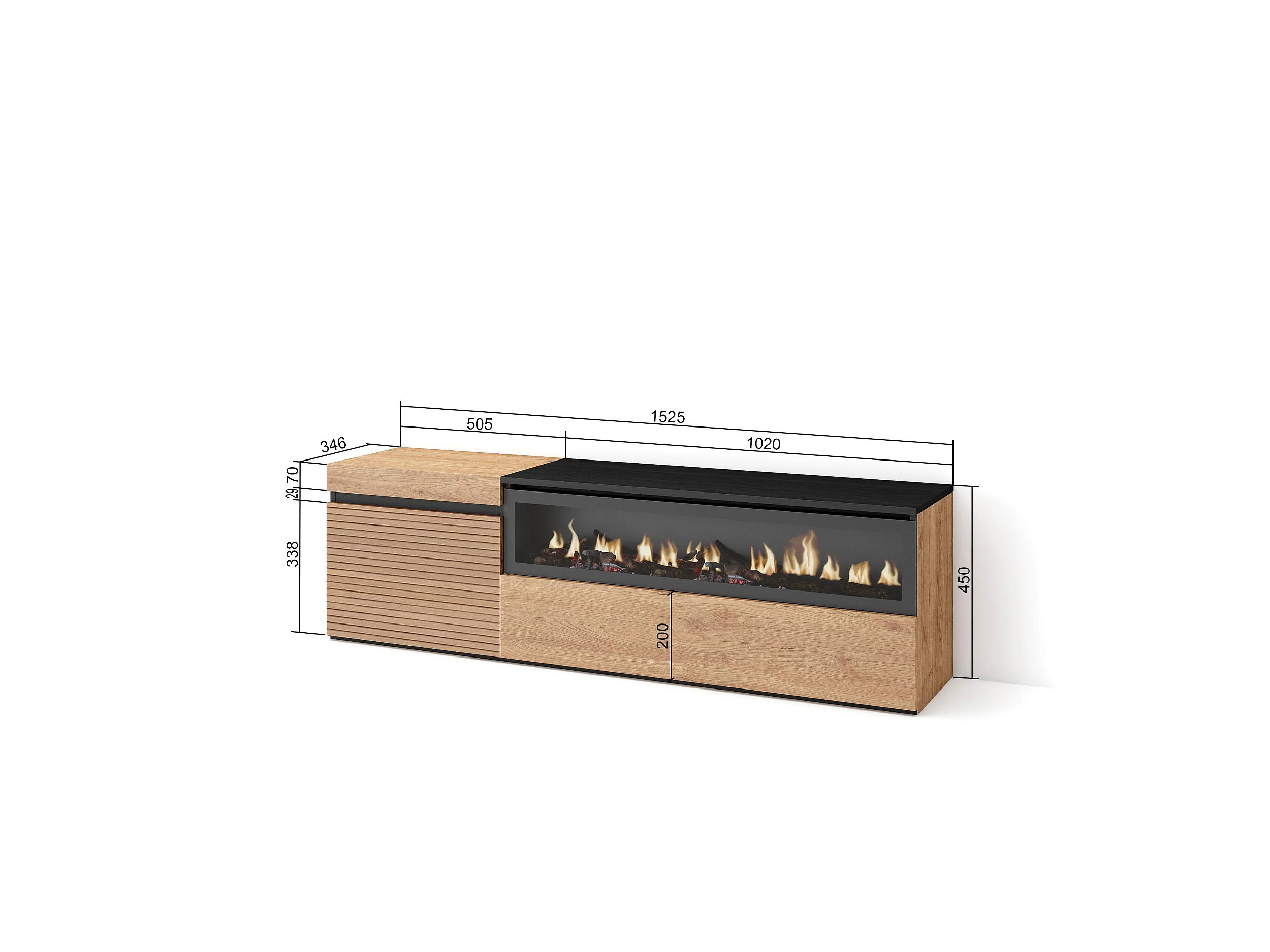 Meuble TV, Banc Télé, 150x35x45cm, Pour les TV jusqu'à 65", Cheminée électrique, Chêne