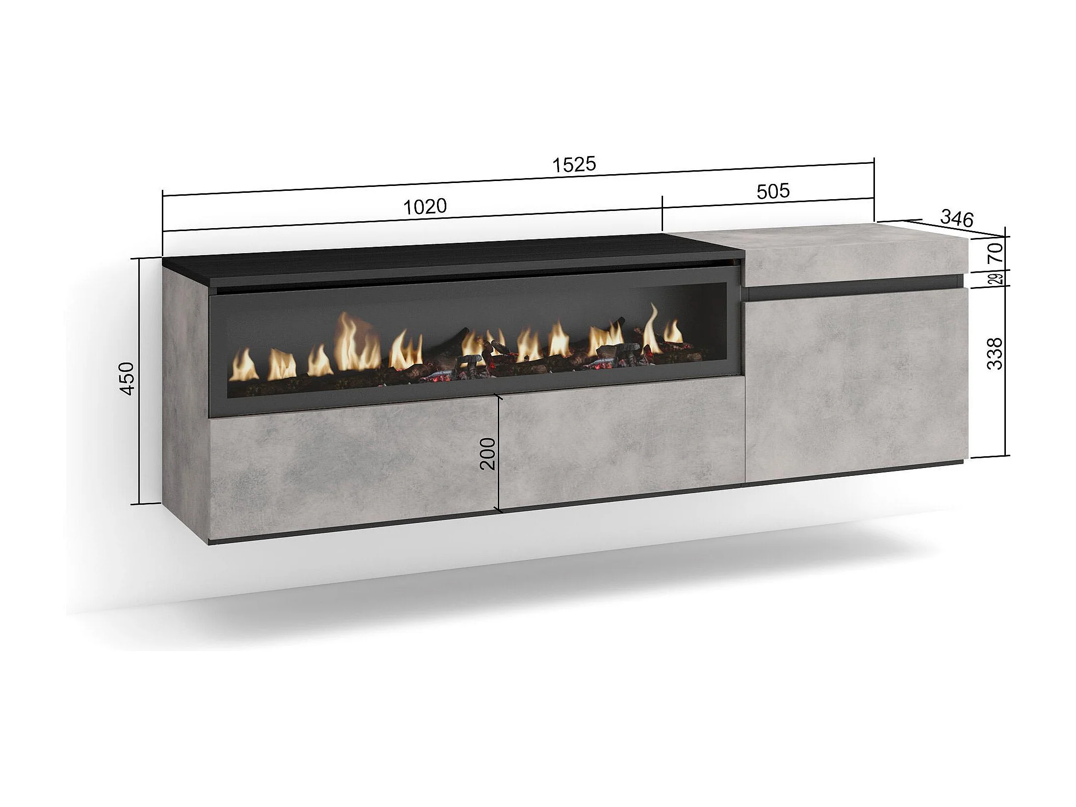 Meuble TV, Banc Télé, 150x35x45cm, Pour les TV jusqu'à 65", Cheminée électrique, Suspendu, Mural, Ciment