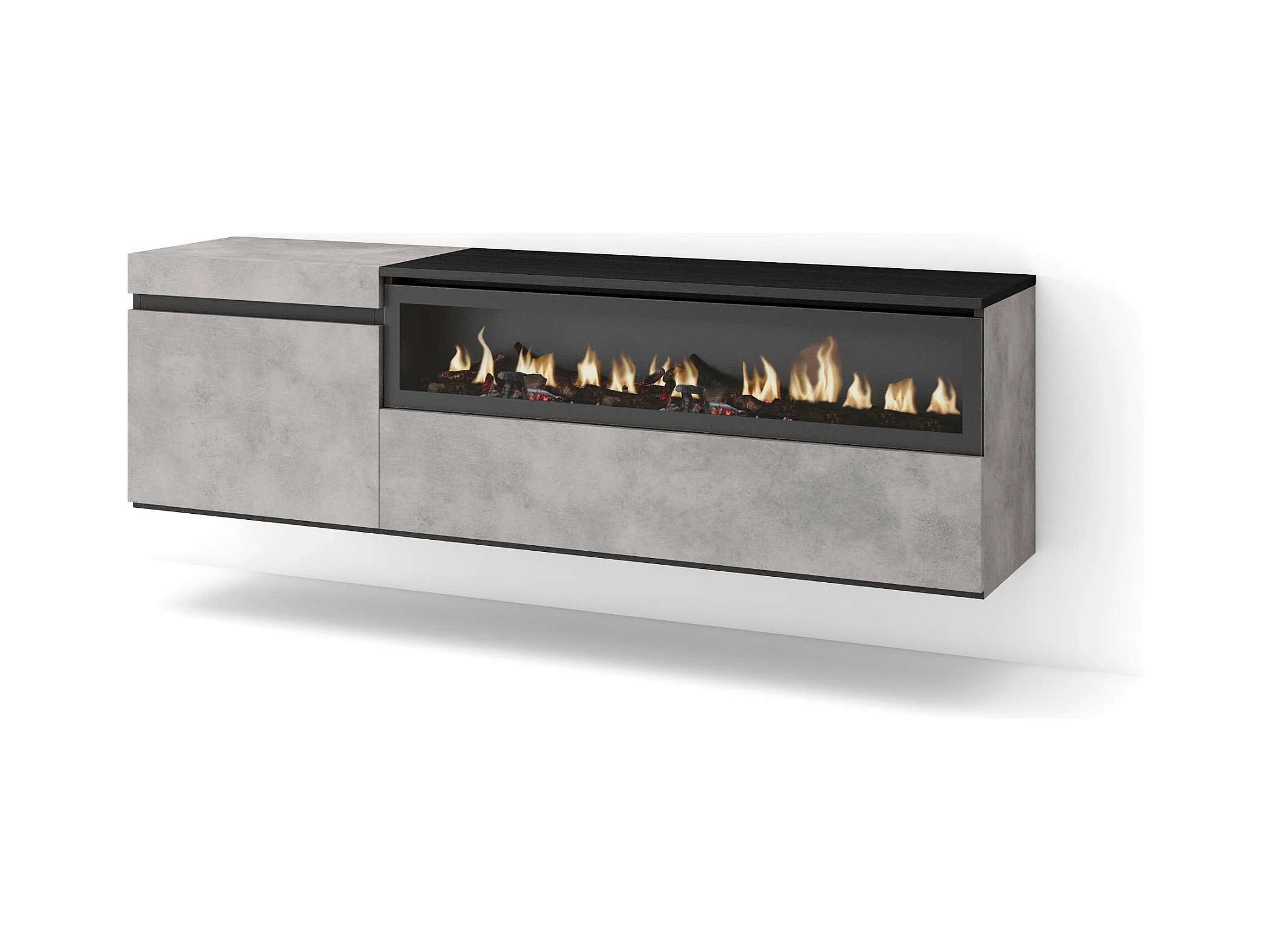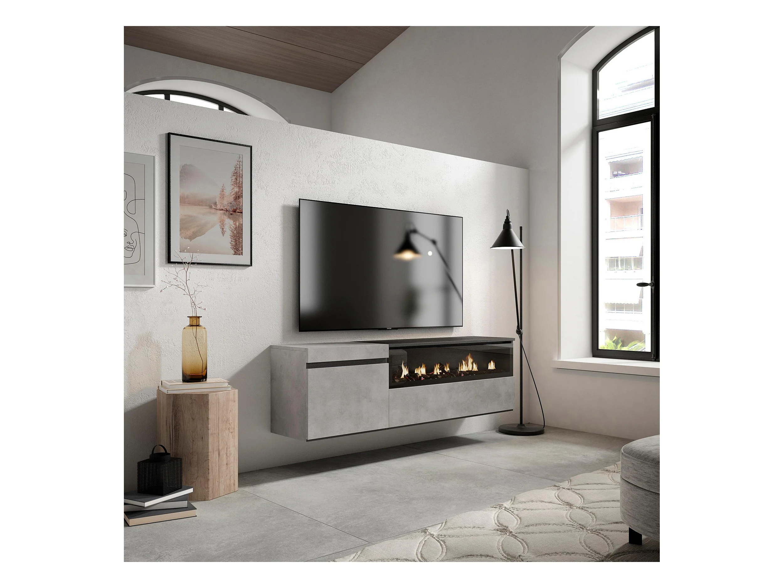 Meuble TV, Banc Télé, 150x35x45cm, Pour les TV jusqu'à 65", Cheminée électrique, Suspendu, Mural, Ciment