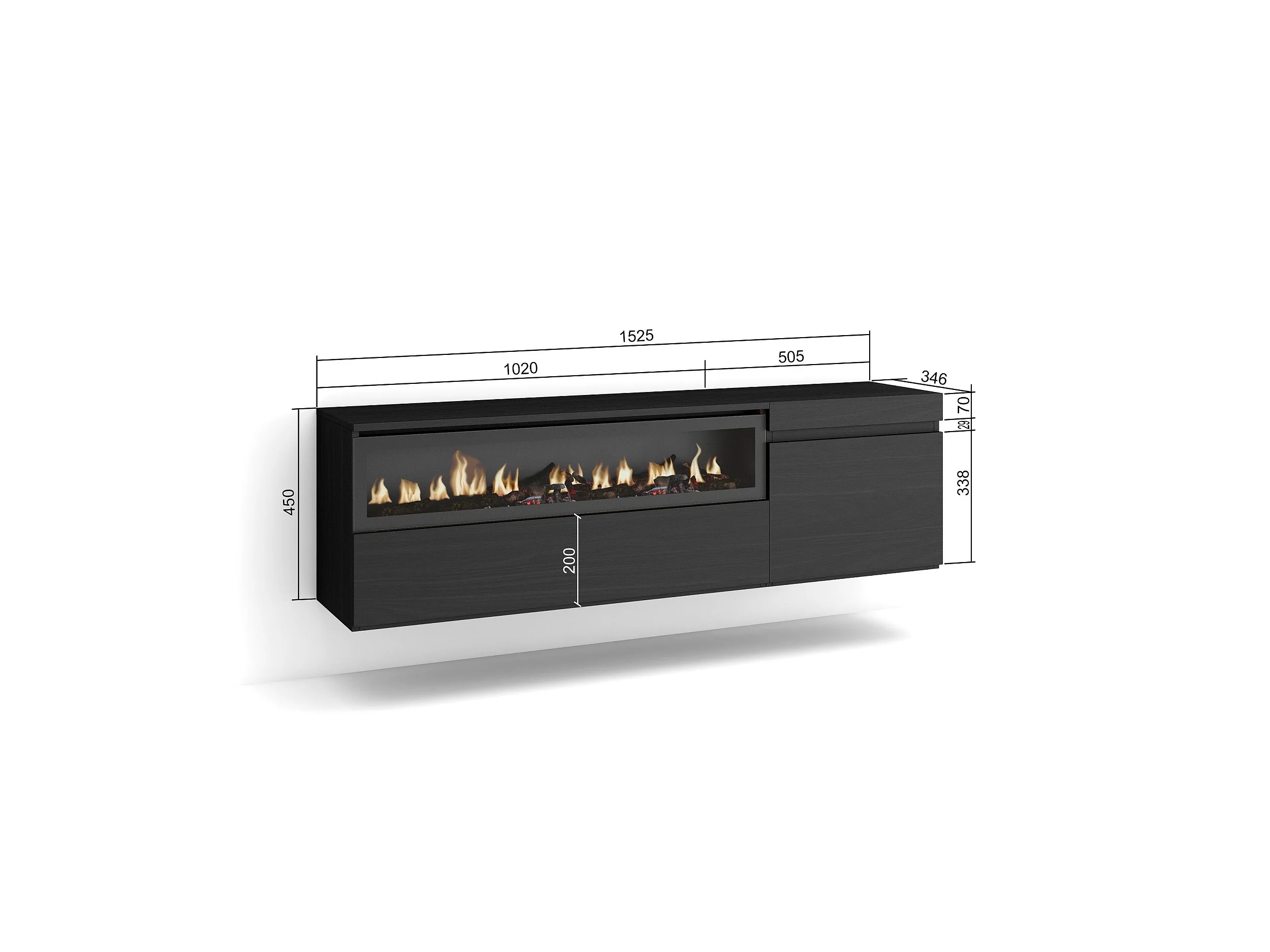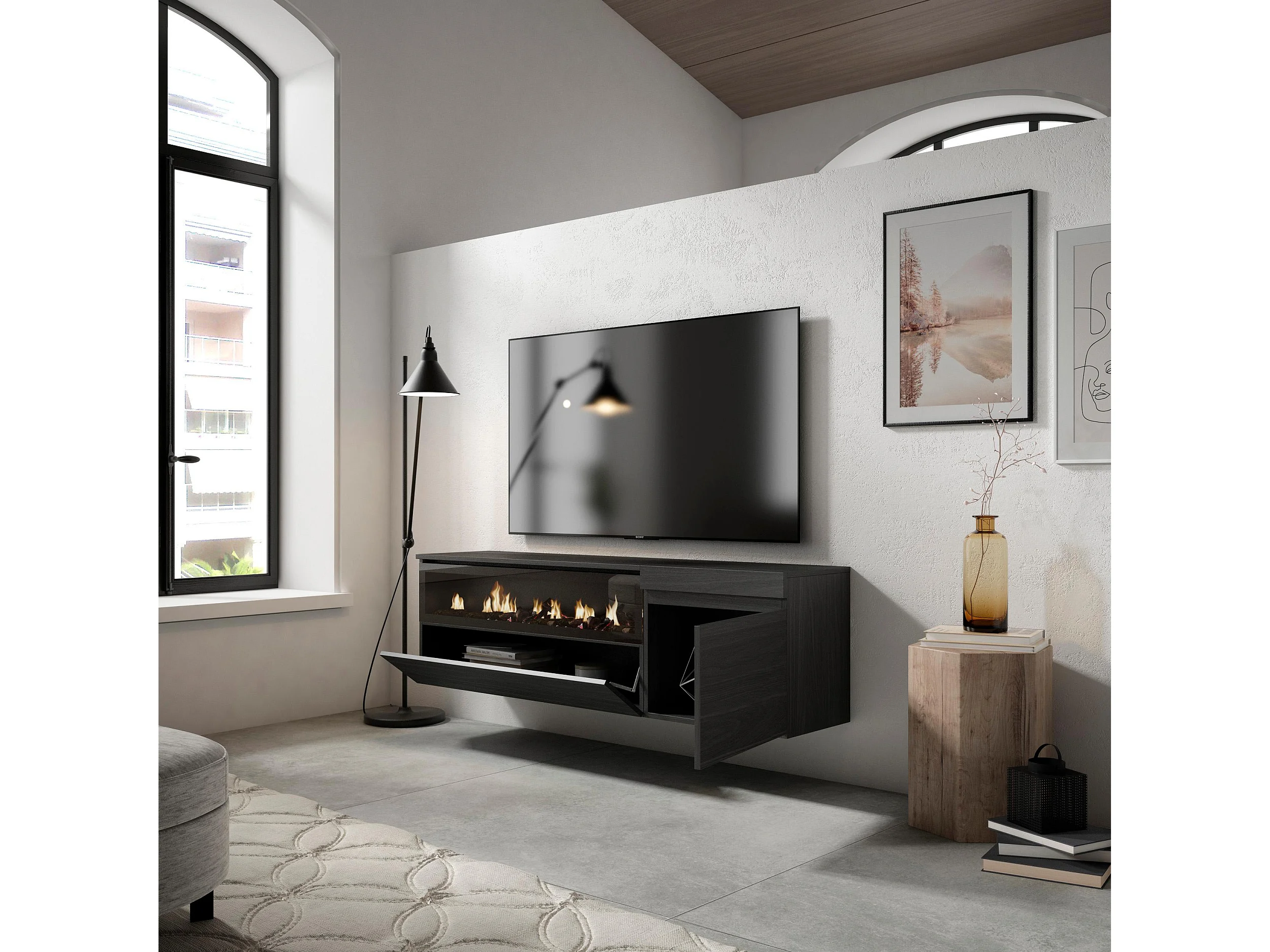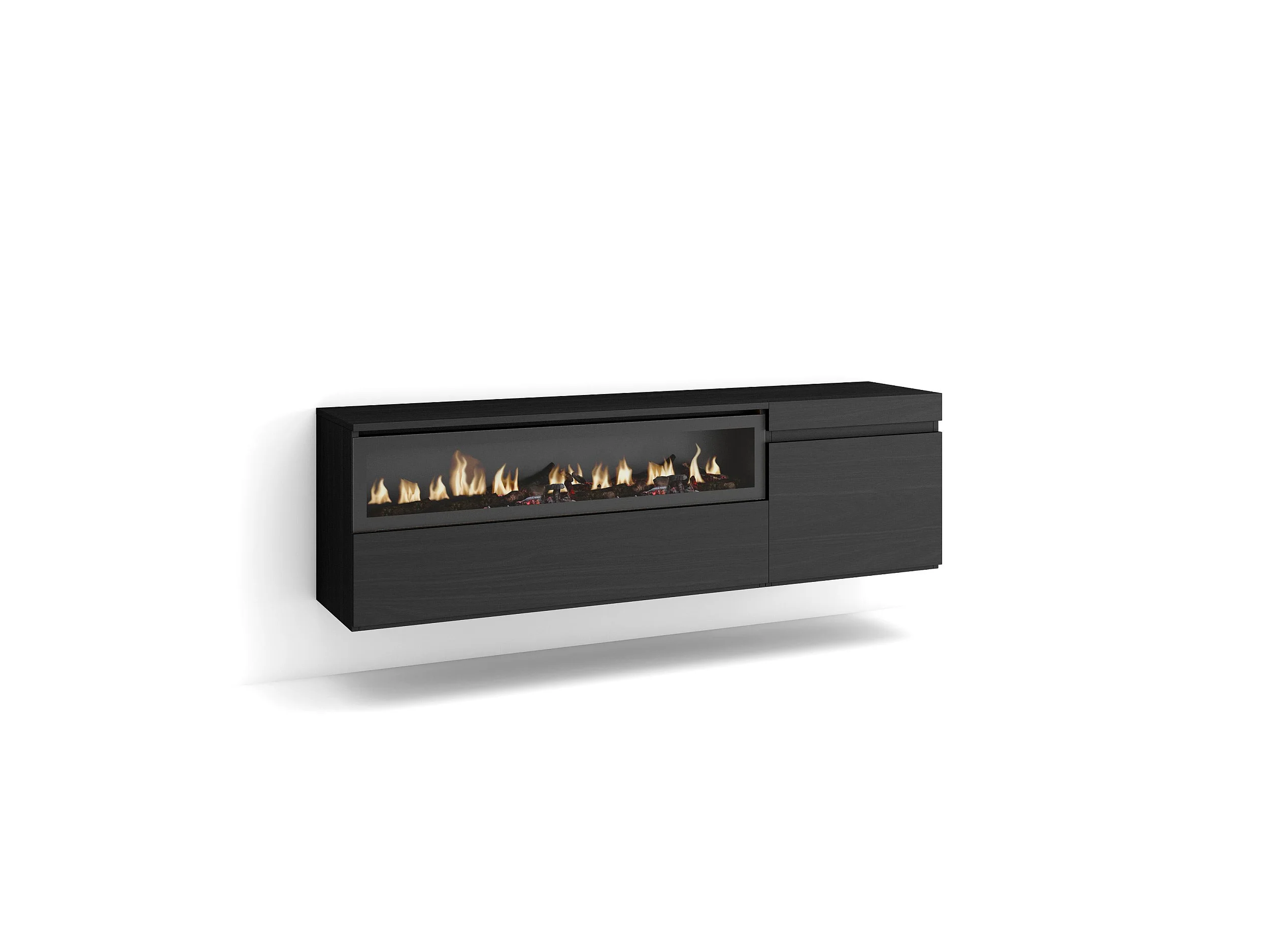 Meuble TV, Banc Télé, 150x35x45cm, Pour les TV jusqu'à 65", Cheminée électrique, Suspendu, Mural, Noir