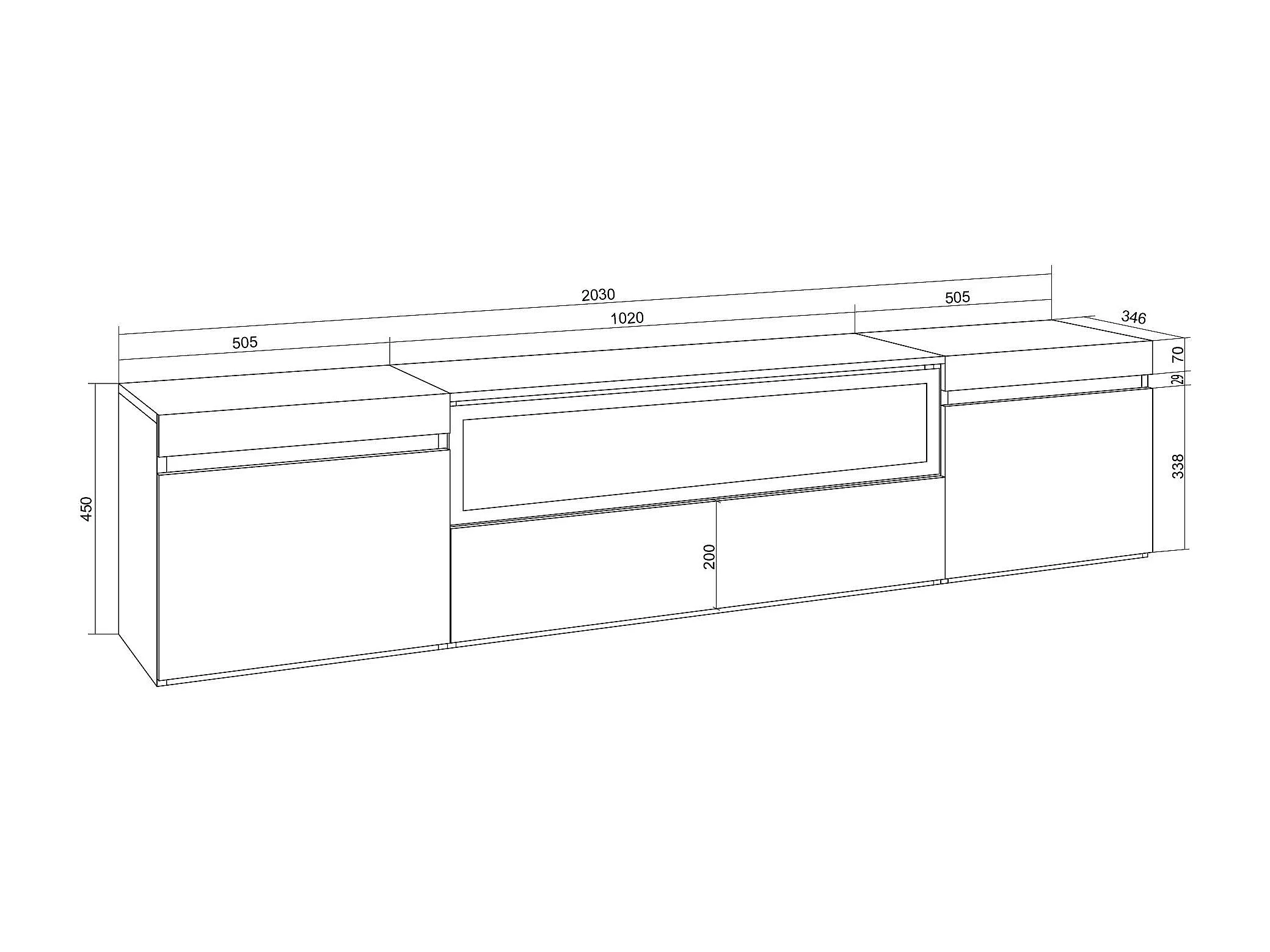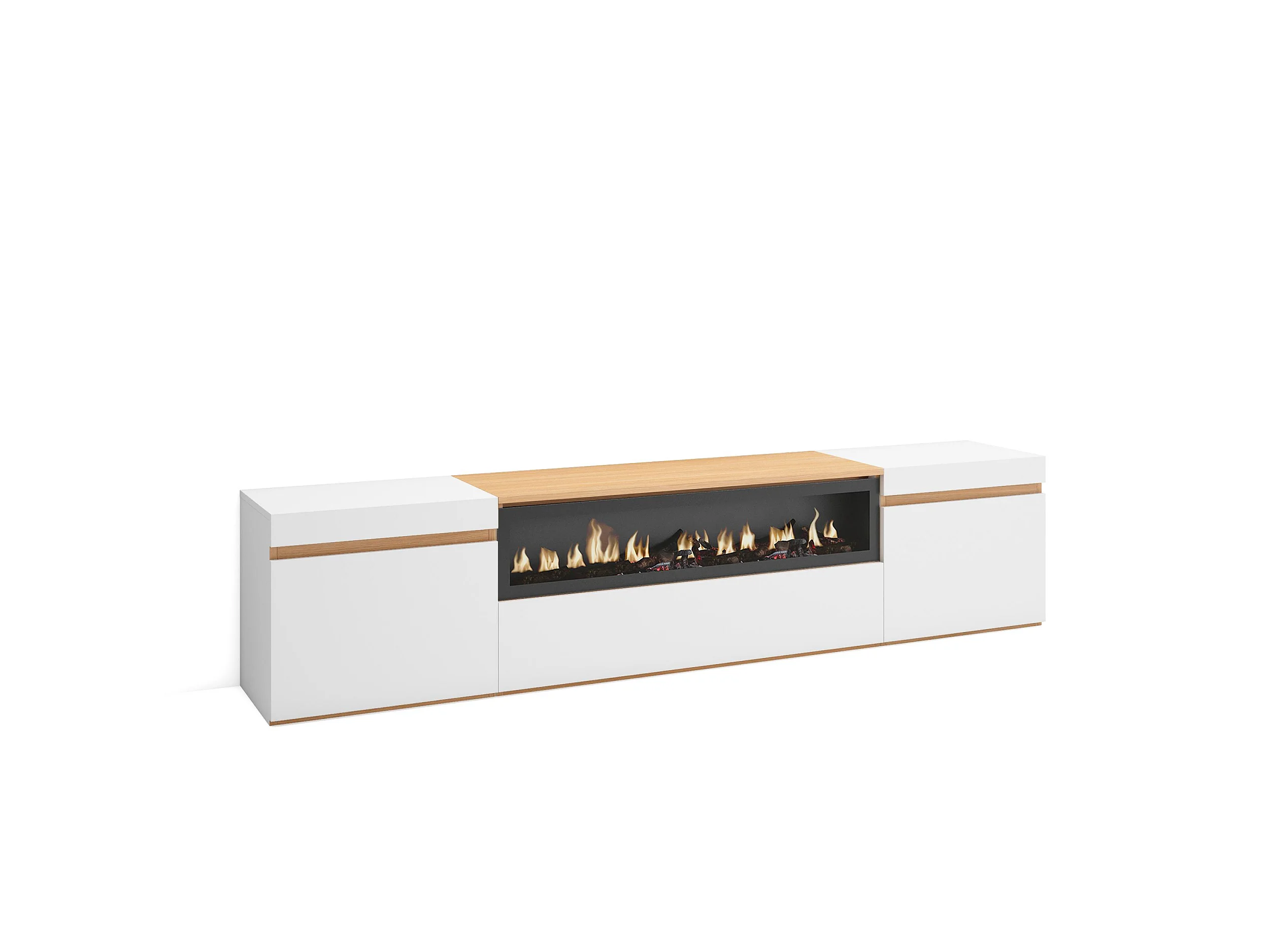 Meuble TV, Banc Télé, 200x35x45cm, Pour les TV jusqu'à 80", Cheminée électrique, Blanc et Chêne Soft