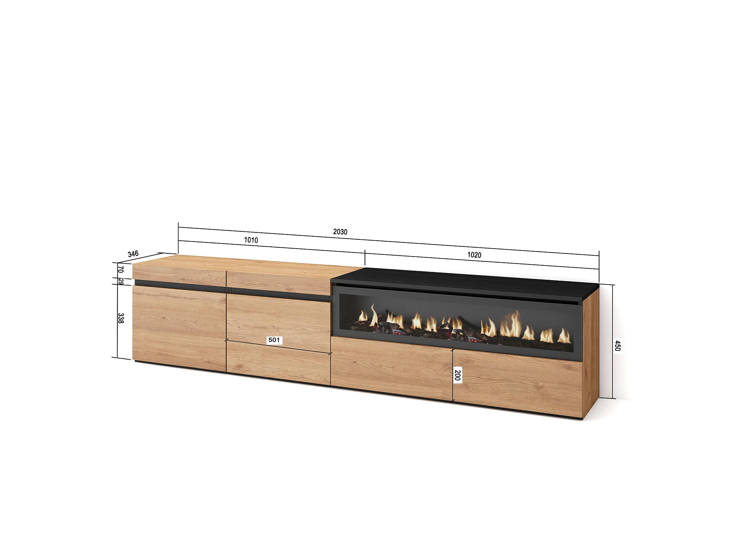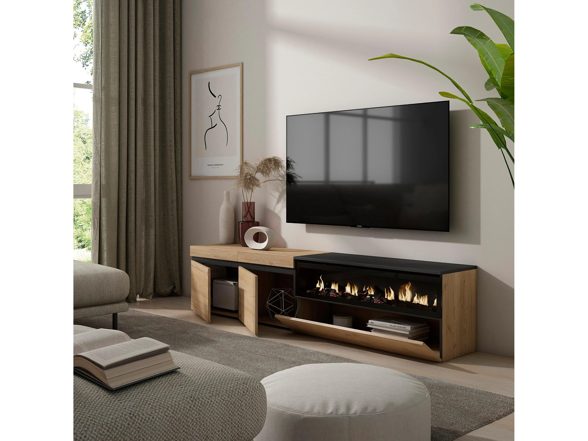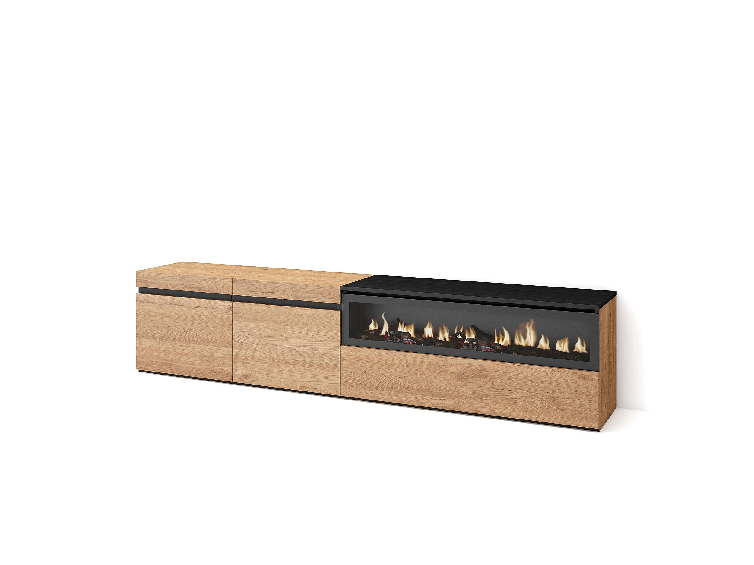 Meuble TV, Banc Télé, 200x35x45cm, Pour les TV jusqu'à 80", Cheminée électrique, Chêne et noir