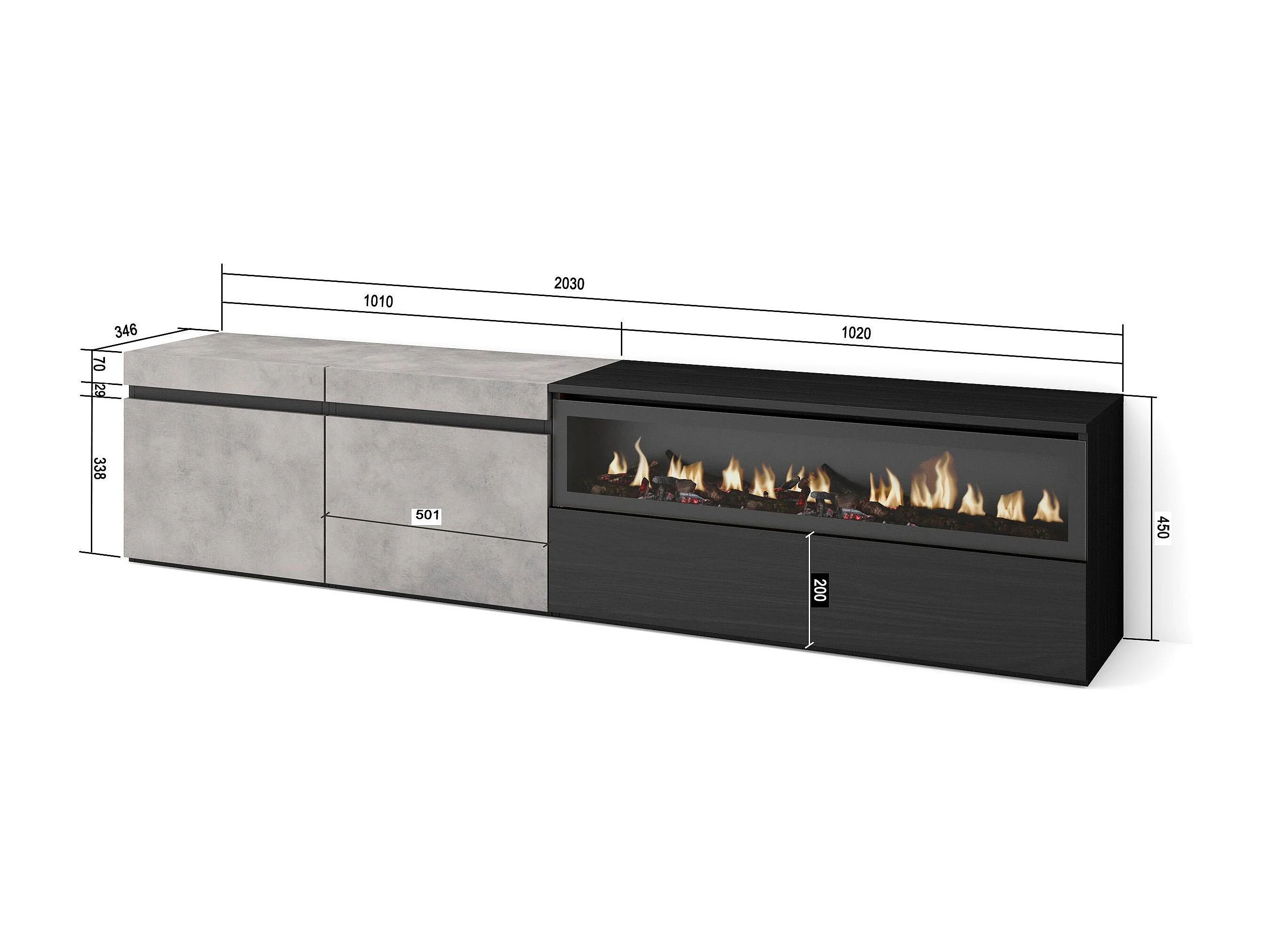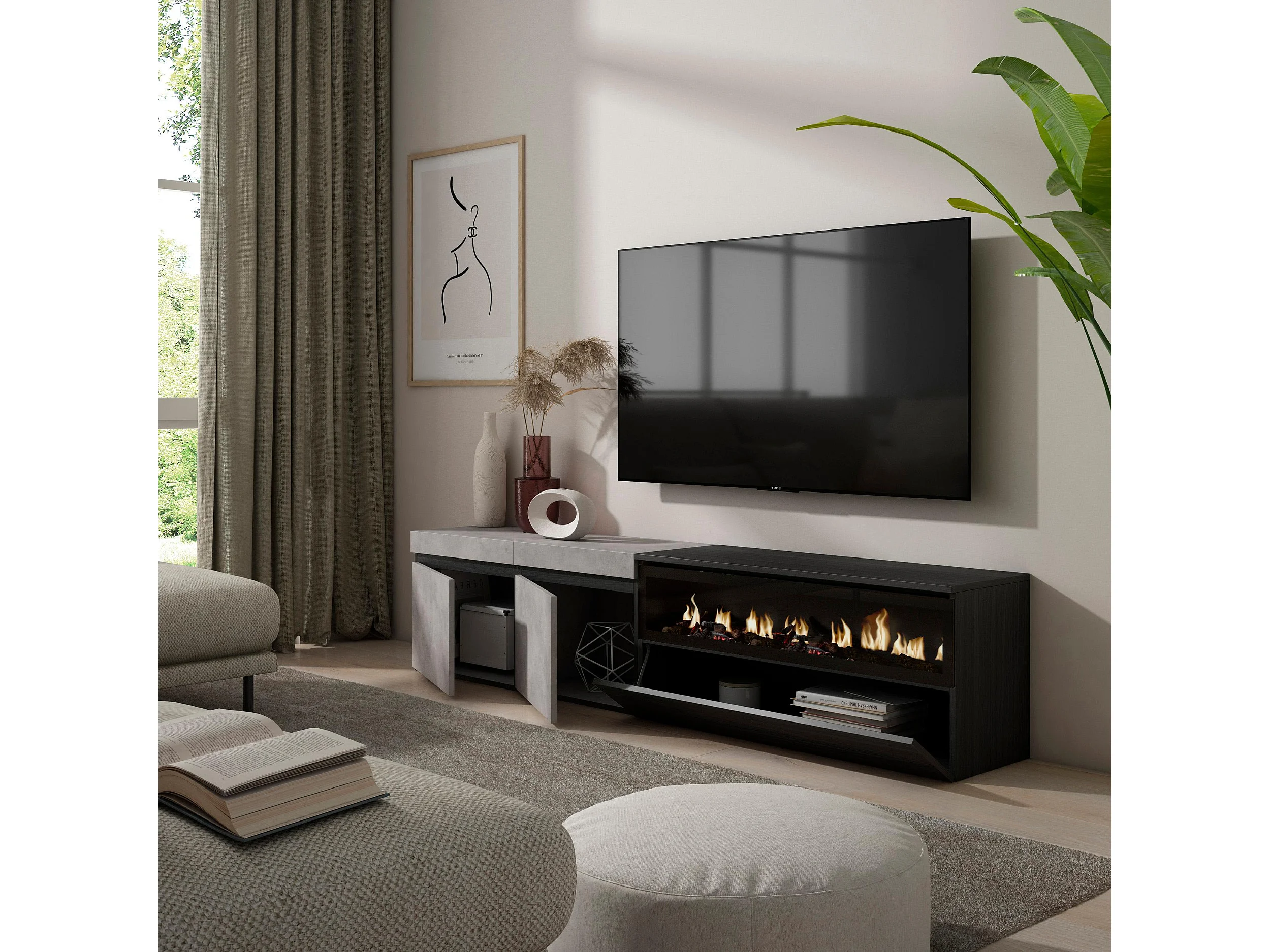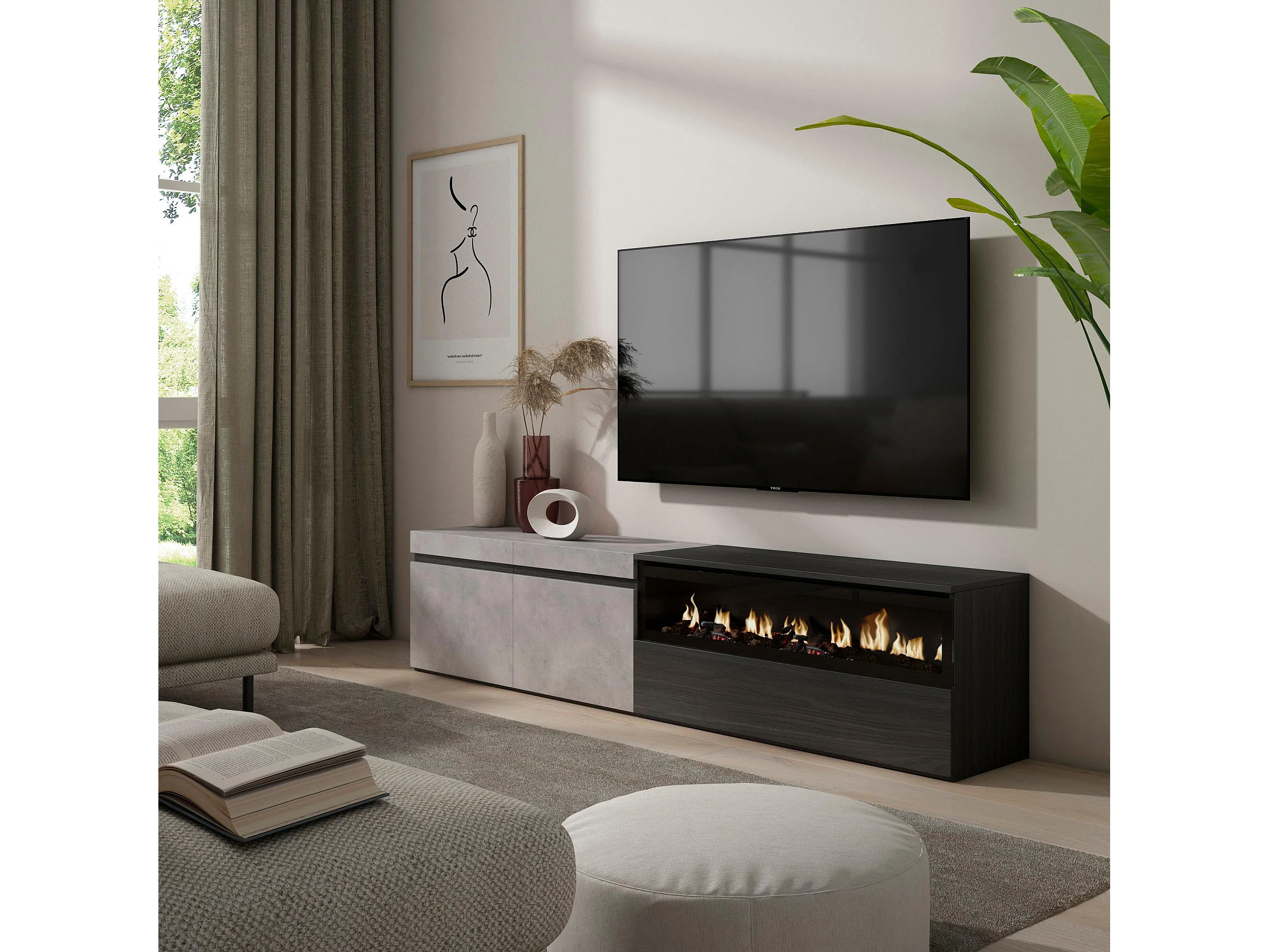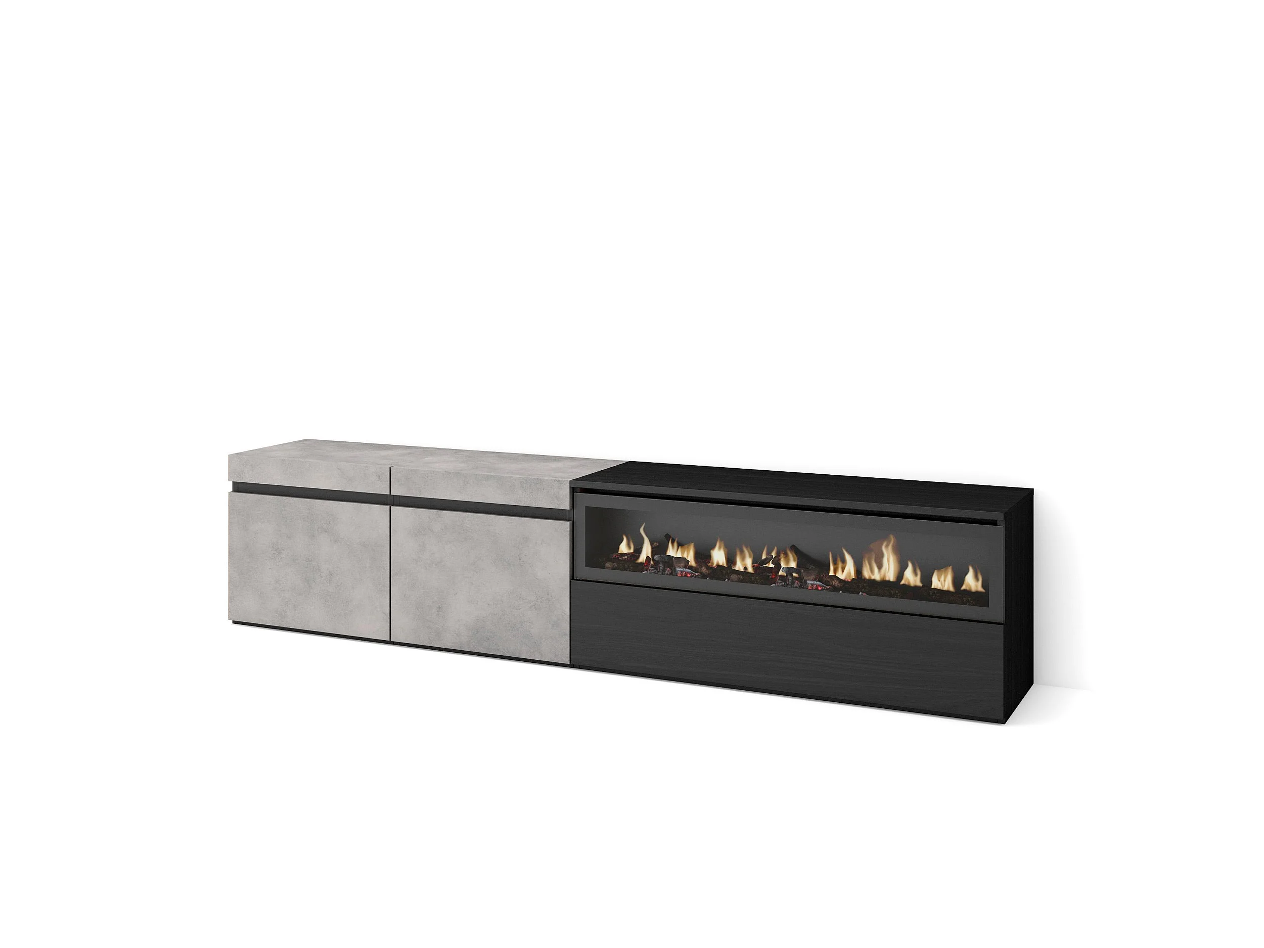 Meuble TV, Banc Télé, 200x35x45cm, Pour les TV jusqu'à 80", Cheminée électrique, Ciment